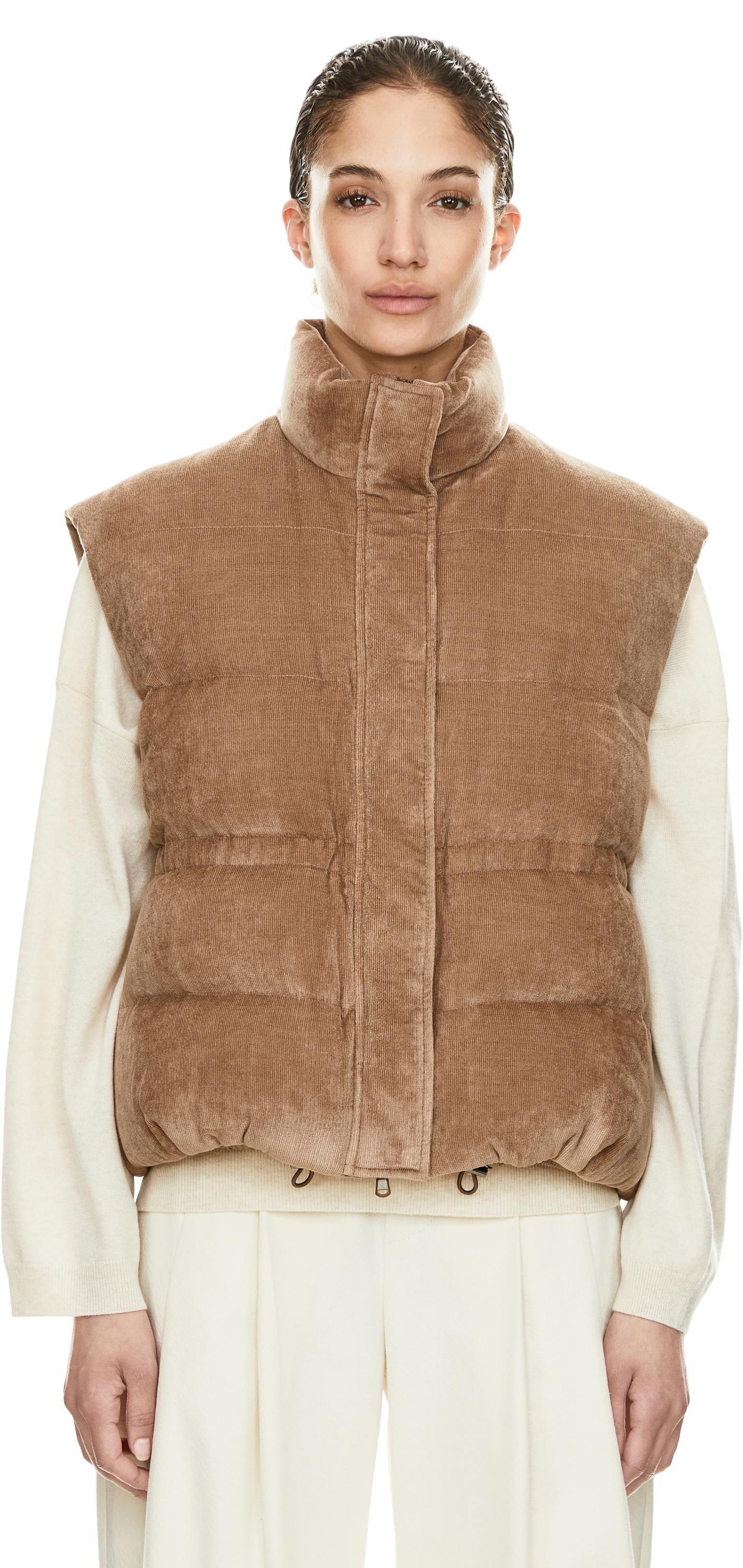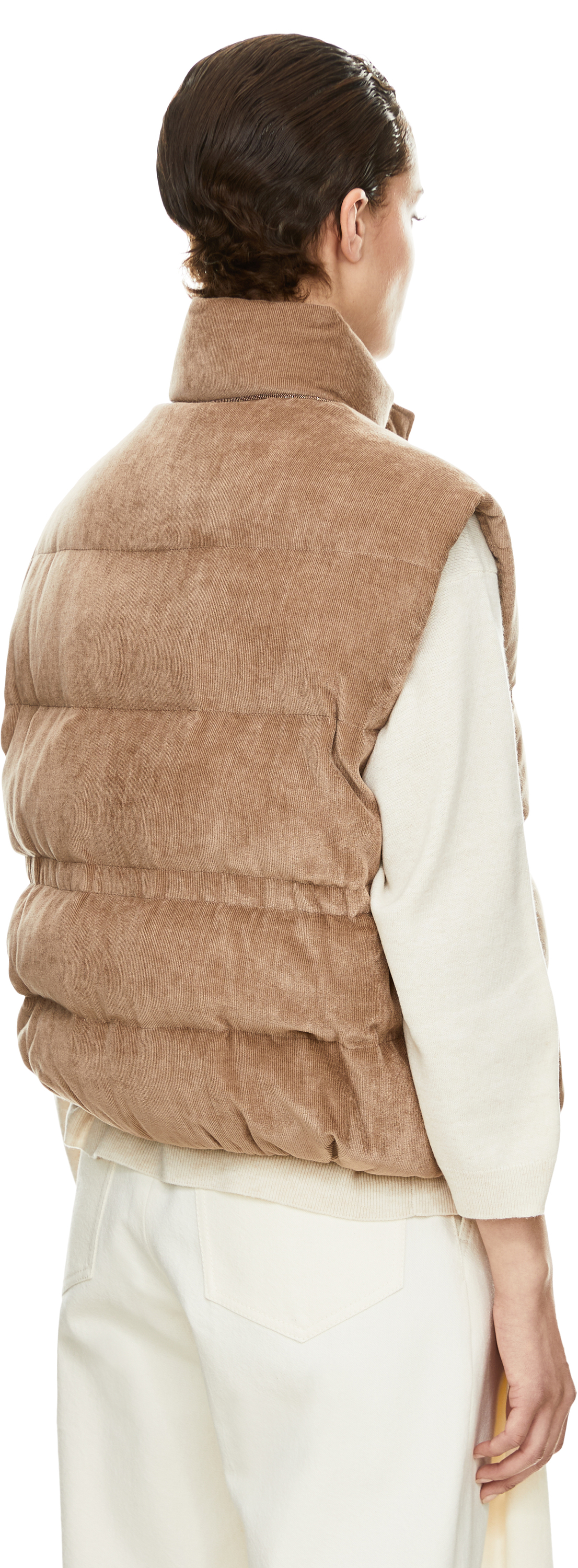 Diese Weste in Hellbraun von Brunello Cucinelli wurde aus einer Viskose-Cashmere-Mischung gefertigt und mit Daunen und Federn gefüllt und besticht durch die feine Cord-Optik. Der verdeckte Druckknopfverschluss und der Zwei-Wege-Reißverschluss verbinden Funktionalität mit stilvoller Präzision, während innenliegende Kordelzüge an Taille und Saum eine individuell anpassbare Silhouette ermöglichen. Der ikonische Monili-Besatz am hinteren Kragen setzt einen subtilen Akzent und veredelt das Design auf stilvolle Weise.