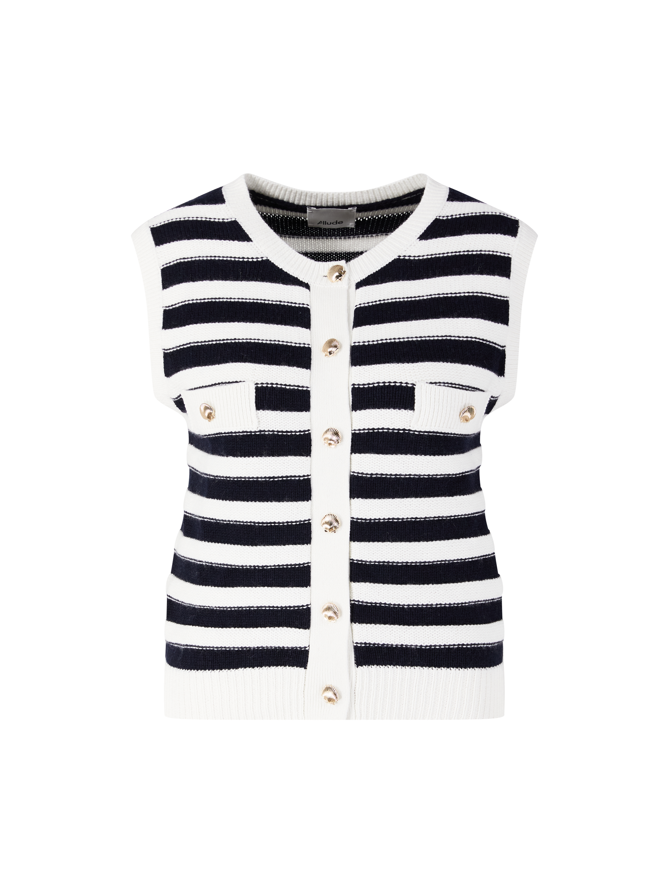 Diese Weste in Marineblau von Allude wurde aus einer Baumwoll-Cashmere-Mischung gefertigt und besticht durch die weite Passform. Die maritime Optik, die einreihigen muschelförmigen goldfarbenen Knöpfe sowie der Rundhalsausschnitt zeichnen dieses Modell aus. Die zwei Pattentaschen runden dieses Design stilvoll ab.