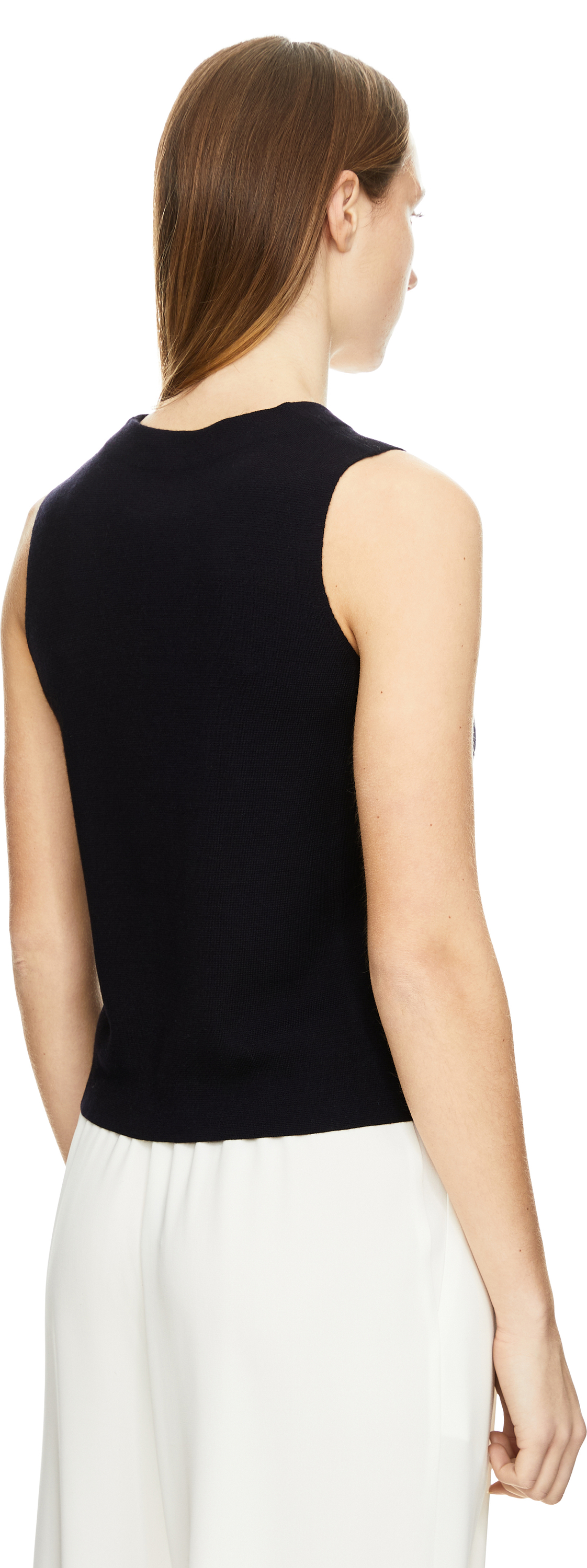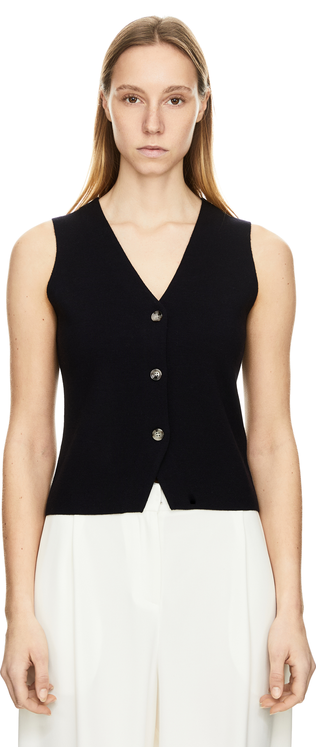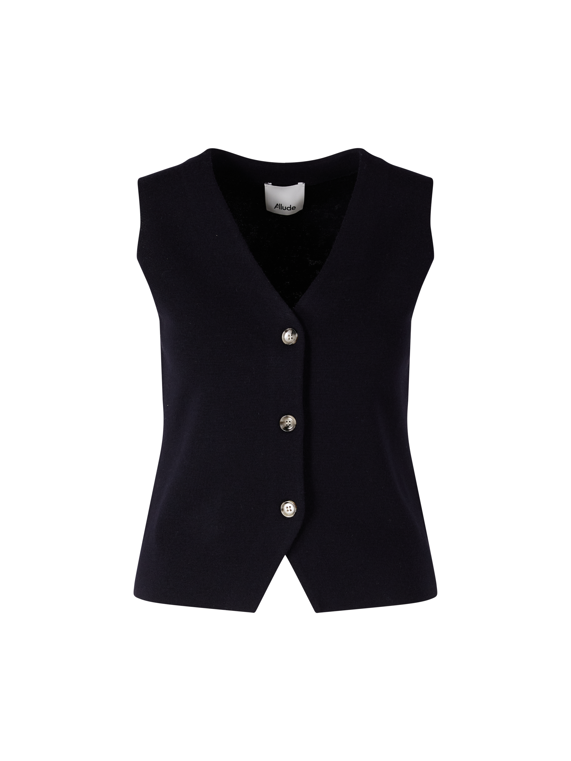Diese Weste in Marineblau von Allude wurde aus reiner Schurwolle gefertigt und besticht durch ihre taillierte Silhouette. Die durchgehende Knopfleiste, der V-Ausschnitt und die weiche Haptik zeichnen dieses Design aus.