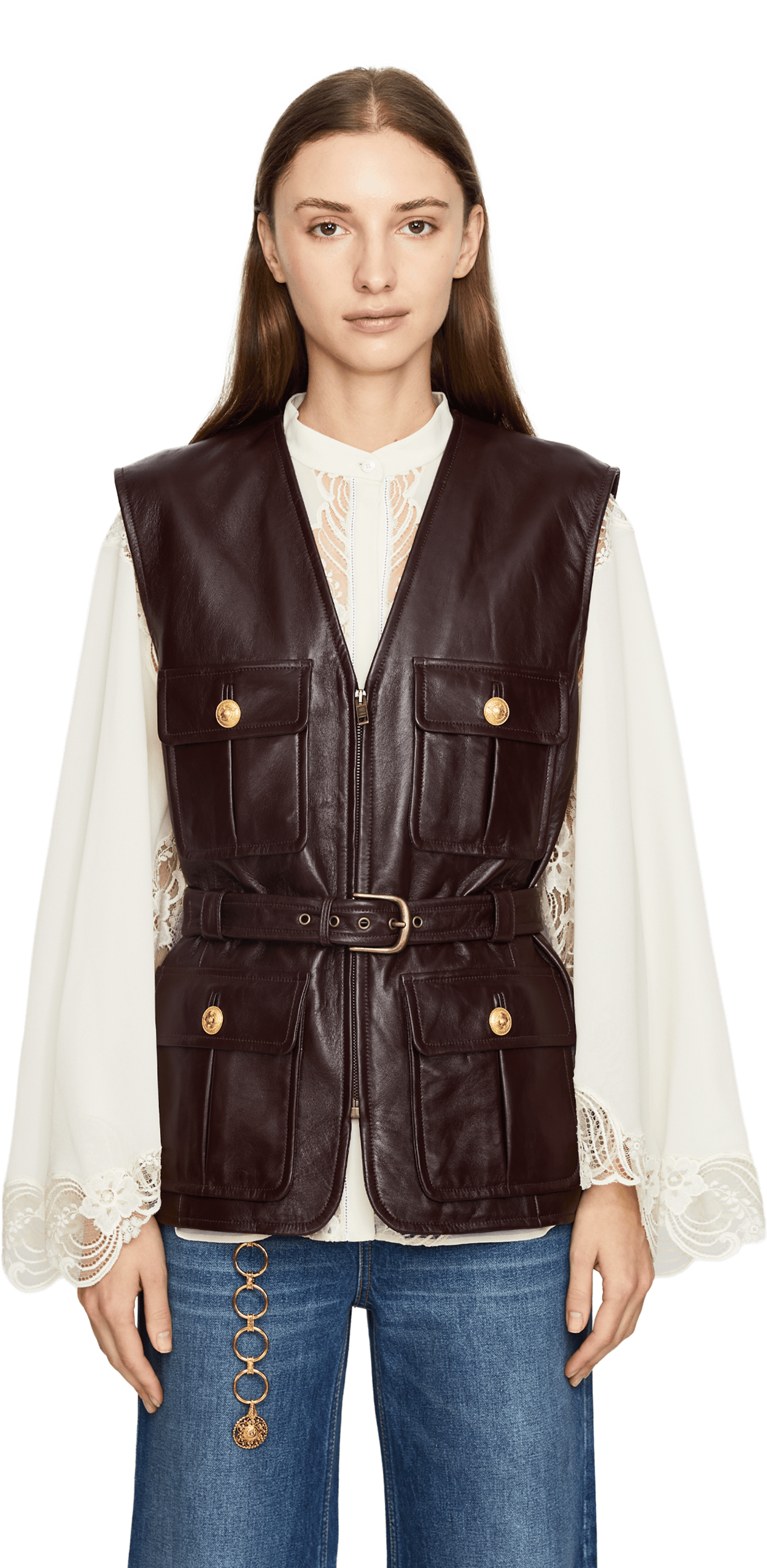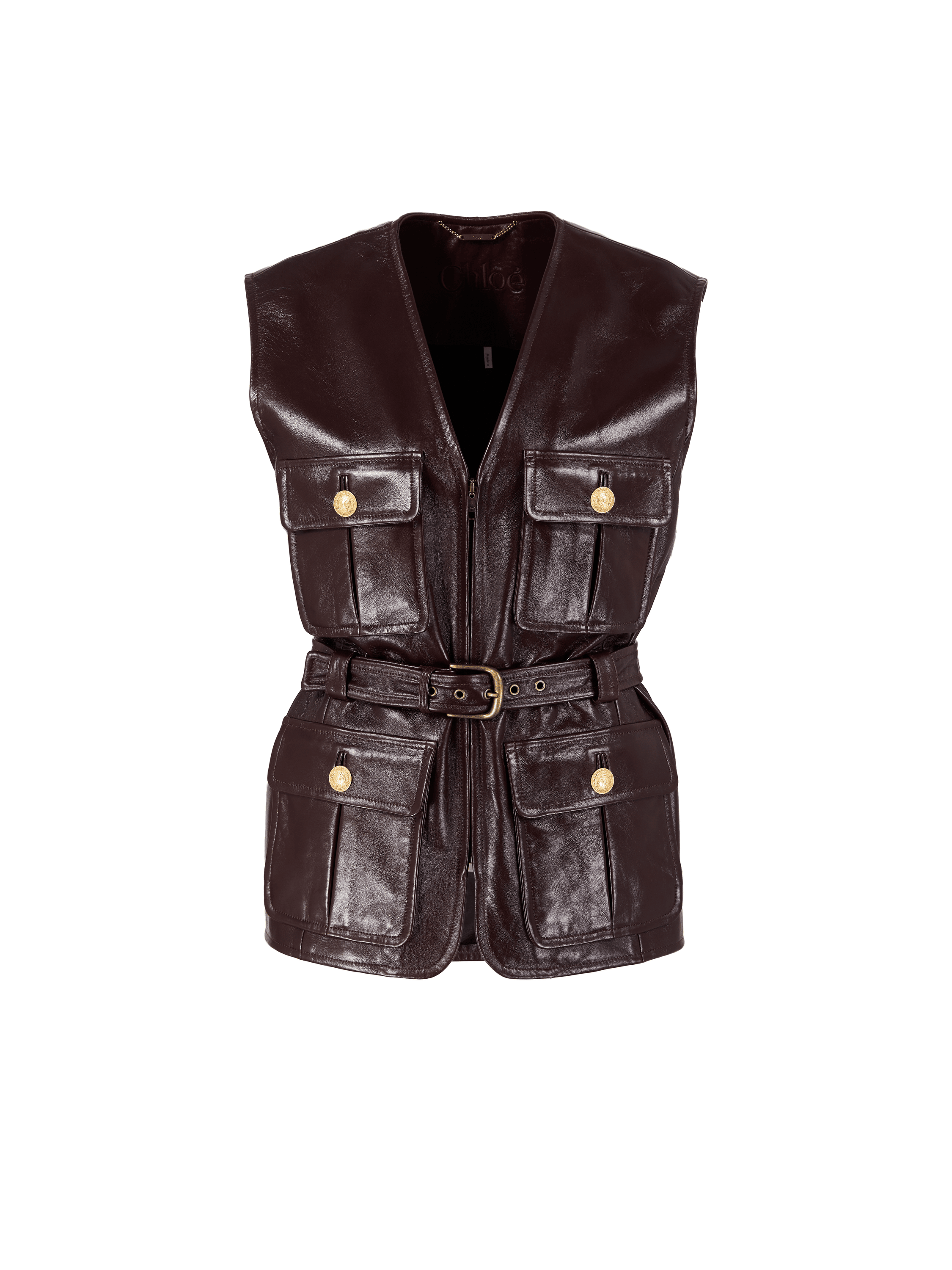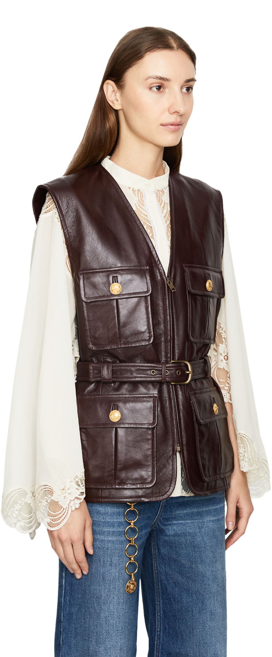 Diese Weste in Bordeaux von Chloé wurde aus weichem Lammleder gefertigt und besticht durch die Blasebalgtaschen und goldfarbene Militärknöpfe. Der Vorderreißverschluss, der V-Ausschnitt und der Ledergürtel mit Schnalle setzen einen eleganten Akzent.