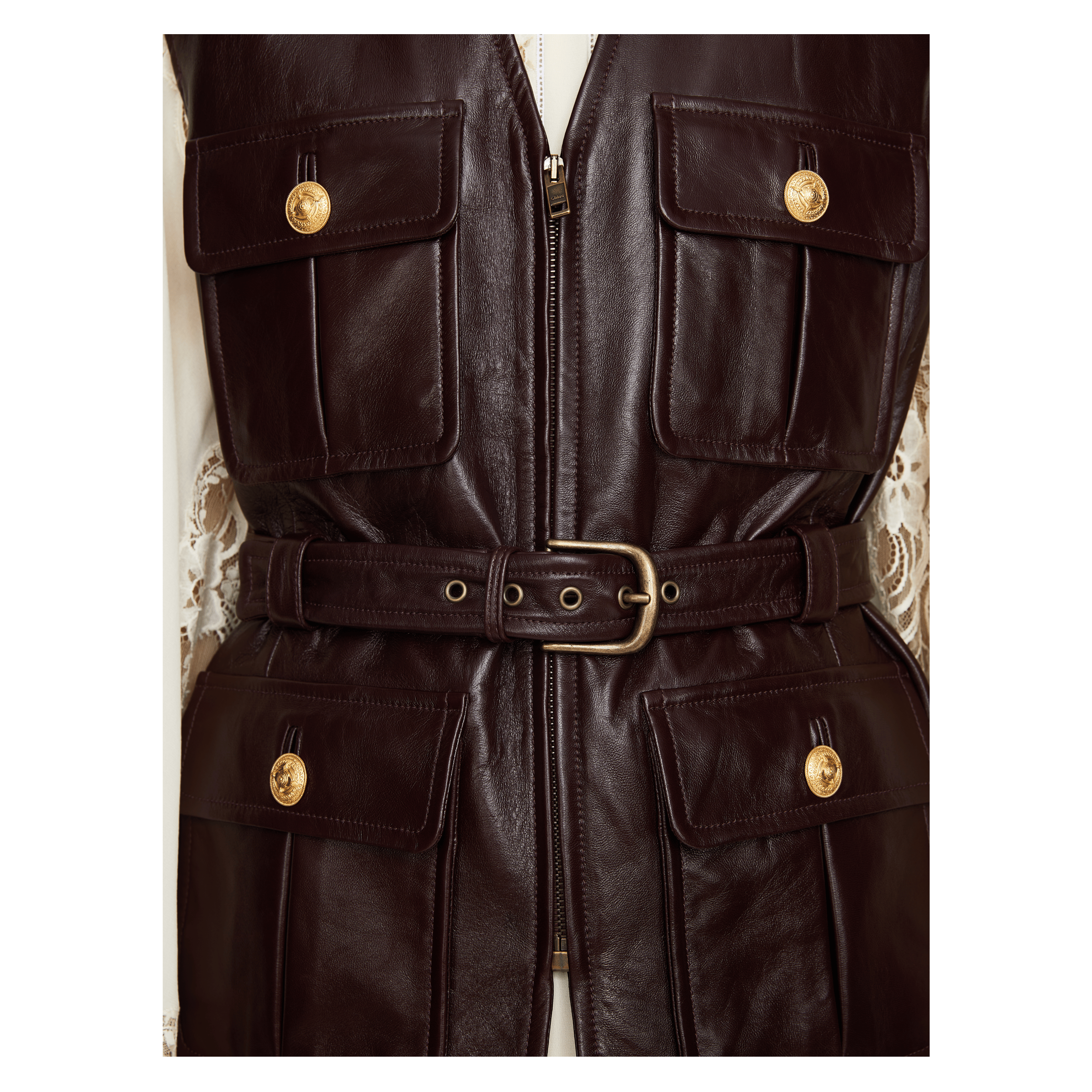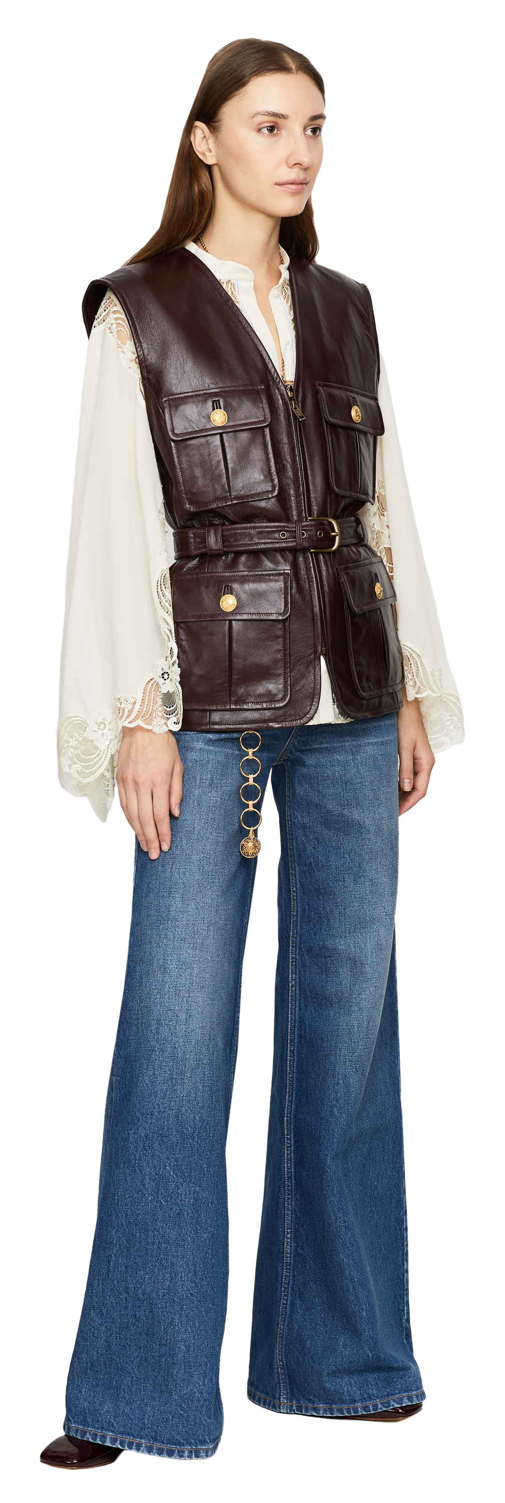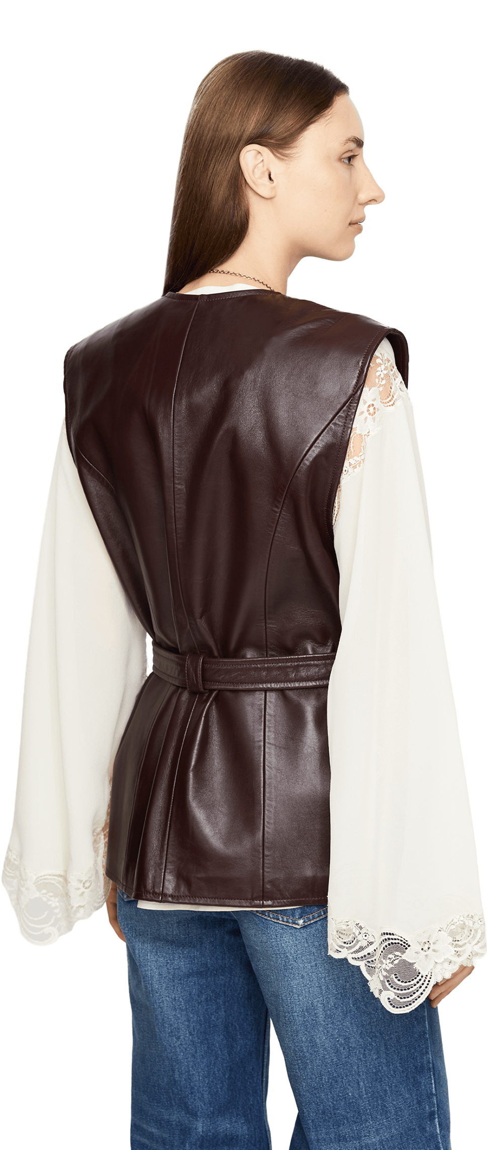 Diese Weste in Bordeaux von Chloé wurde aus weichem Lammleder gefertigt und besticht durch die Blasebalgtaschen und goldfarbene Militärknöpfe. Der Vorderreißverschluss, der V-Ausschnitt und der Ledergürtel mit Schnalle setzen einen eleganten Akzent.