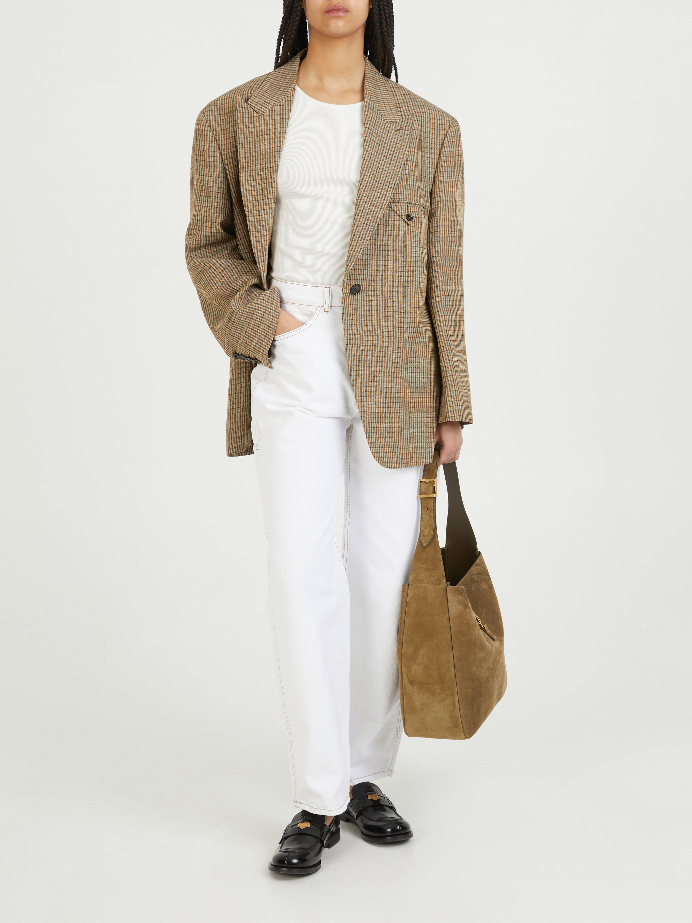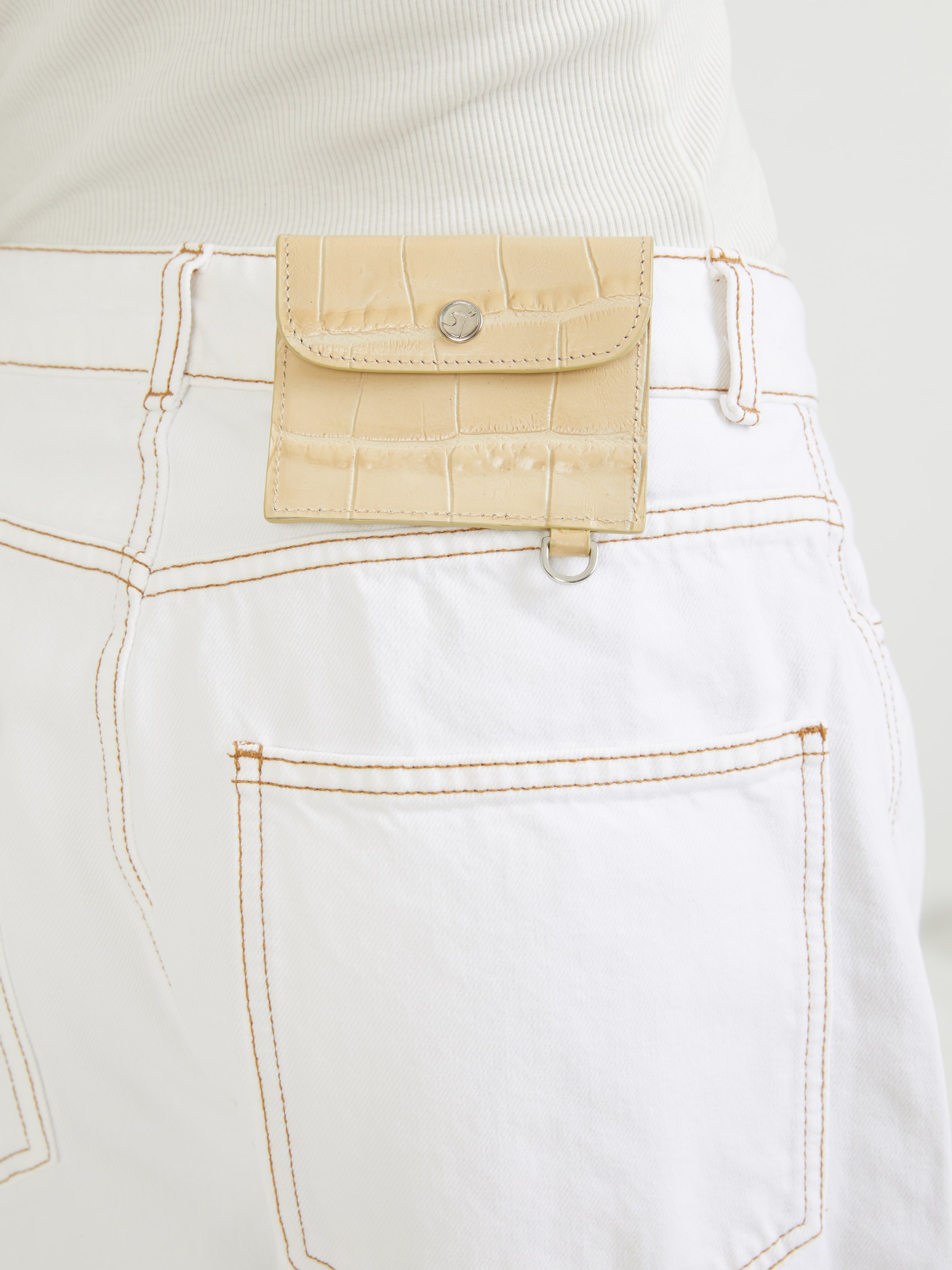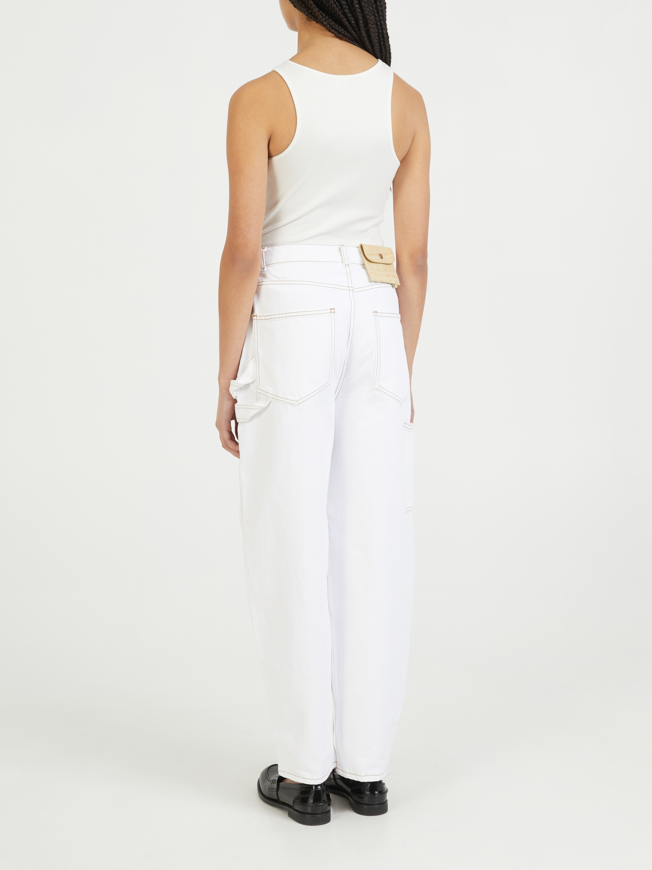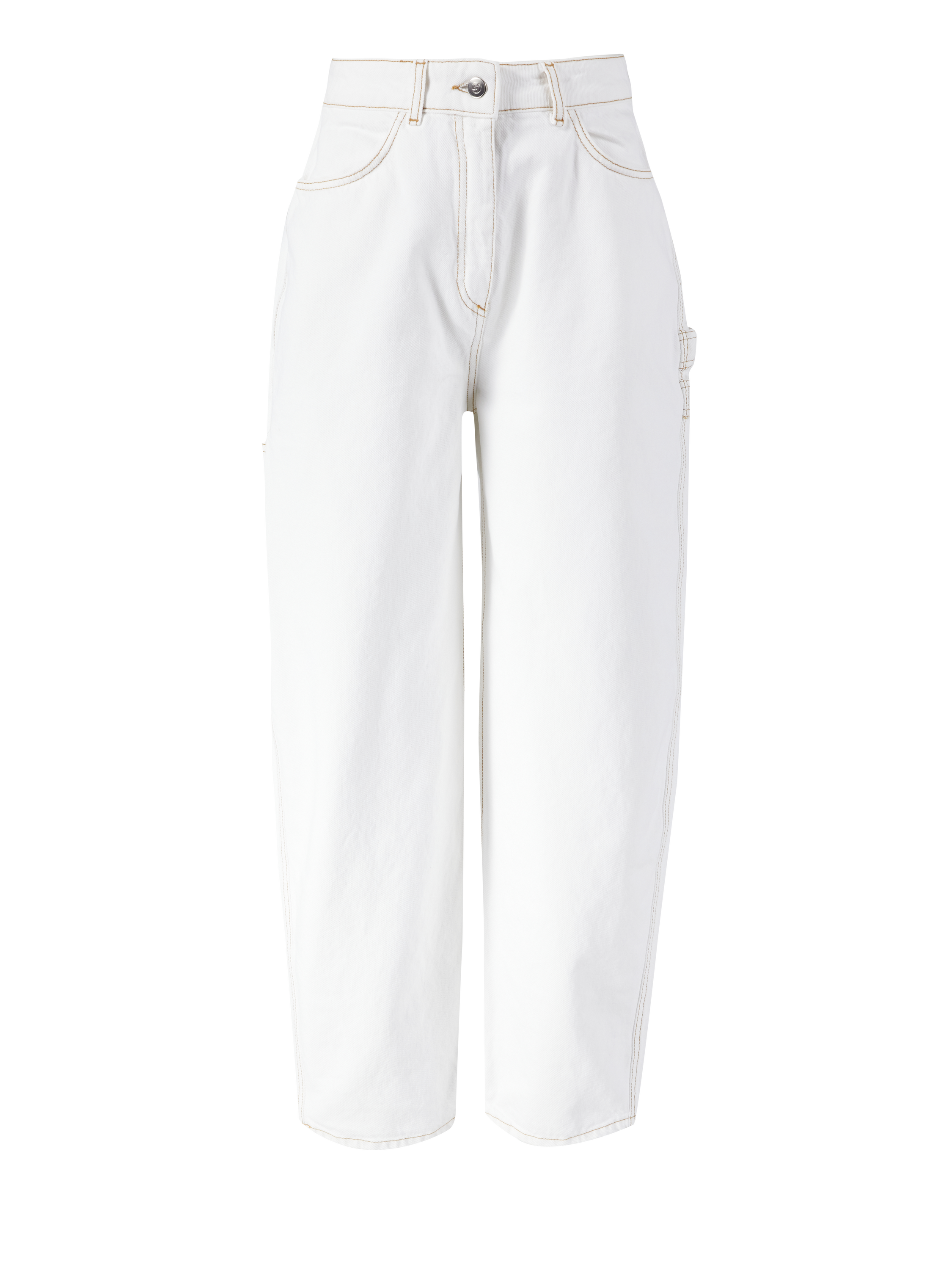 Die Jeans 'Helle' in Weiß von SAKS POTTS wurde aus reiner Baumwolle gefertigt. Das Modell begeistert durch ein voluminöses Bein und einen hohen Bund. Die abnehmbare Tasche auf der Rückseite, die Kontrastnähte und die Schlaufe an der Tasche zeichnen das Modell aus. Die silberfarbene Hardware rundet das Design ab.