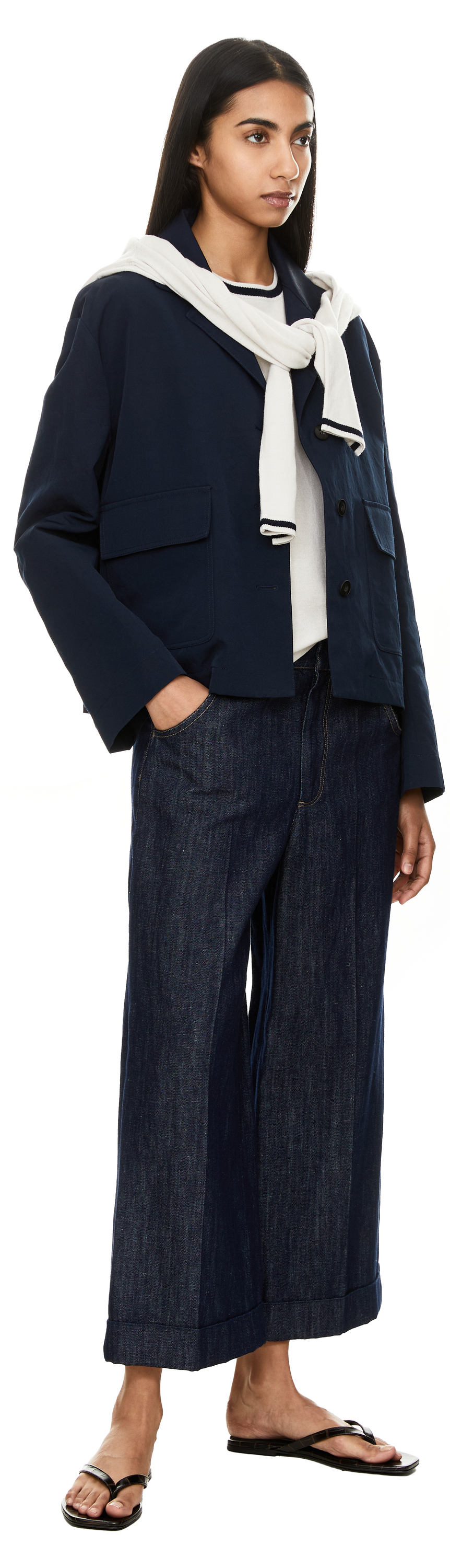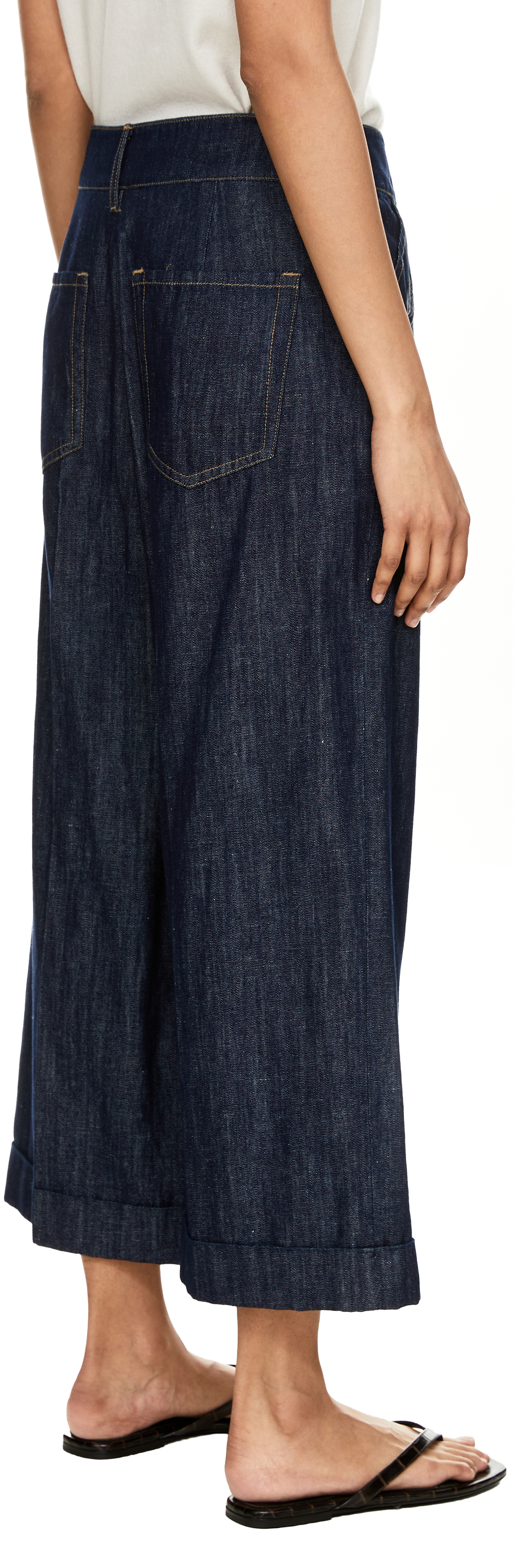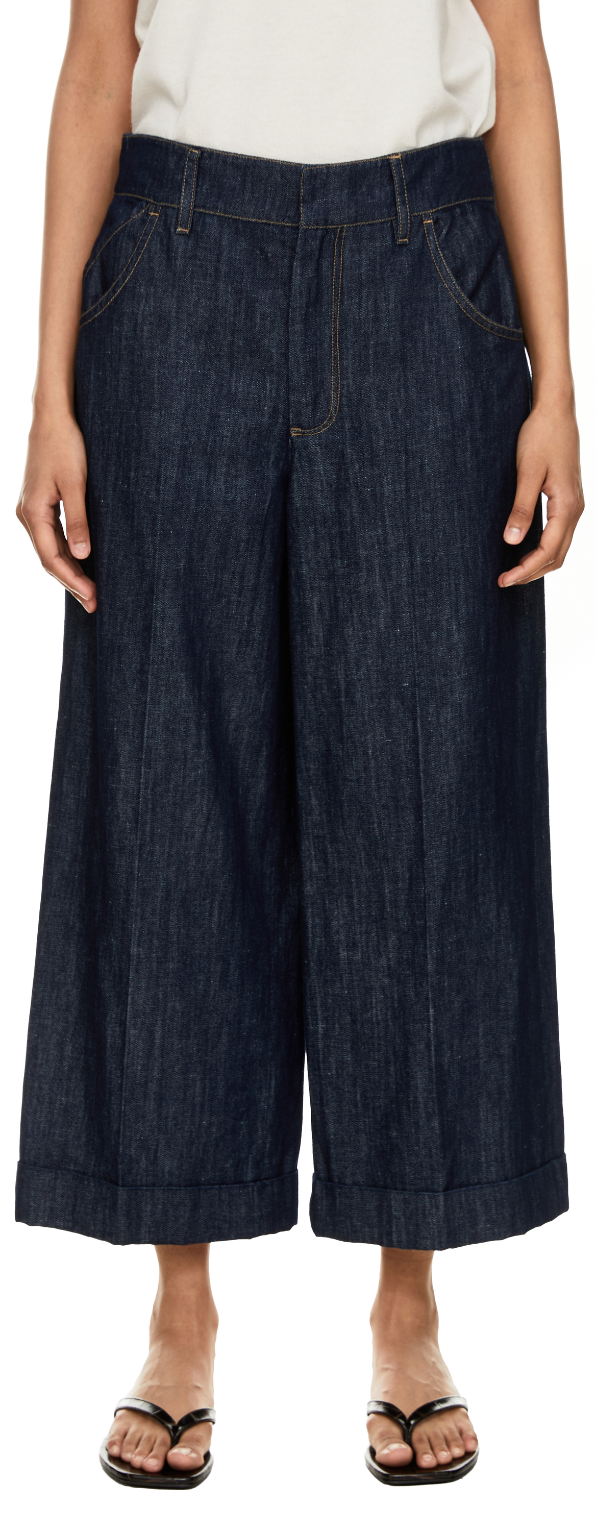 Die Jeans 'Efedra' in Dunkelblau von 'S Max Mara wurde aus einer hochwertigen Baumwoll-Leinenmischung gefertigt und besticht durch das weite, verkürzte Bein. Die Bügelfalten entlang des Beins verleihen dem Modell eine dynamische Struktur. Der umgeschlagene Saum sorgt für einen raffinierten Abschluss und rundet das Design stilvoll ab.