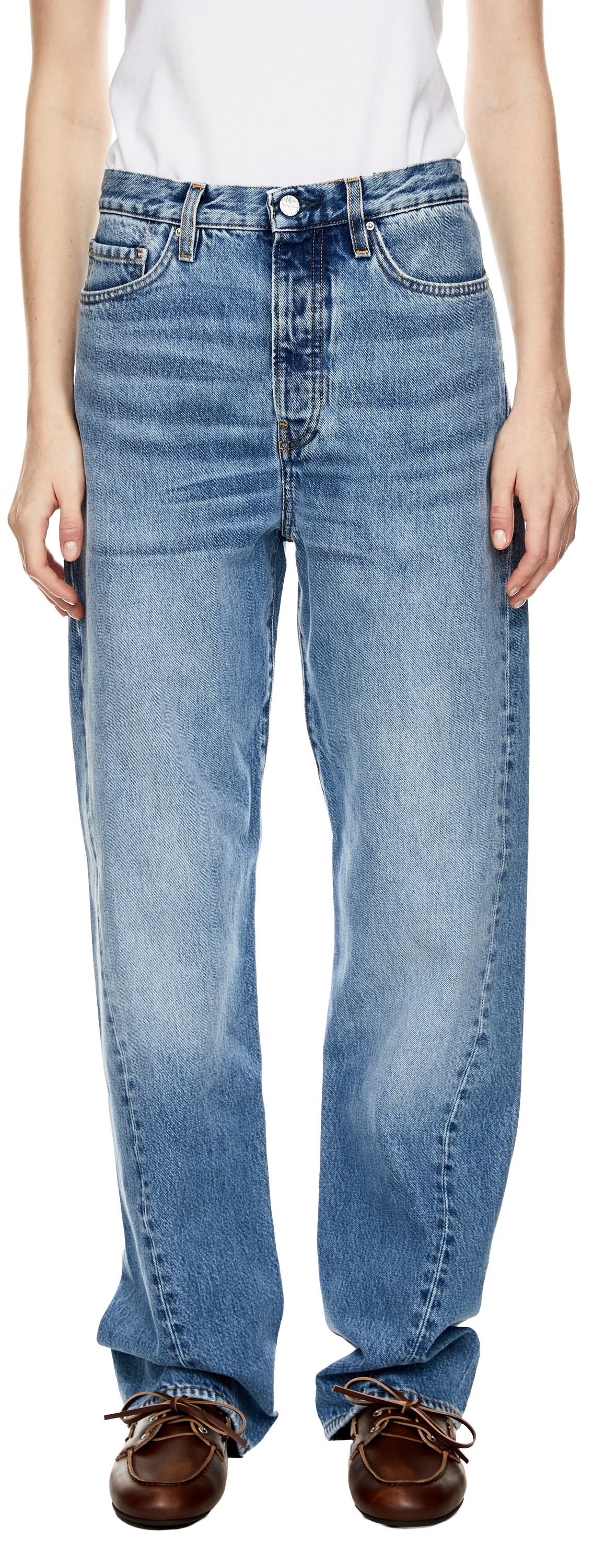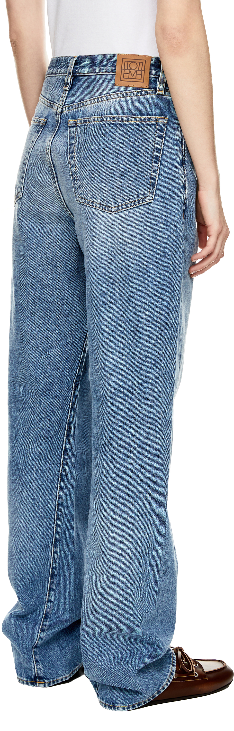 Die Jeans 'Twisted Seam' in Mittelblau von TOTEME wurde aus Baumwolle gefertigt und besticht durch die gerade Passform. Die gebogene Naht, die sich um das Bein windet, die mittlere Leibhöhe sowie der rückseitige Logo-Patch machen dieses Design zu einem stilvollen Hingucker.