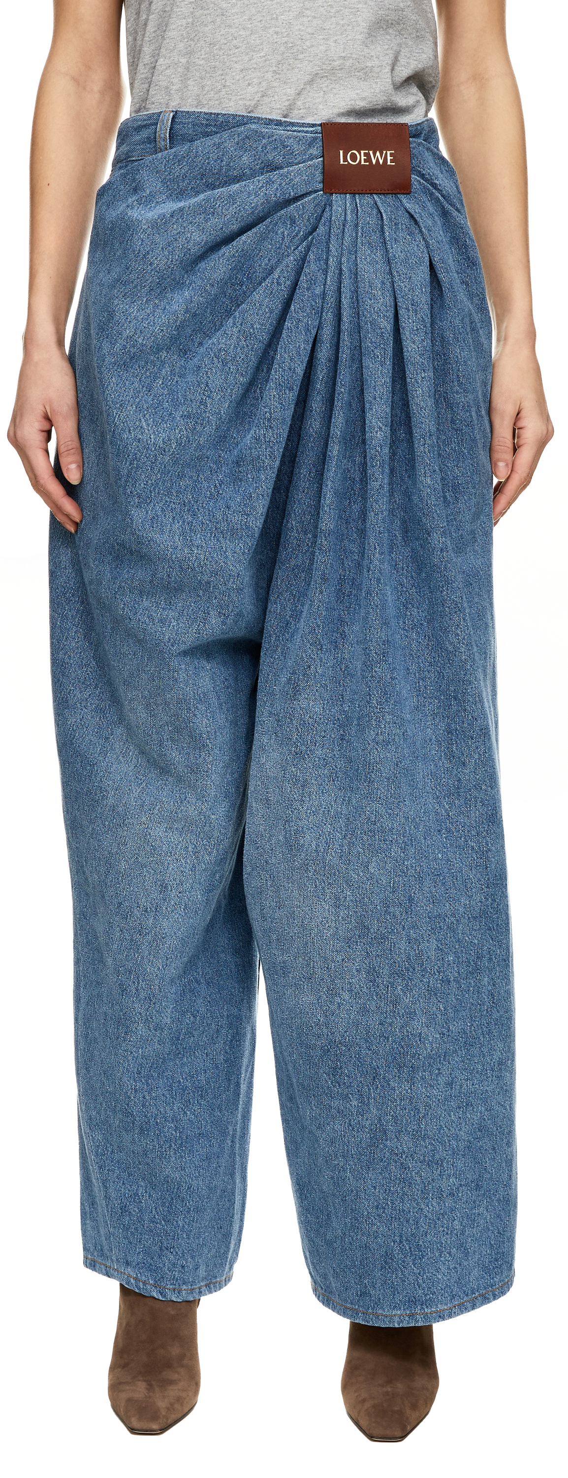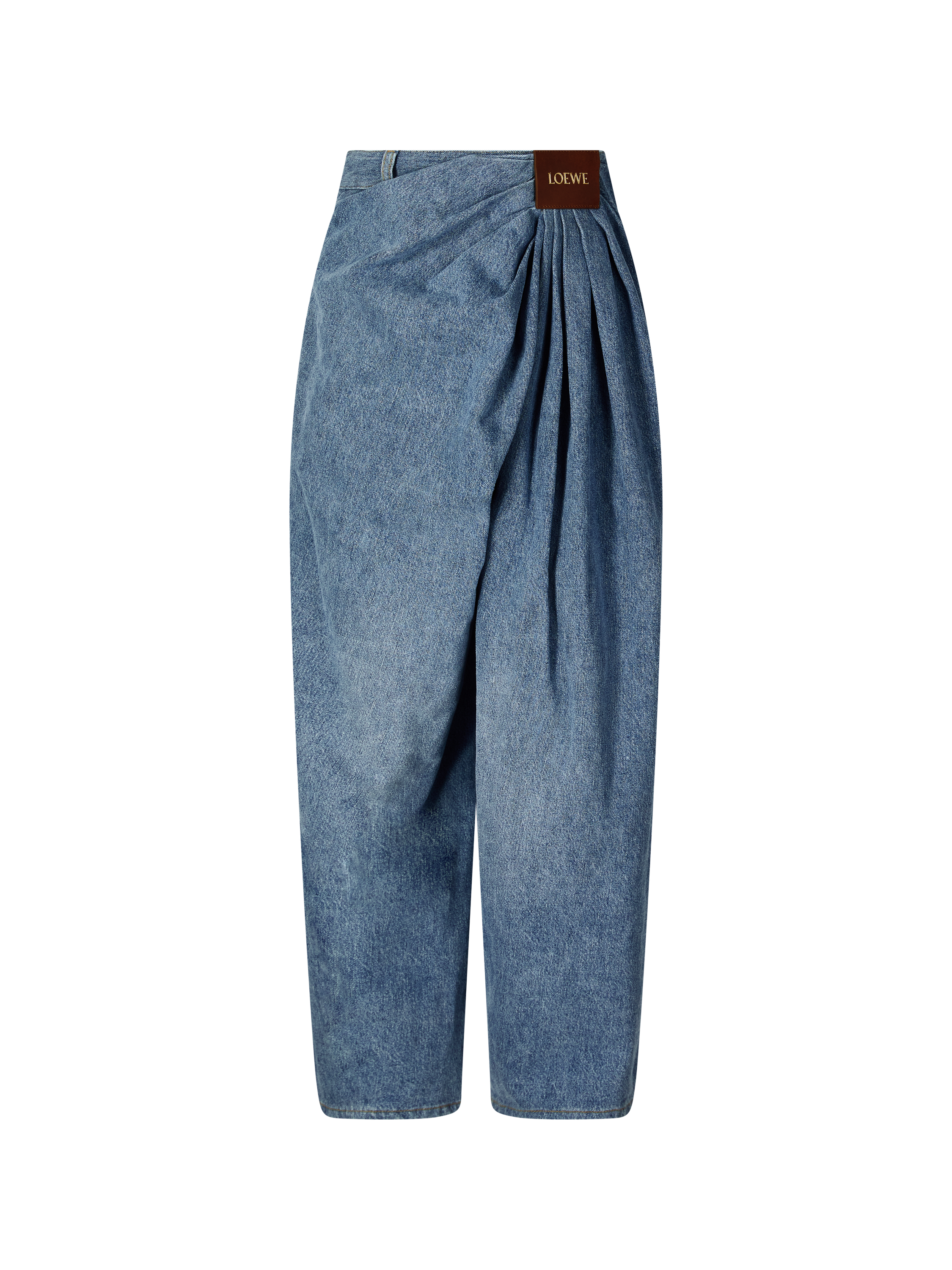Diese Jeans in Blau von LOEWE wurde aus hochwertiger Baumwolle gefertigt und besticht durch die von Hand geraffte Drapierung auf der Vorderseite. Der asymmetrische Schnitt verleiht dem Modell eine moderne Note, während der LOEWE-Lederaufnäher auf der Vorderseite einen markanten Akzent setzt. Das weite Bein und die mittlere Leibhöhe sorgen für eine lässige Silhouette mit stilvollem Charakter.