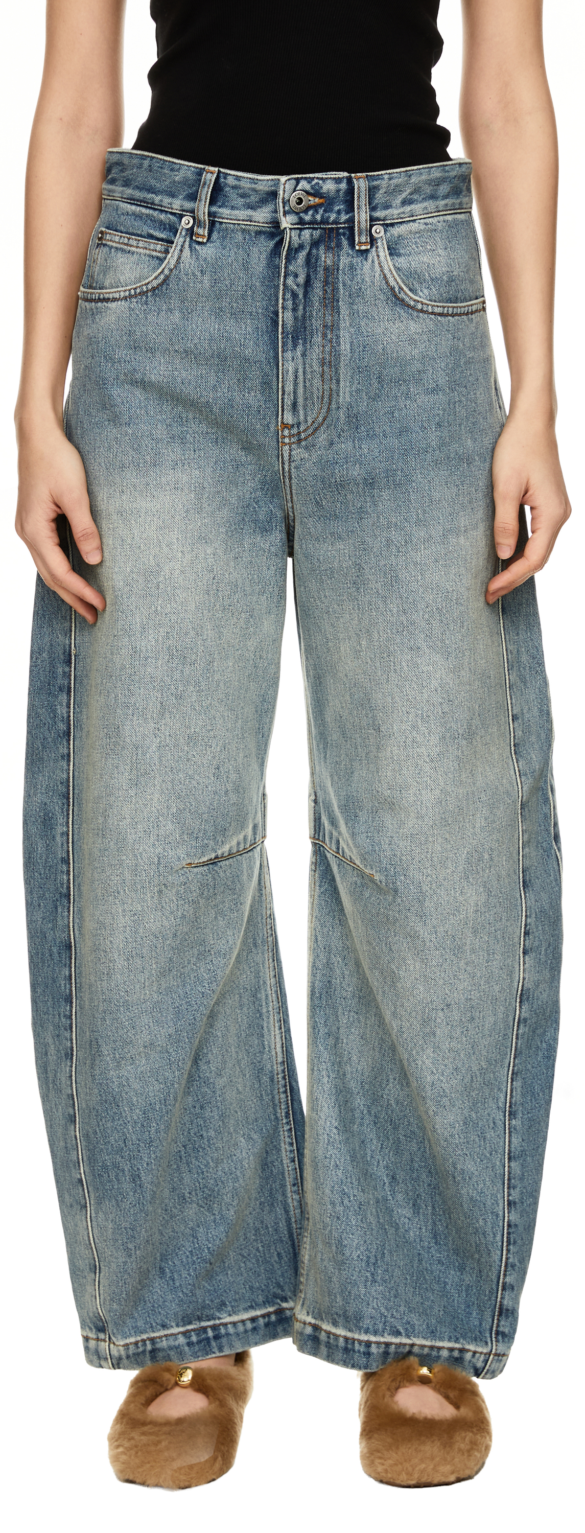 Die Jeans 'Barrel' in Mittelblau von LOEWE wurde aus Baumwoll-Denim gefertigt und besticht durch die ballonförmige Silhouette. Die mittlere Leibhöhe, das weite Bein, das 5-Pocket-Design und die Gürtelschlaufen zeichnen dieses moderne Modell aus. Abgerundet wird dieser Look durch Anagram-Stickereien mit Steppnähten auf der Rückseite und Abnähern an den Knien.