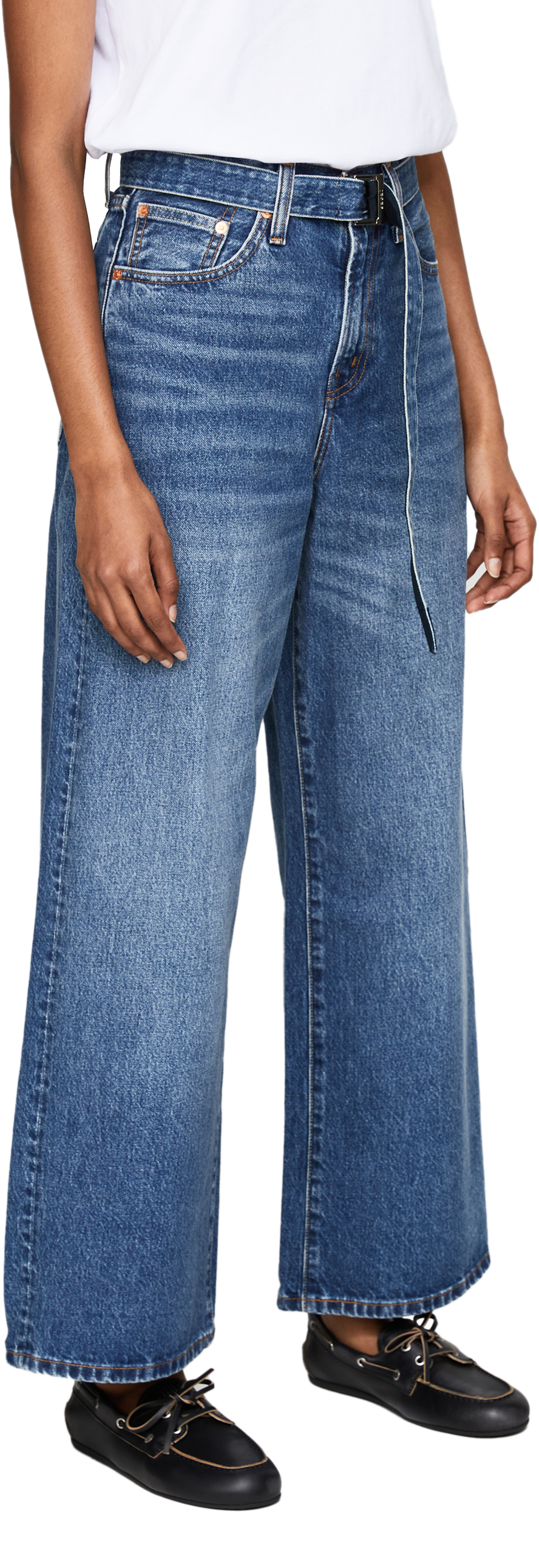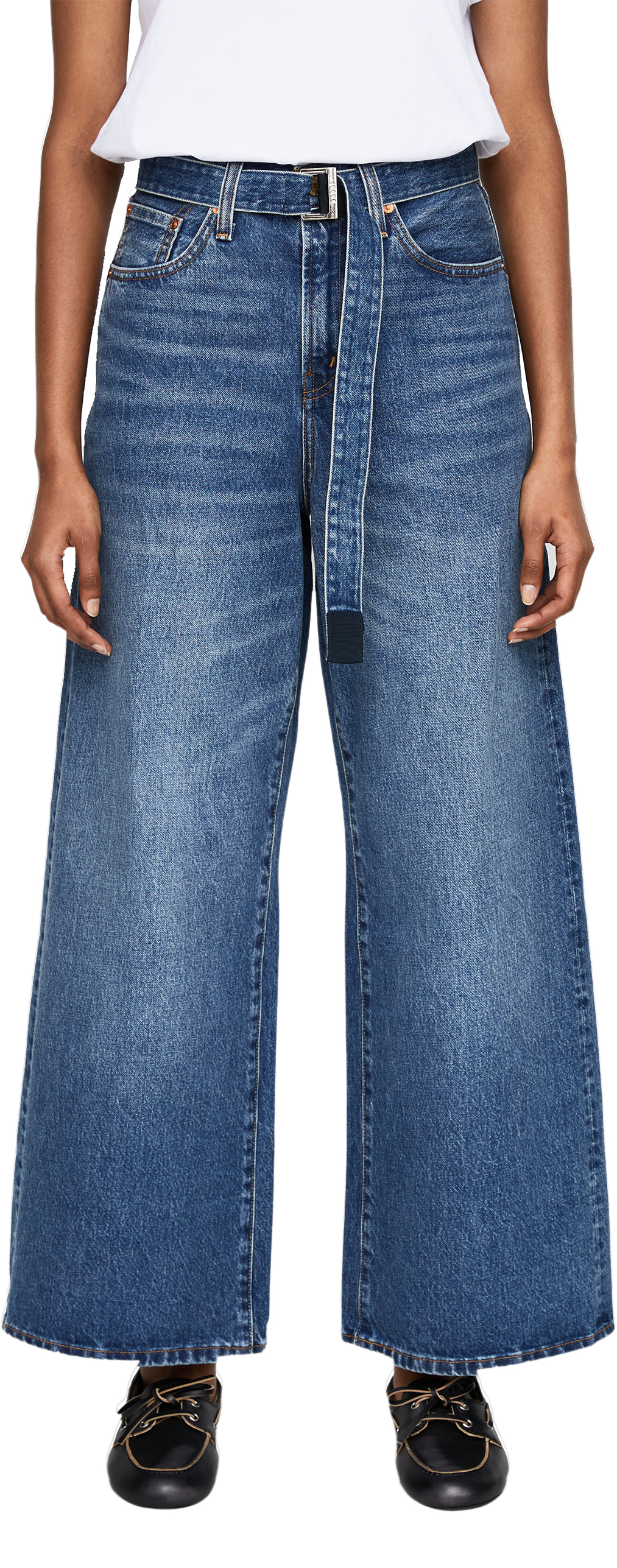 Diese Jeans in Mittelblau aus der Levi's x Sacai Kooperation wurde aus reiner Baumwolle gefertigt und besticht durch den abnehmbaren Gürtel. Die Kontrastnähte und das weite Bein vollenden das Design.