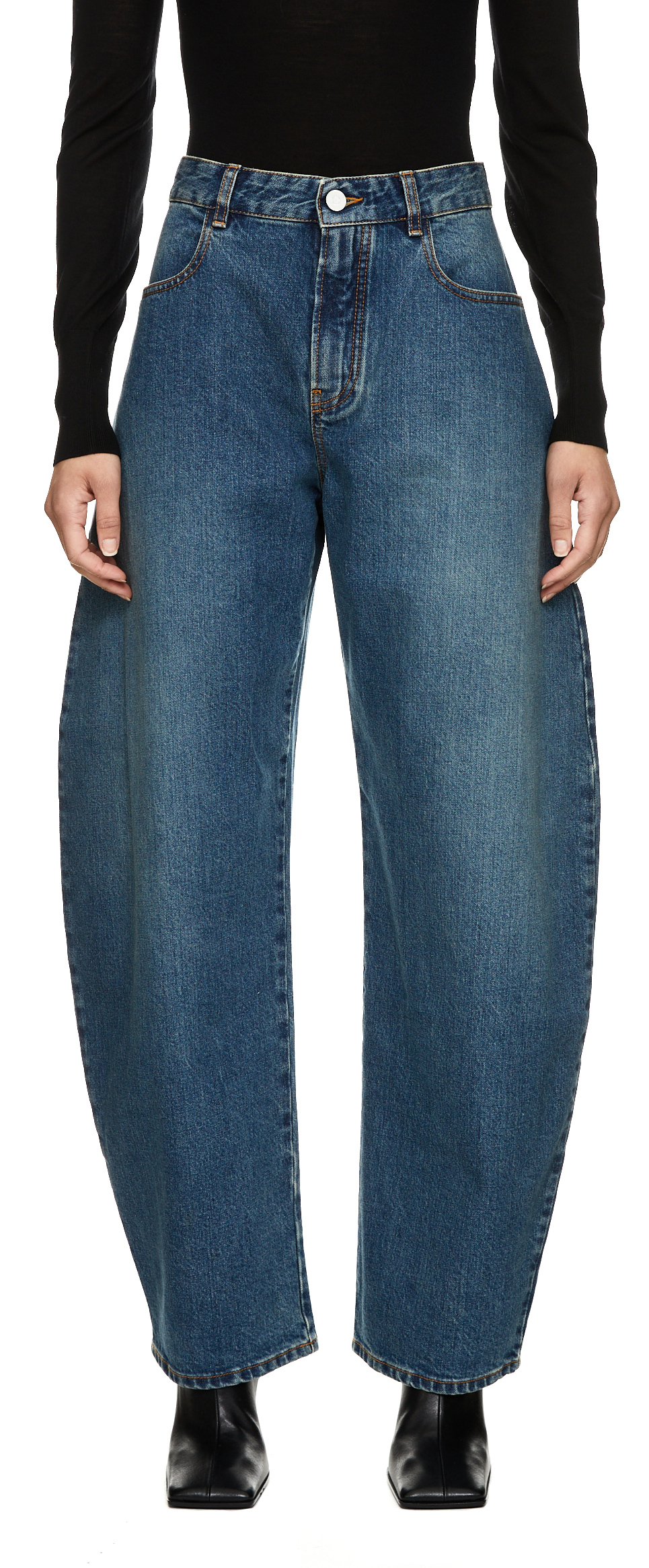 Diese Wide-Leg Jeans in Mittelblau von Alaïa wurde aus einer hochwertigen Baumwollmischung gefertigt und besticht durch die voluminöse Silhouette. Die mittlere Leibhöhe, die Eingrifftaschen sowie die kontrastierende Naht zeichnen diesen skulpturalen Look aus.