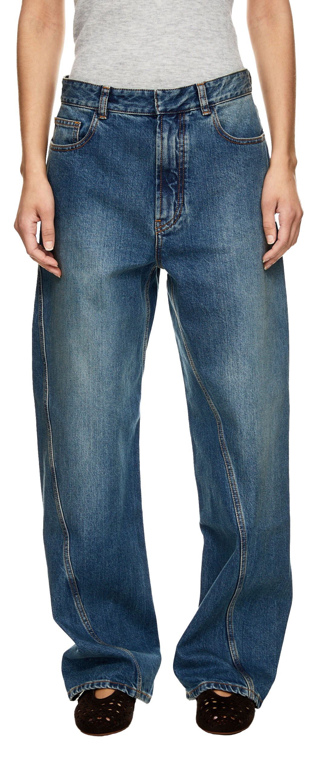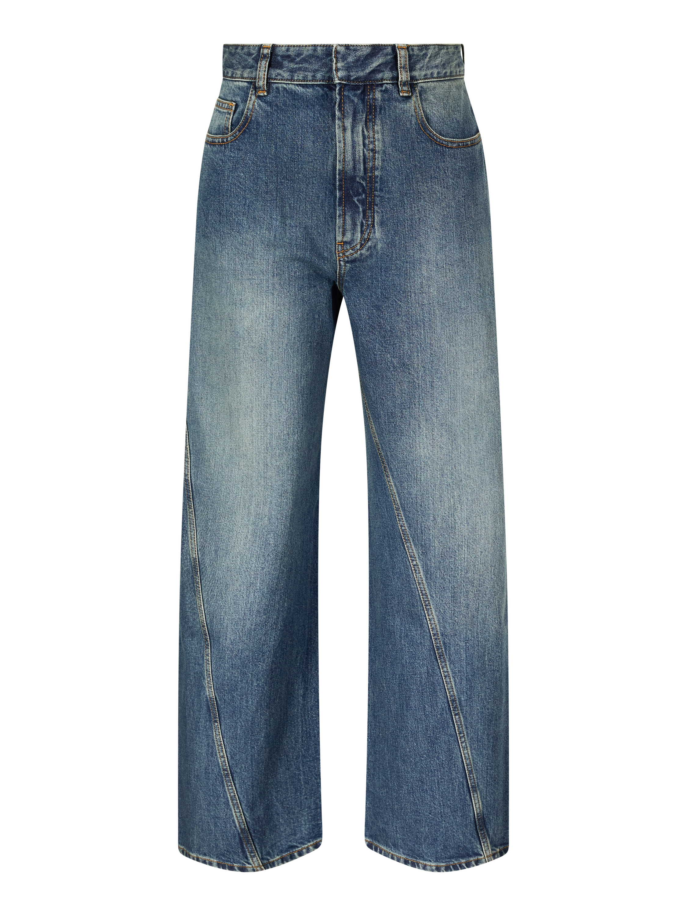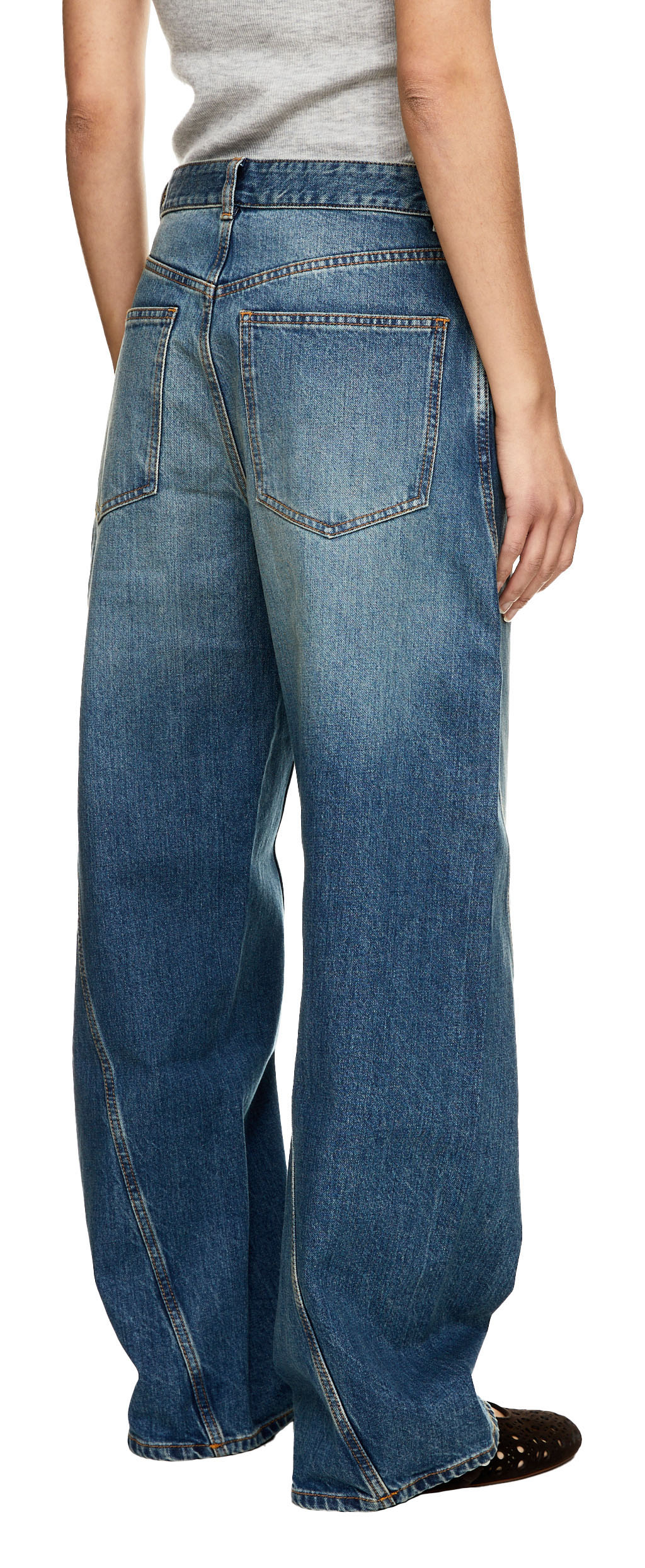 Die Jeans 'Twisted' in Mittelblau von Alaïa wurde aus hochwertiger Baumwolle gefertigt und besticht durch die markanten Teilungsnähte in verdrehter Optik rund um das Bein, die dem Design eine dynamische Note verleihen. Das weite Bein und der klassische 5-Pocket-Schnitt sorgen für Komfort und Vielseitigkeit, während der Haken- und Reißverschluss sowie die Gürtelschlaufen praktische Details ergänzen.