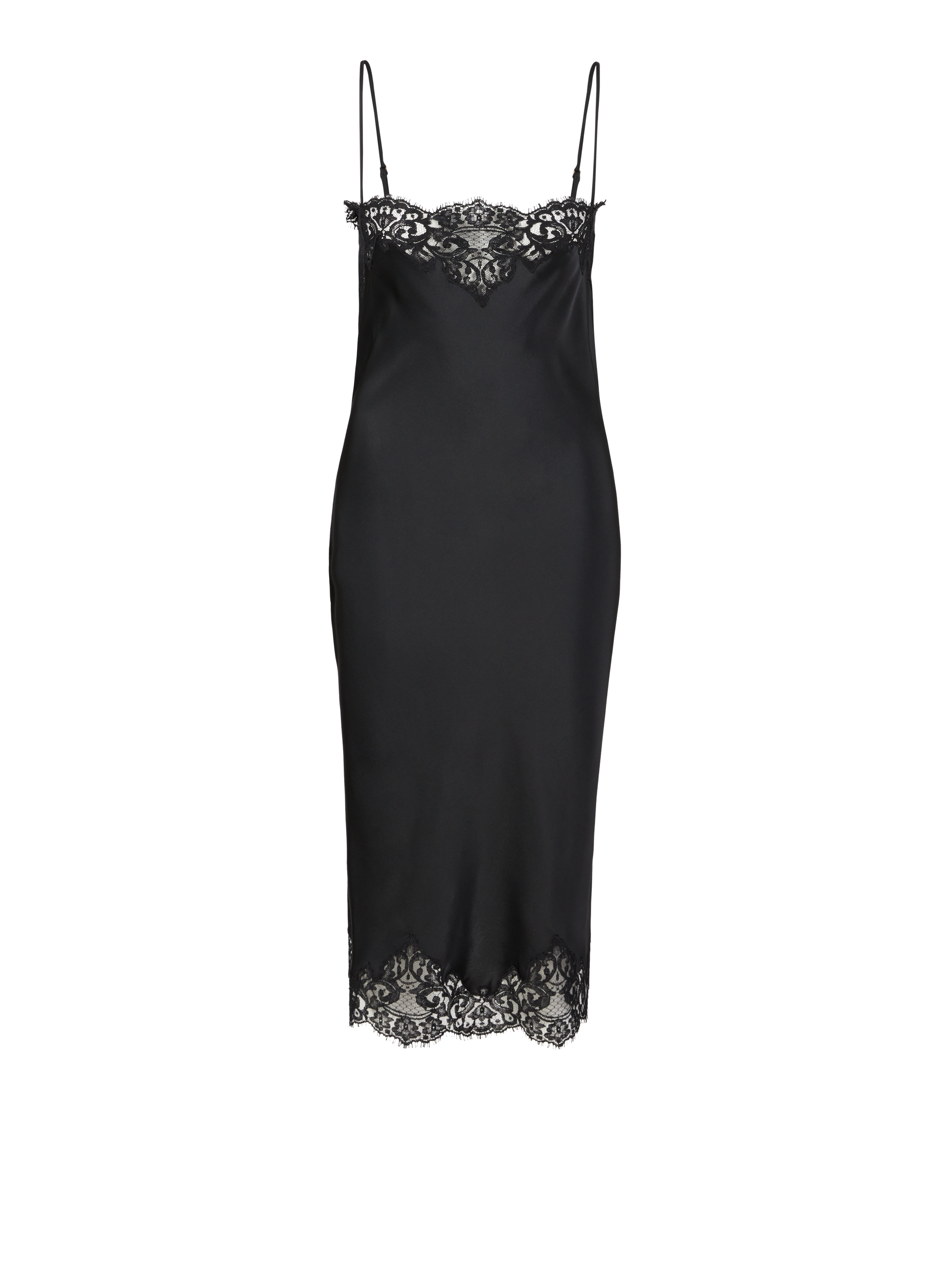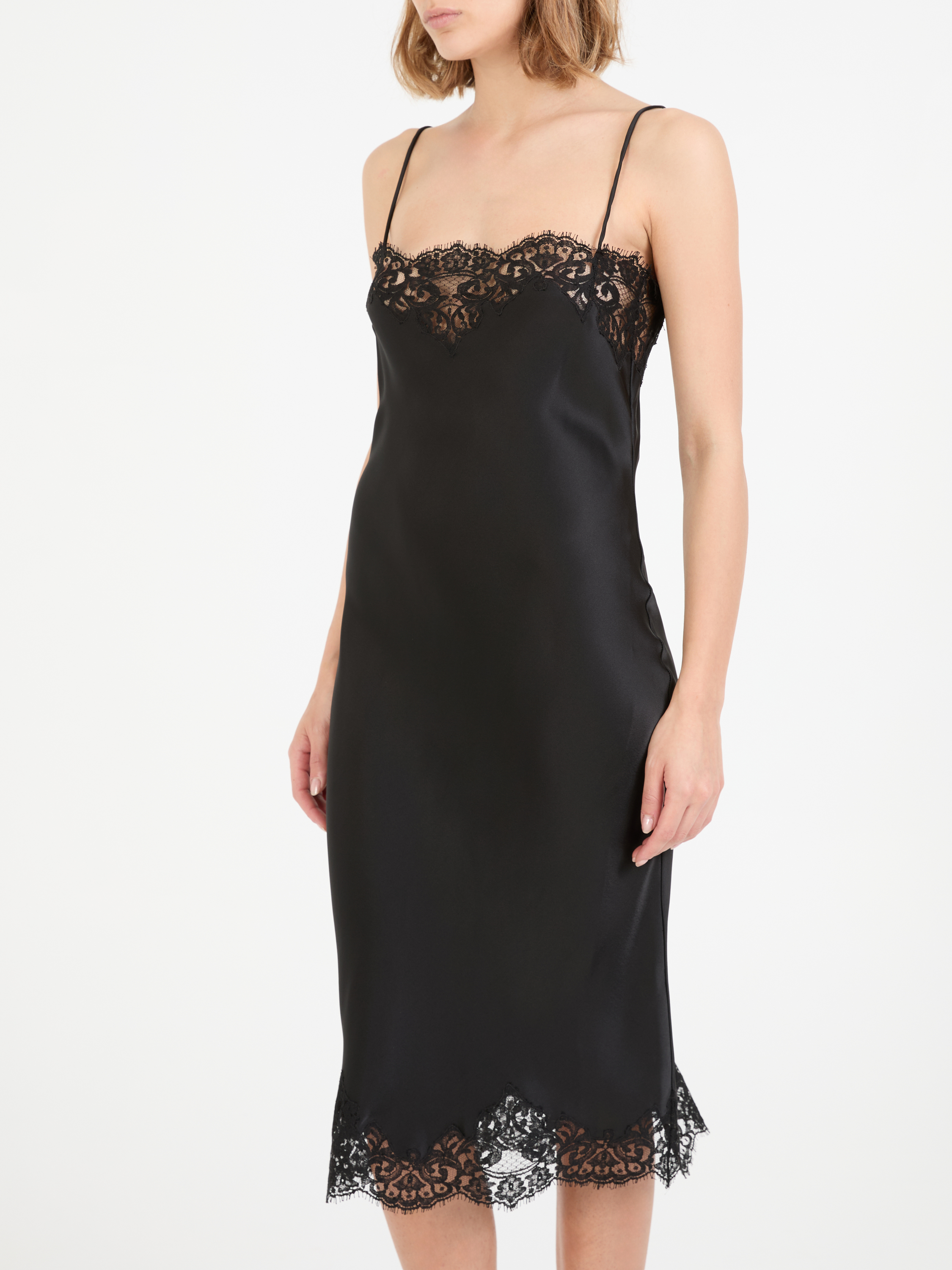 Dieses Kleid in Schwarz von Stella McCartney wurde aus einem hochwertigen Material gefertigt und besticht durch eine Satinoptik. Die hauchdünnen Spaghettiträger, der aufwändiger Spitzeneinsatz und die gerade Passform sorgen für einen femininen Look.