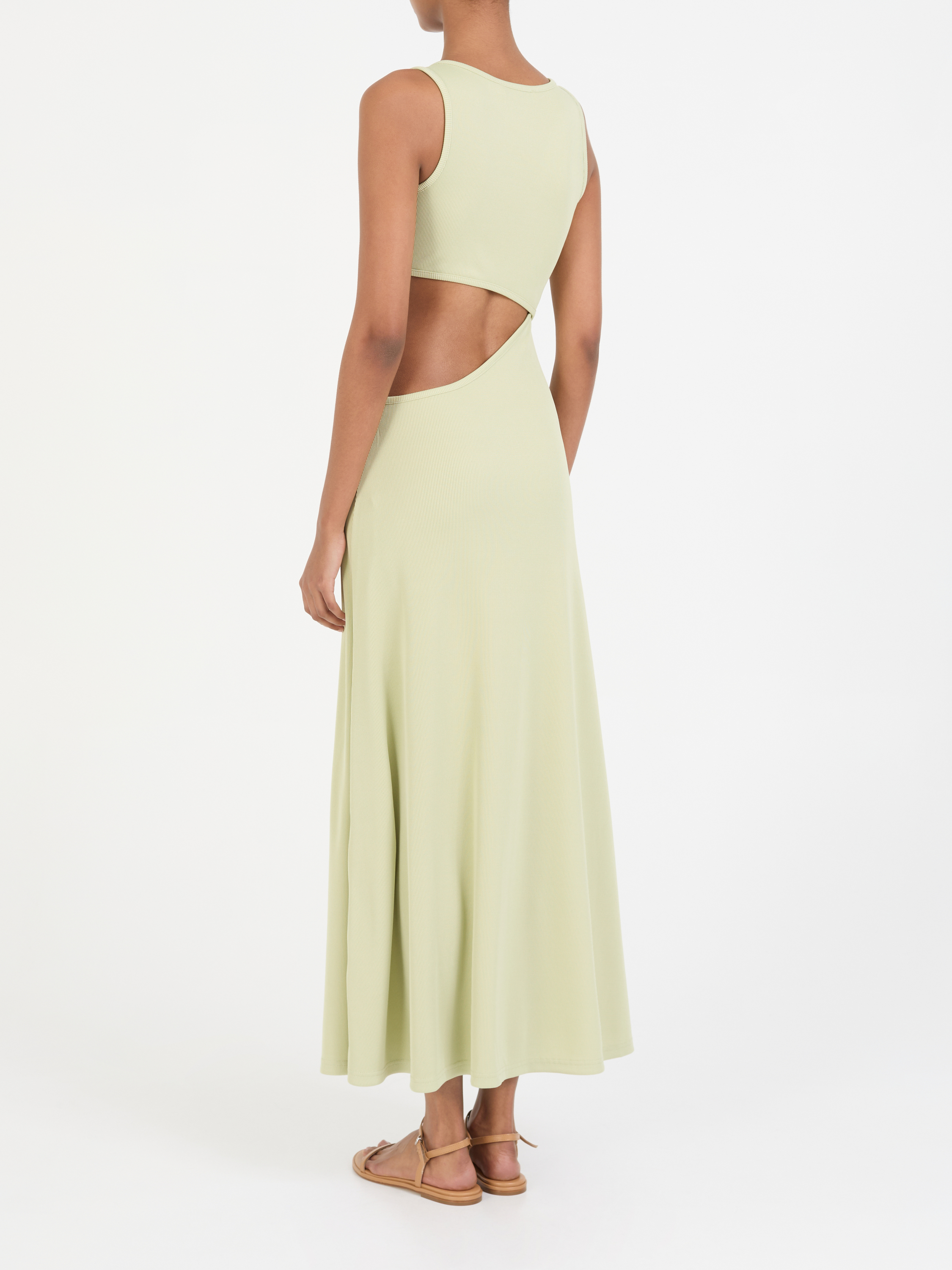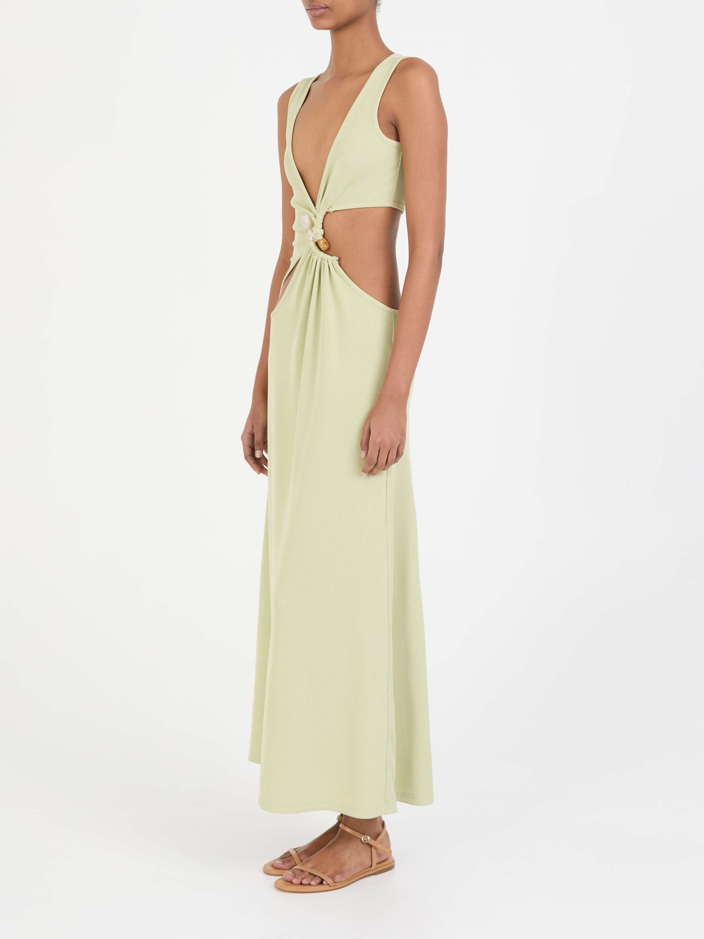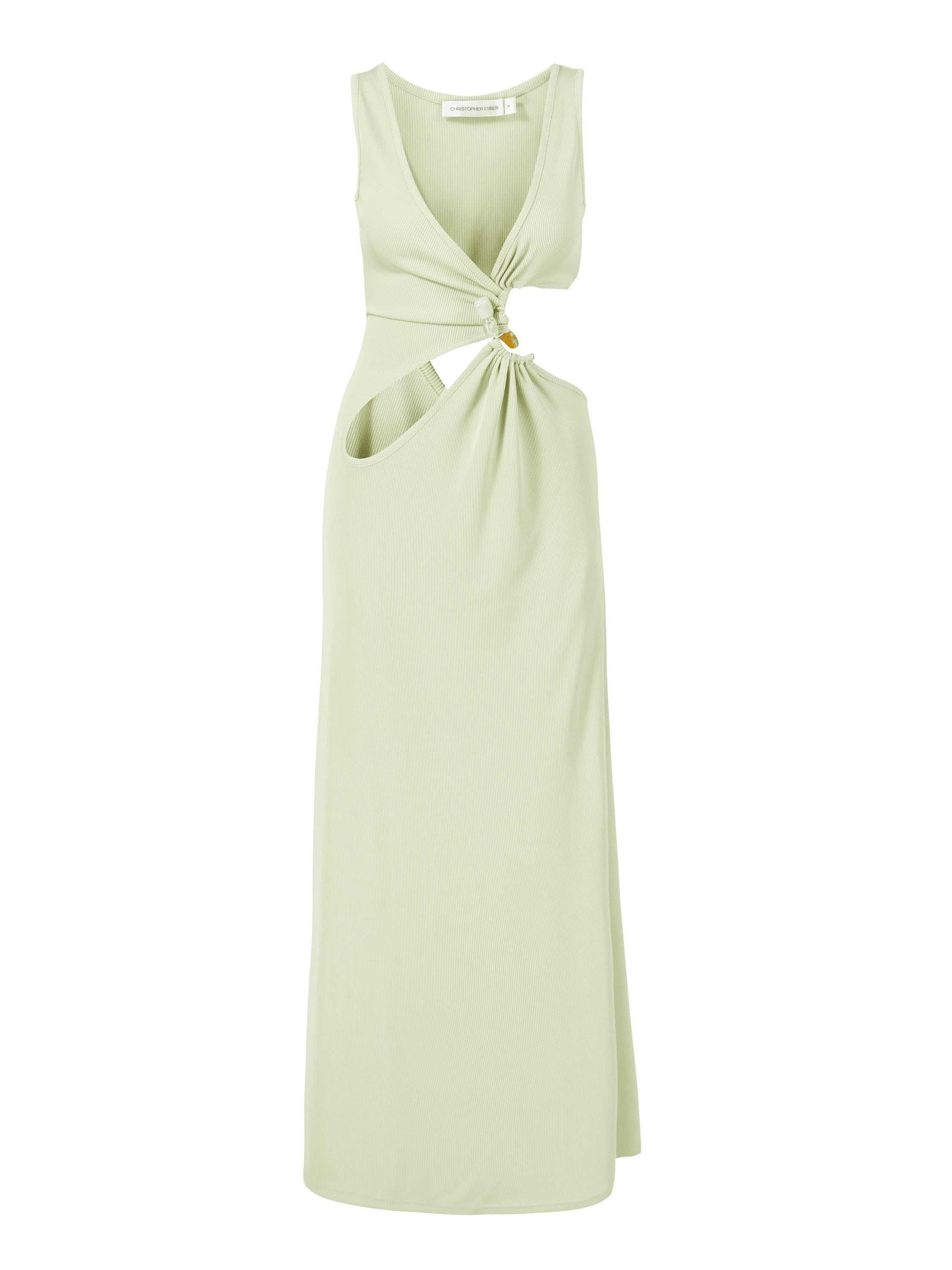 Dieses Kleid in Hellgrün von CHRISTOPHER ESBER wurde aus einem elastischen Materialgemisch gefertigt und besticht durch Cut-Out mit Stein-Details. Die Maxilänge, die fließende Silhouette und die Drapierung um die Cut-Outs vollenden diesen Look.