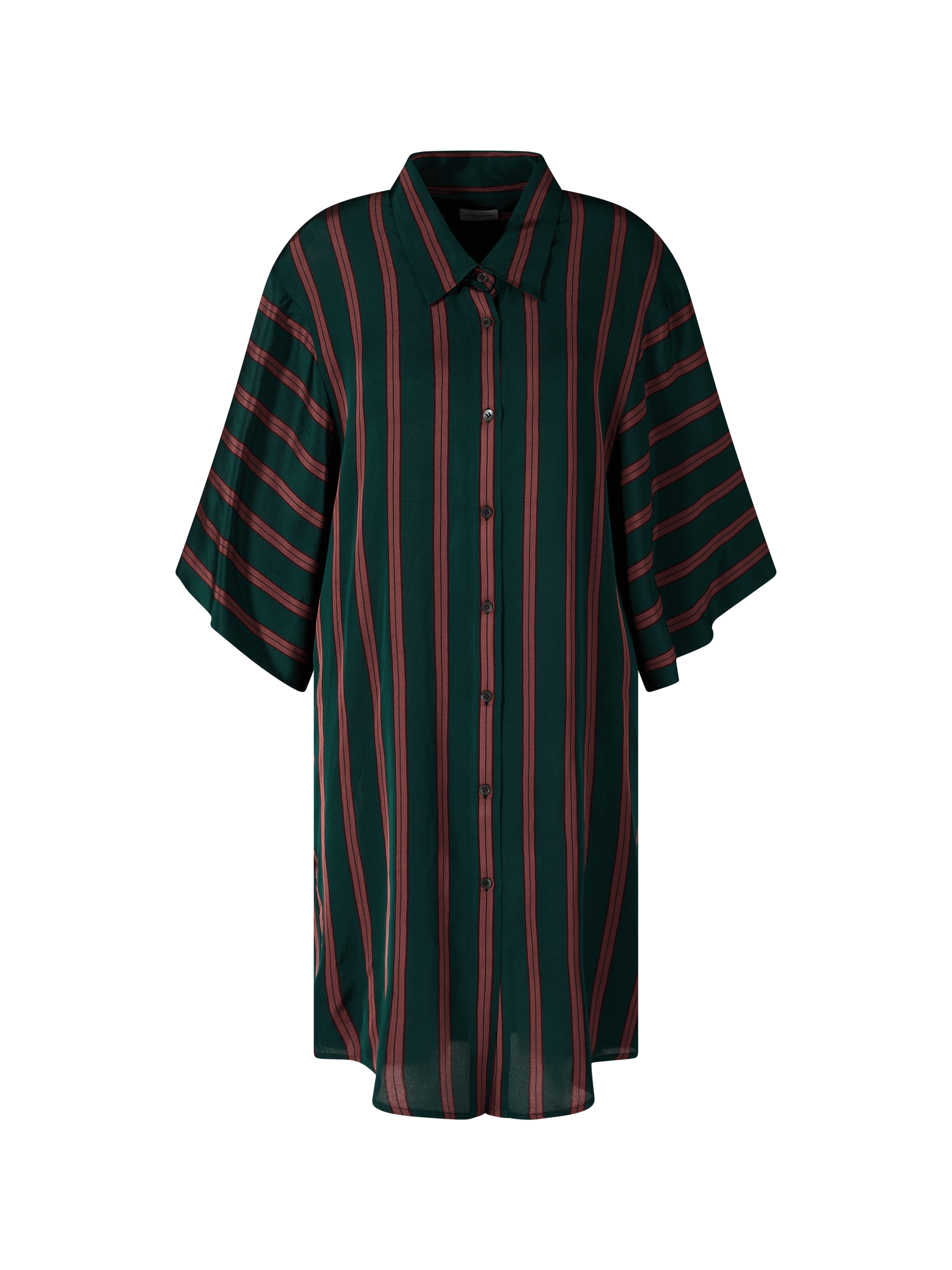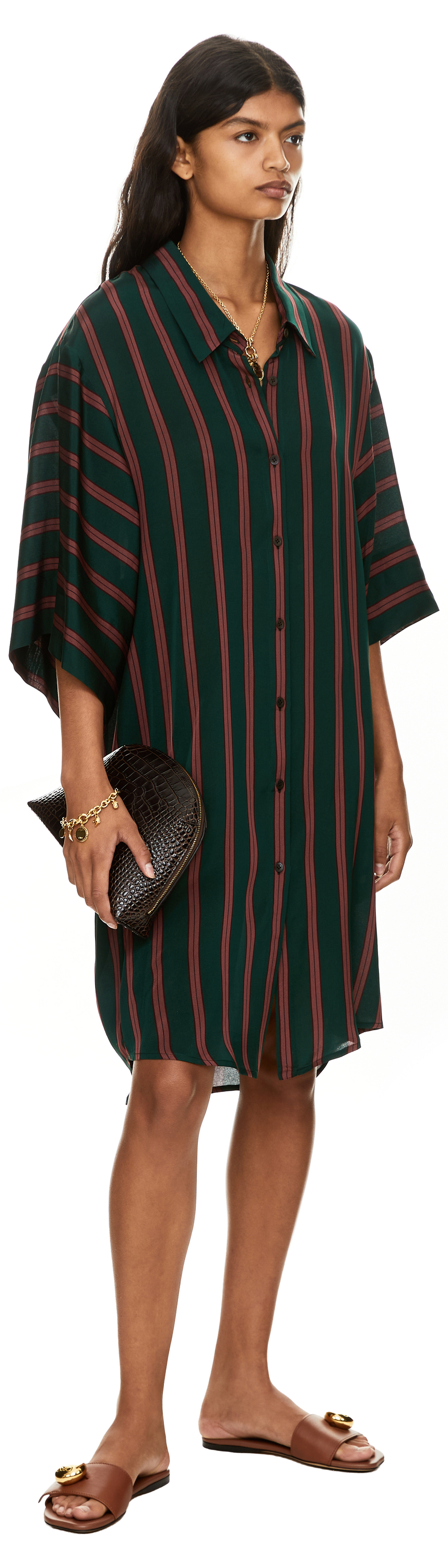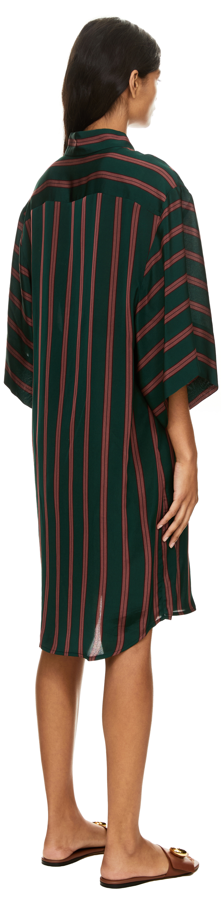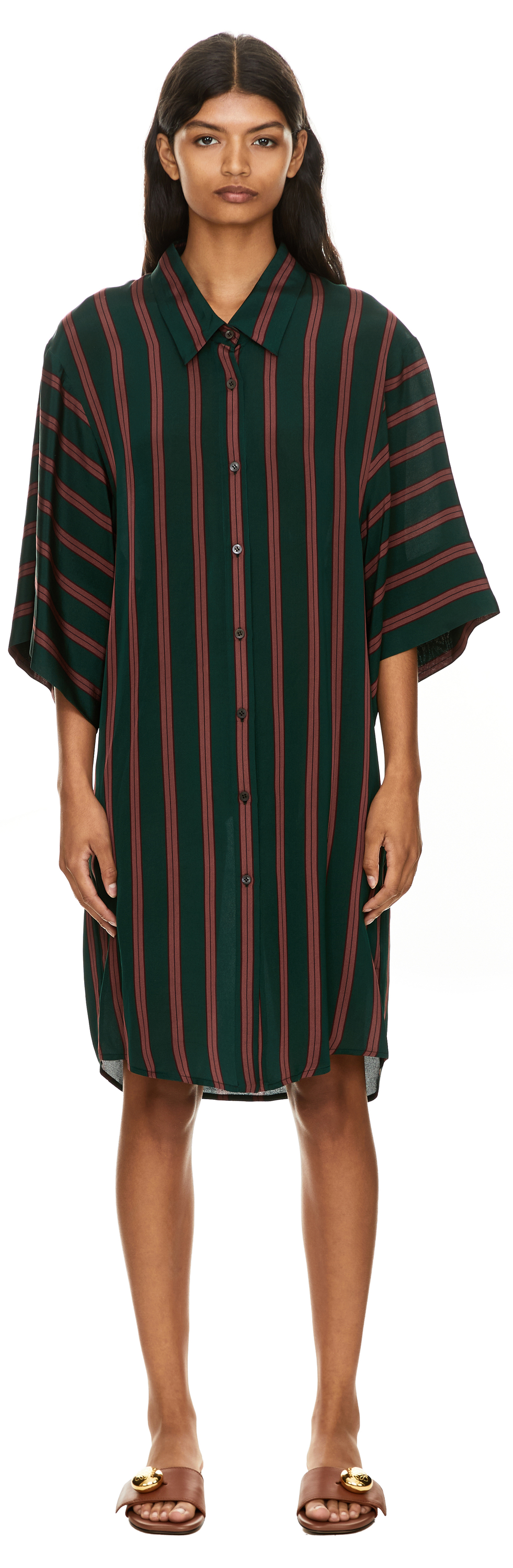 Das Kleid 'Drea' in Grün von Dries van Noten wurde aus einer Viskose-Seidenmischung gefertigt und besticht durch das raffinierte Streifenmuster. Der Umlegekragen mit durchgehender Knopfleiste sorgt für klassische Akzente, während die weiten Halbärmel dem Modell Leichtigkeit verleihen und die moderne Ausstrahlung unterstreichen.