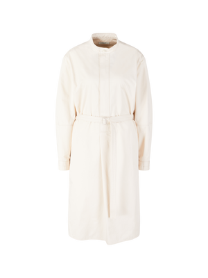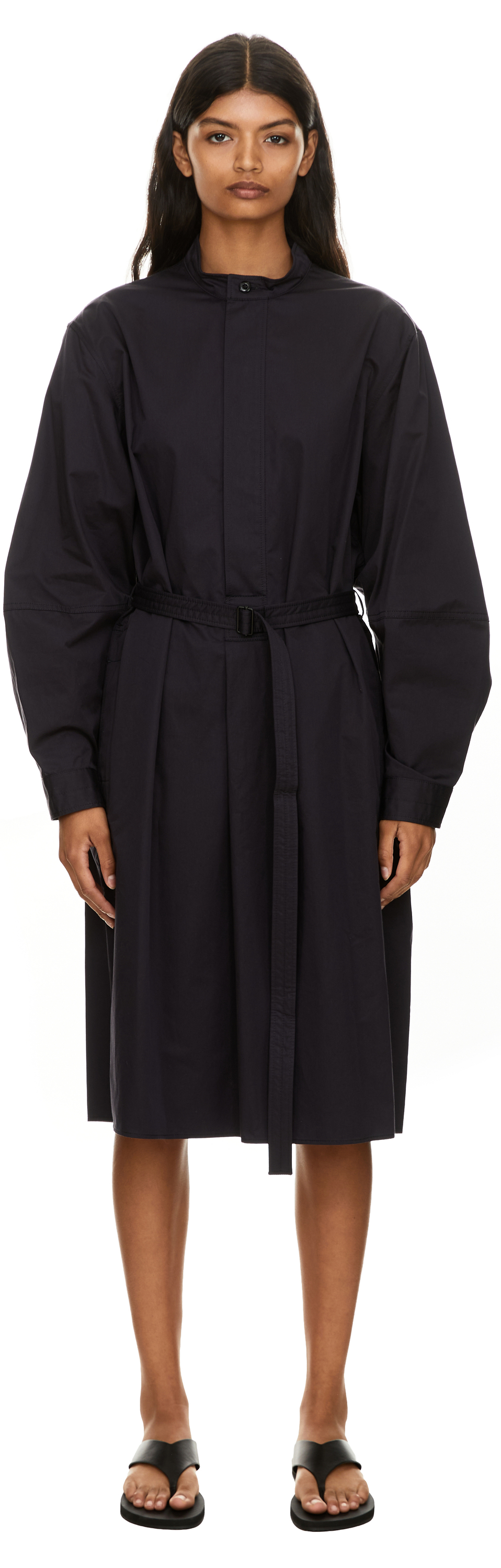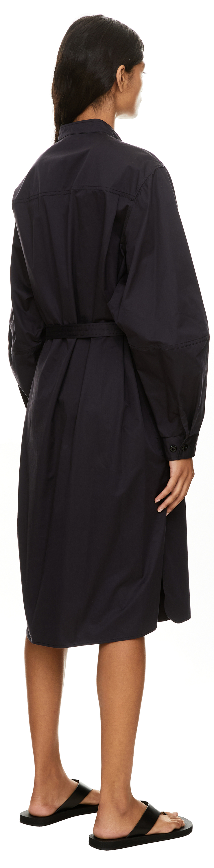 Dieses Kleid in Marineblau von Lemaire wurde aus leichtem Baumwollsatin gefertigt und besticht durch die Oversize-Passform. Die Midilänge, der kleine Stehkragen mit Knopfverschluss, die langen Ärmel mit geknöpften Manschetten, die Knopfleiste vorne sowie die seitlichen Eingrifftaschen zeichnen dieses Modell aus.