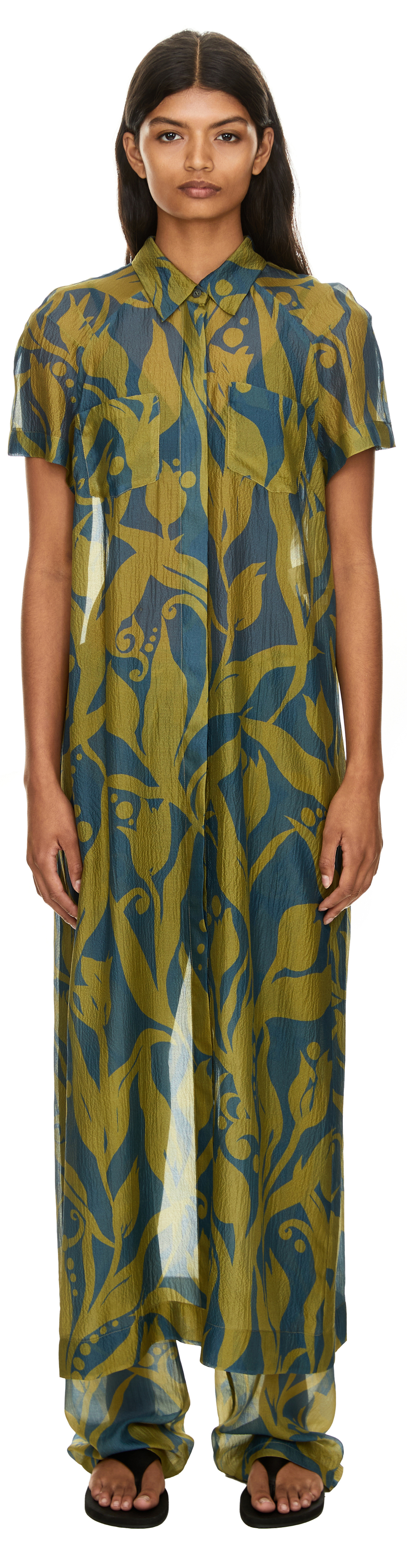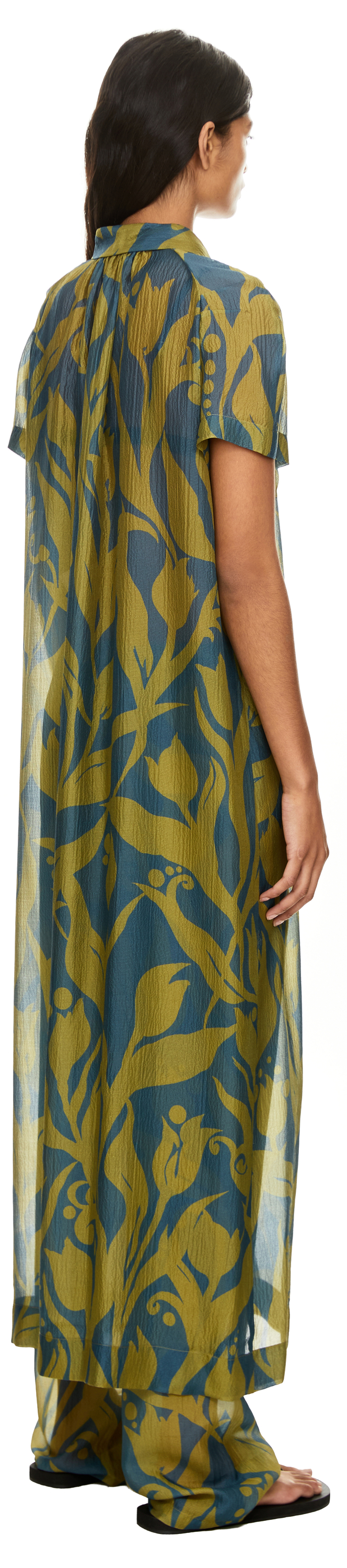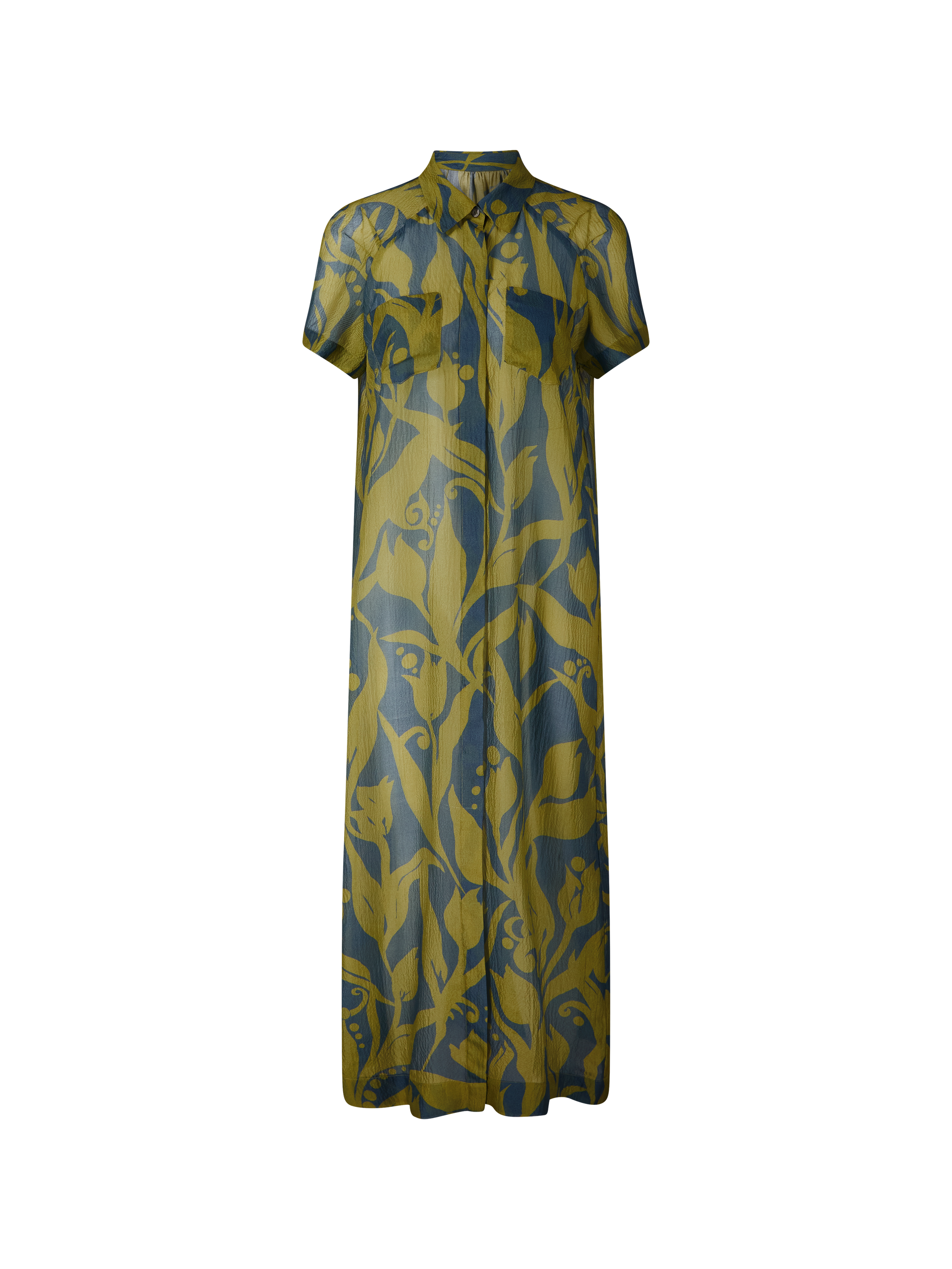 Das Kleid 'Davinia' in Grün/Blau von Dries van Noten wurde aus hochwertiger Seide gefertigt und besticht durch das florale Muster. Die semitransparente Optik in Kombination mit der Maxilänge verleiht dem Design einen leichten, luftigen Look. Der Hemdkragen mit durchgehender, verdeckter Knopfleiste und die beiden Brusttaschen setzen klassische Akzente. Das feine Material und die angenehme Haptik sorgen für ein besonders komfortables Tragegefühl.