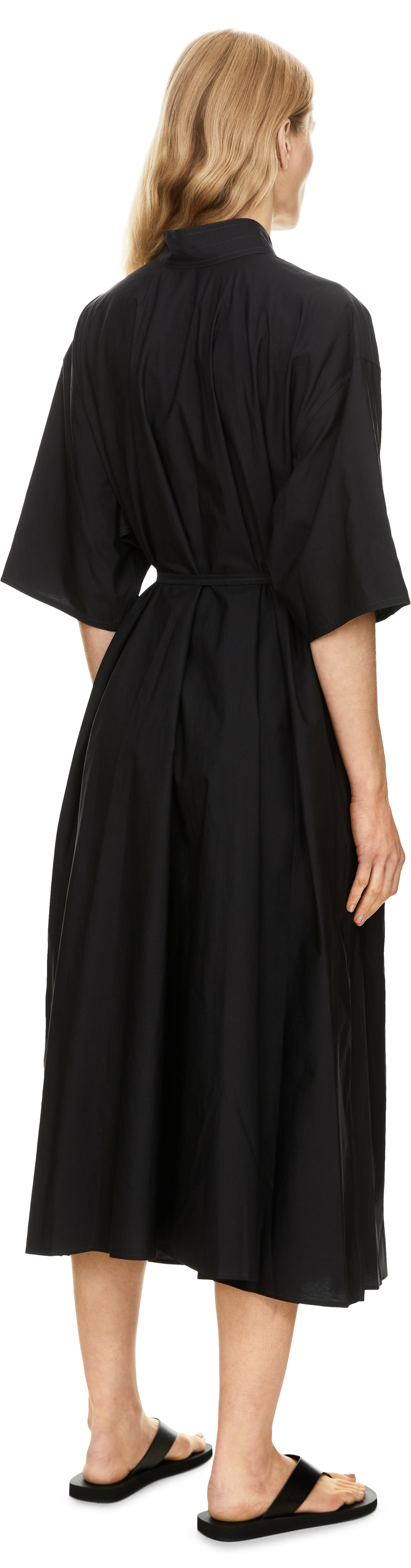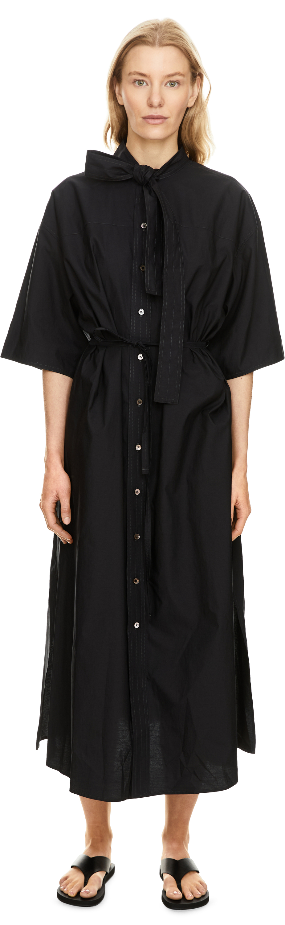 Das Kleid 'Tube' in Dunkelblau von Lemaire wurde aus Baumwolle und gewaschener Seide gefertigt und besticht durch die Wendbarkeit. Der kleine Kragen mit Bindeschal, die kurzen, weiten Ärmel, der abnehmbare, schmale Gürtel sowie die durchgehende Knopfleiste verleihen dem Kleid eine elegante und zugleich moderne Note.