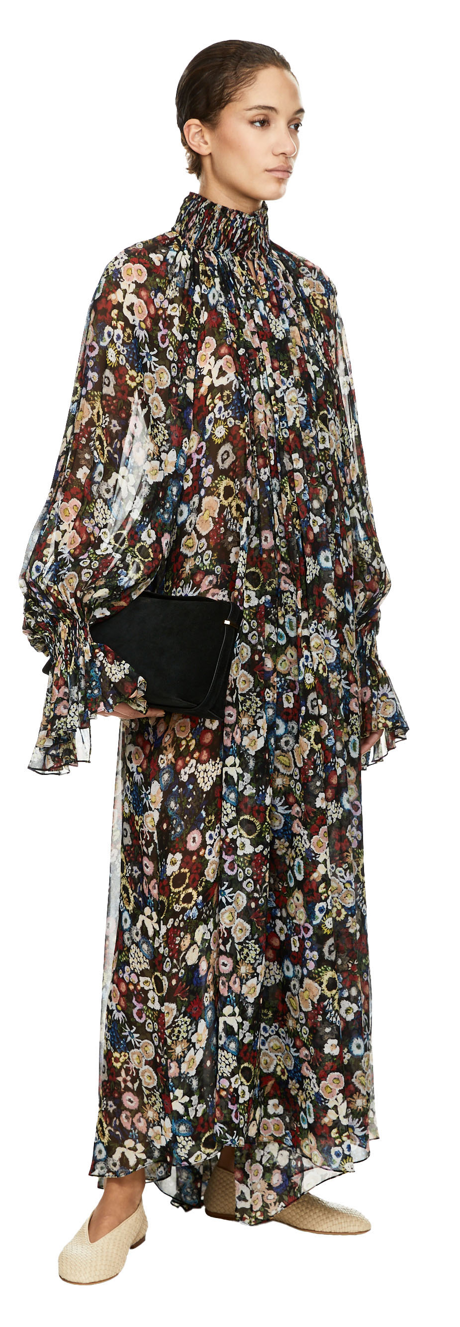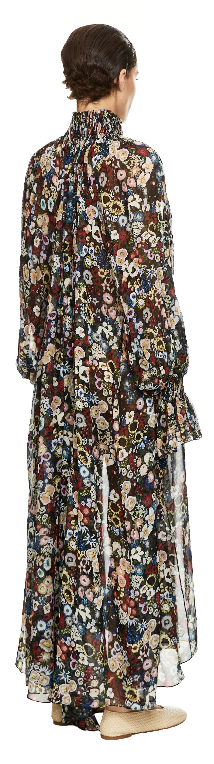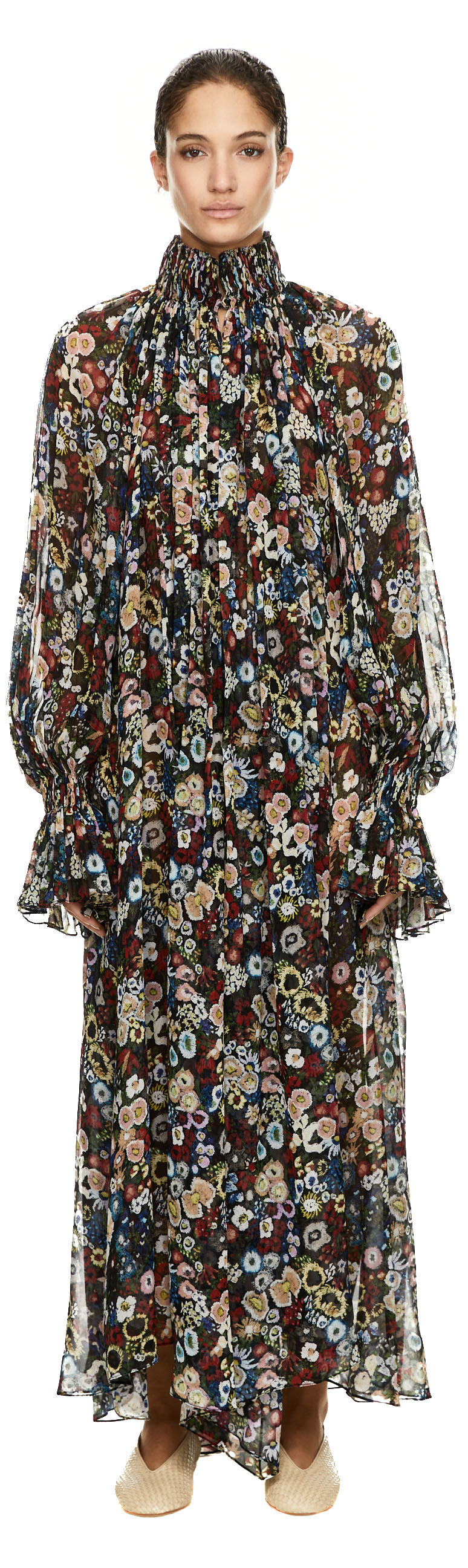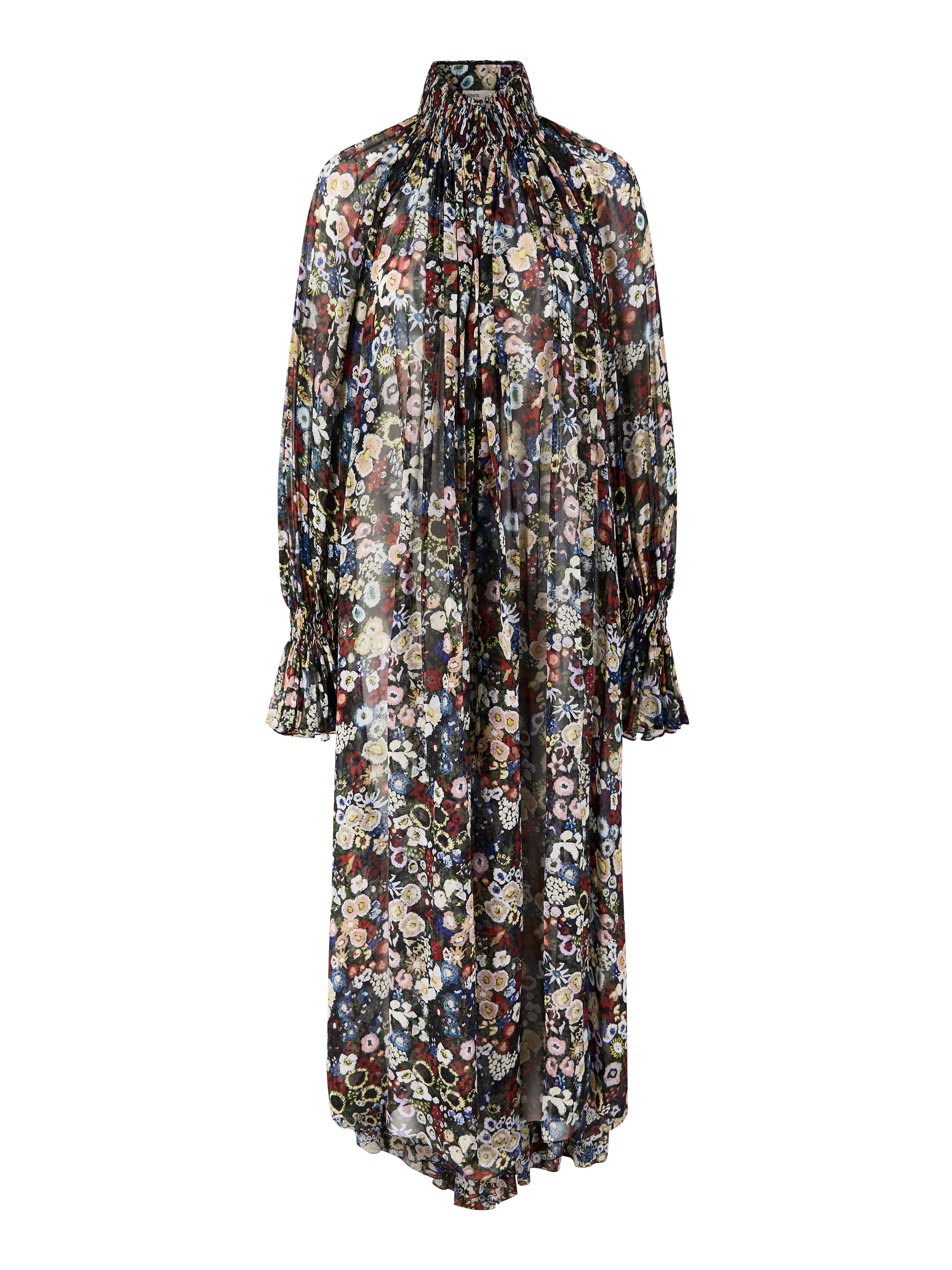Das Kleid 'Edgar' in Multi von Khaite wurde aus reiner Seide gefertigt und besticht durch die handdrapierte Silhouette. Der hohe Stehkragen, die handgekräuselten Falten und die weiten Ärmel, die am Handgelenk gerafft sind, perfektionieren dieses Design. Das Modell vereint den Grunge der 90er mit einem Hauch von Bohème, was es zu einem besonderen Highlight macht.