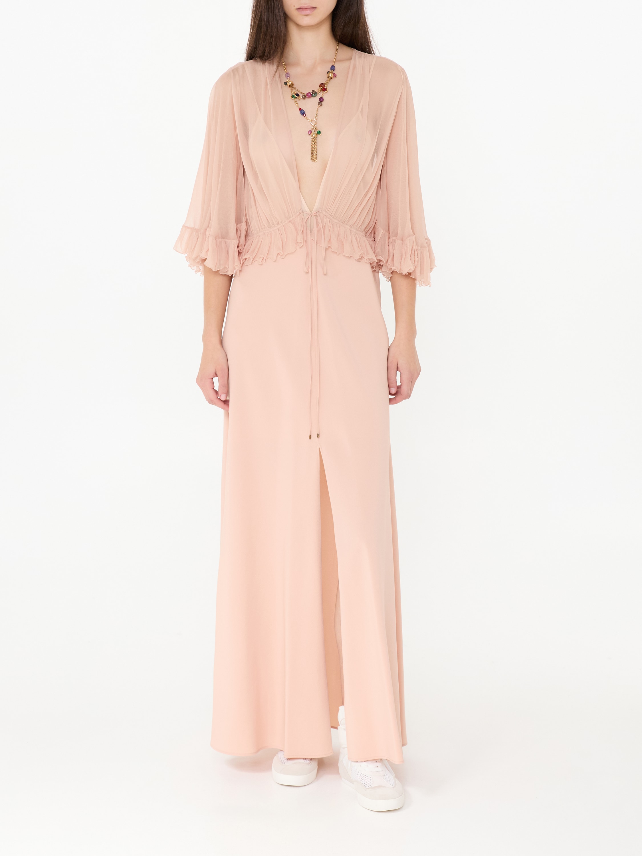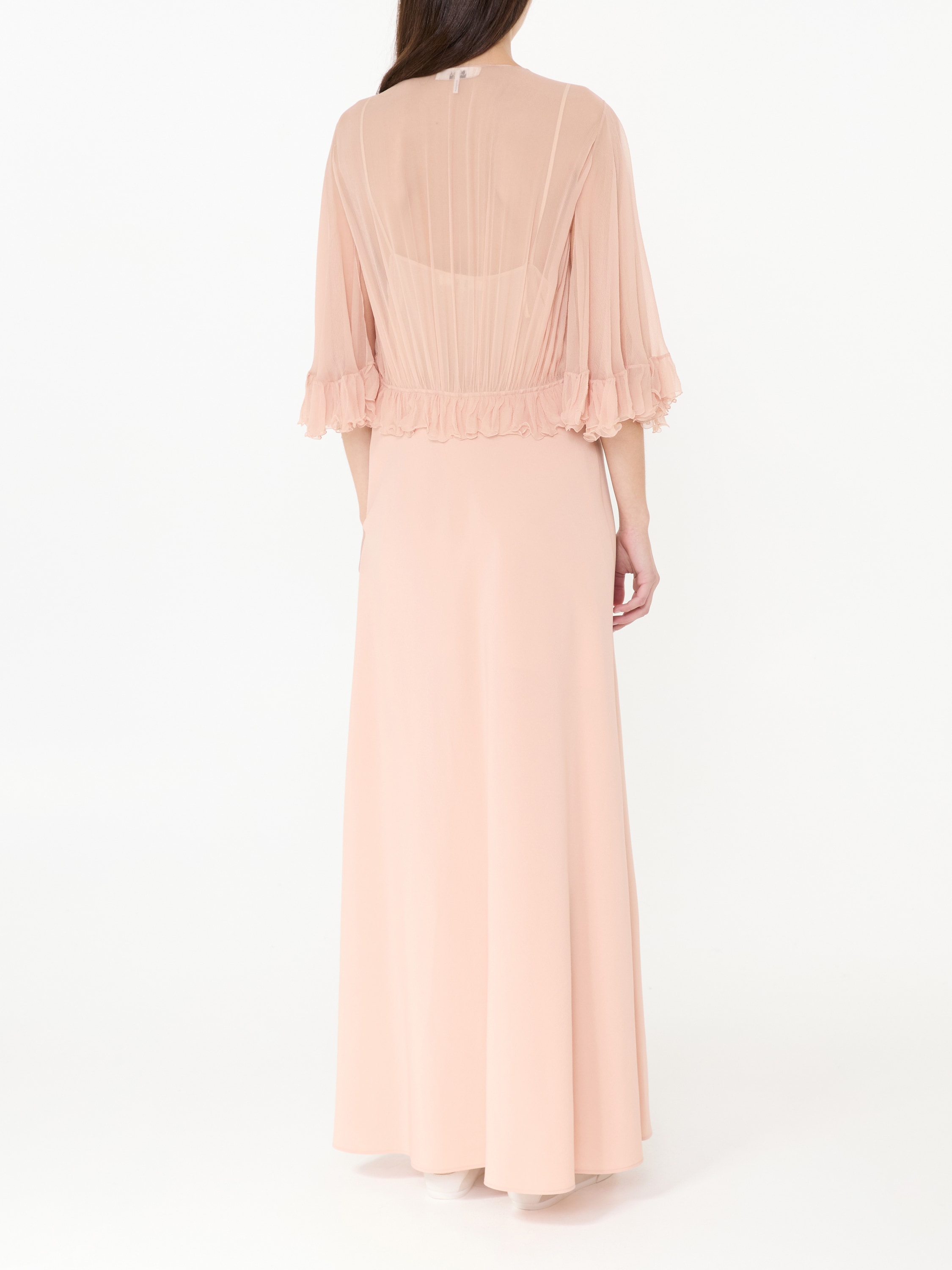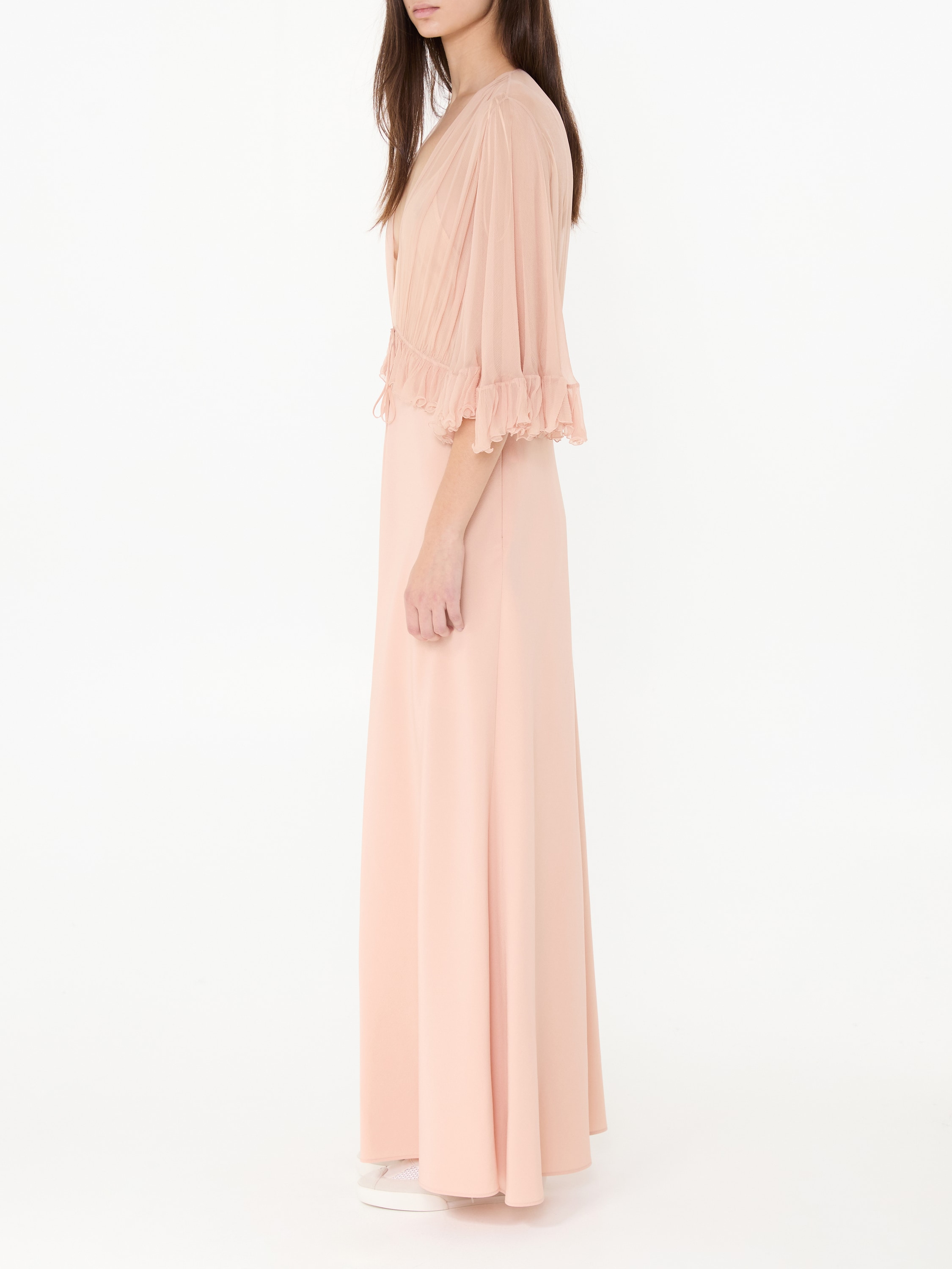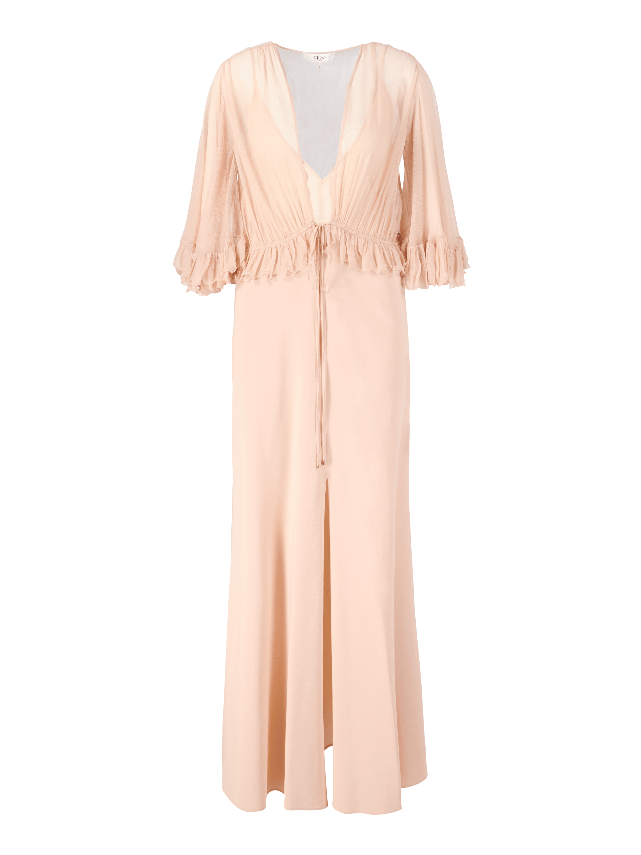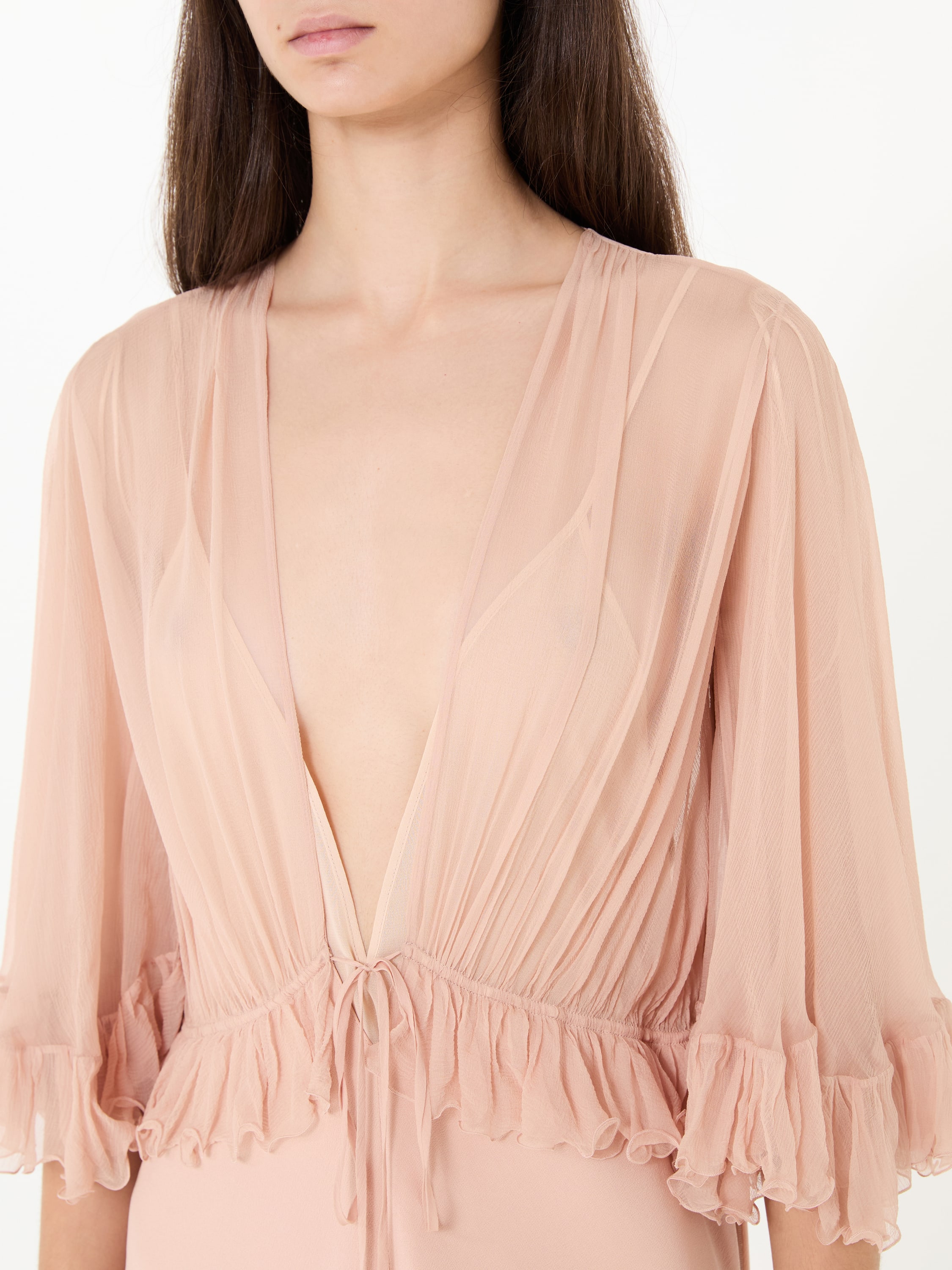 Dieses Kleid in Rosé von Chloé wurde aus reiner Seide gefertigt und besticht durch die fließende Passform und dem V-Ausschnitt. Die Rüschen perfektionieren dieses Design.