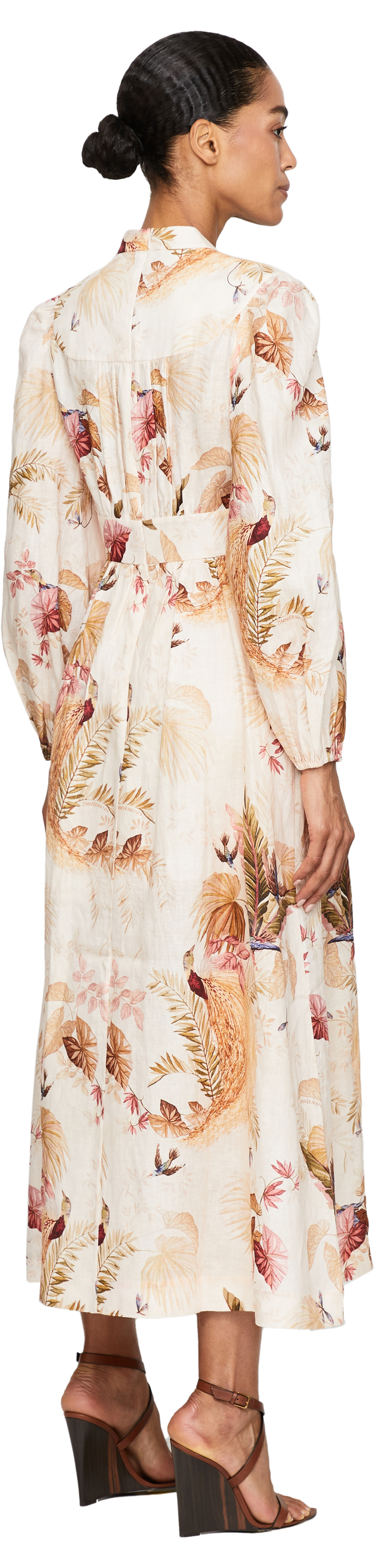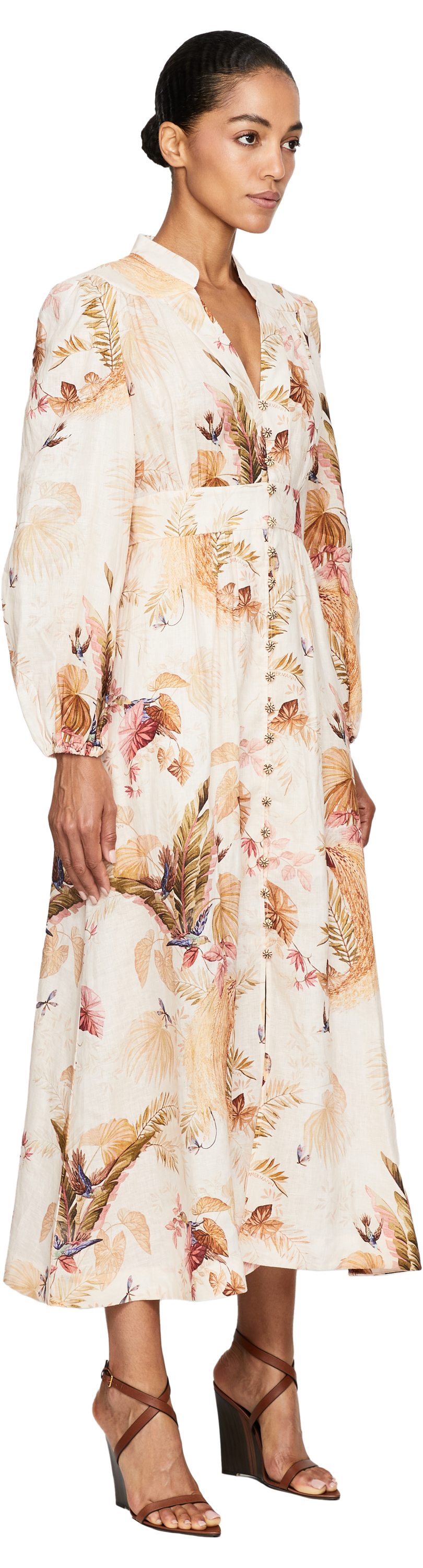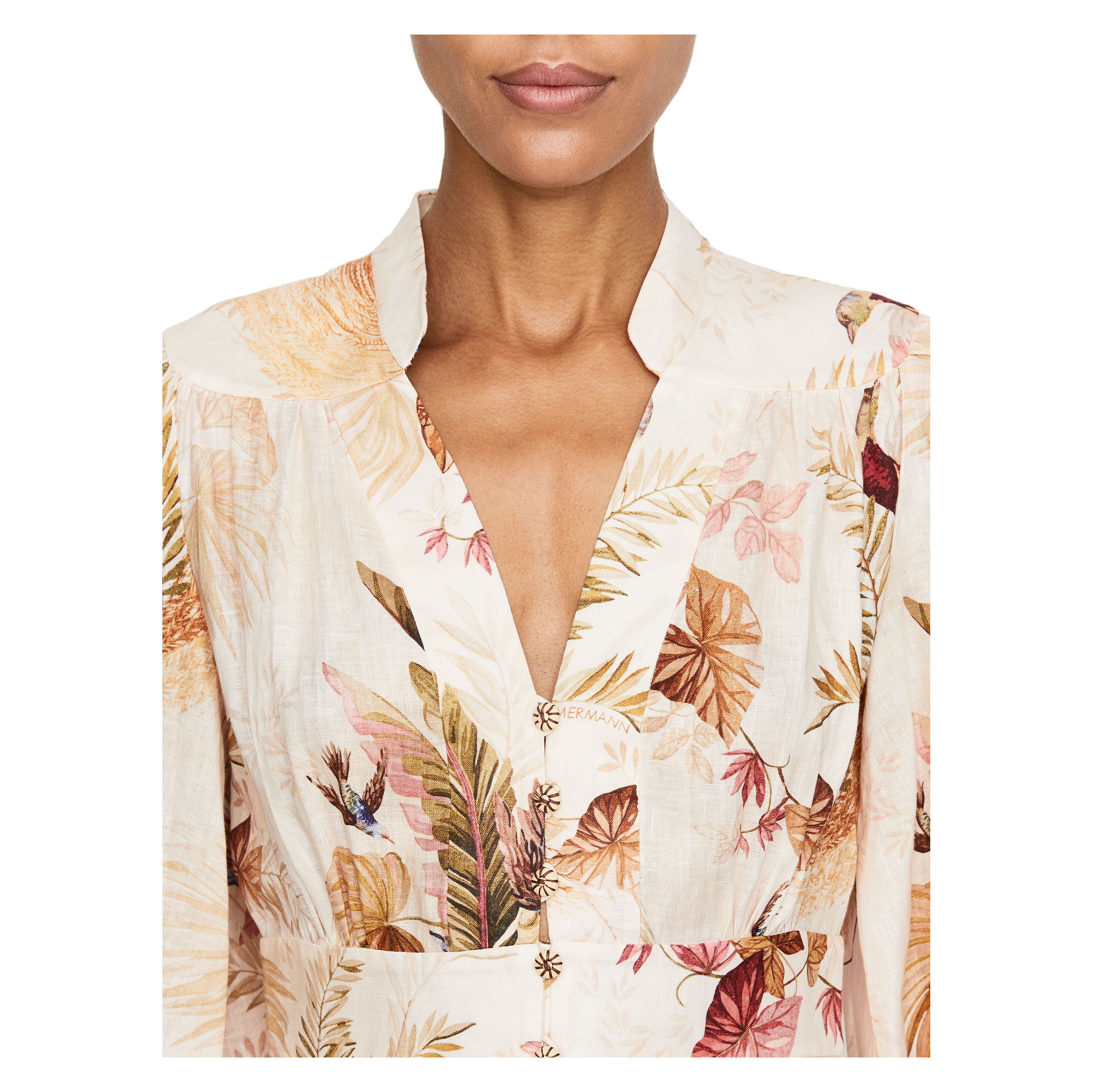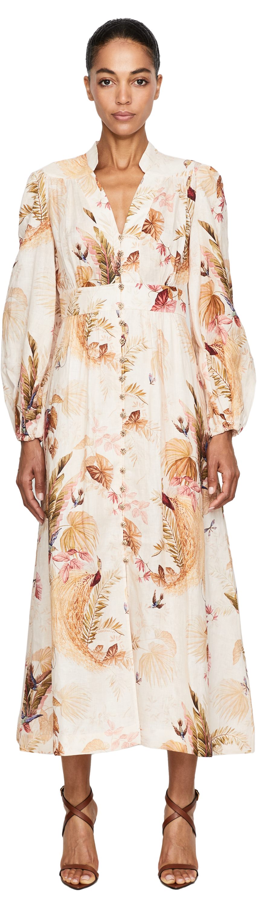 Das Kleid 'Ascension' in Multi von Zimmermann wurde aus hochwertigen Leinen gefertigt und besticht durch ein mehrfarbiges florales Muster. Der tiefe V-Ausschnitt, die vorderseitigen Knöpfe in der Mitte und die Taillierung zeichnen diese feminine Silhouette aus.