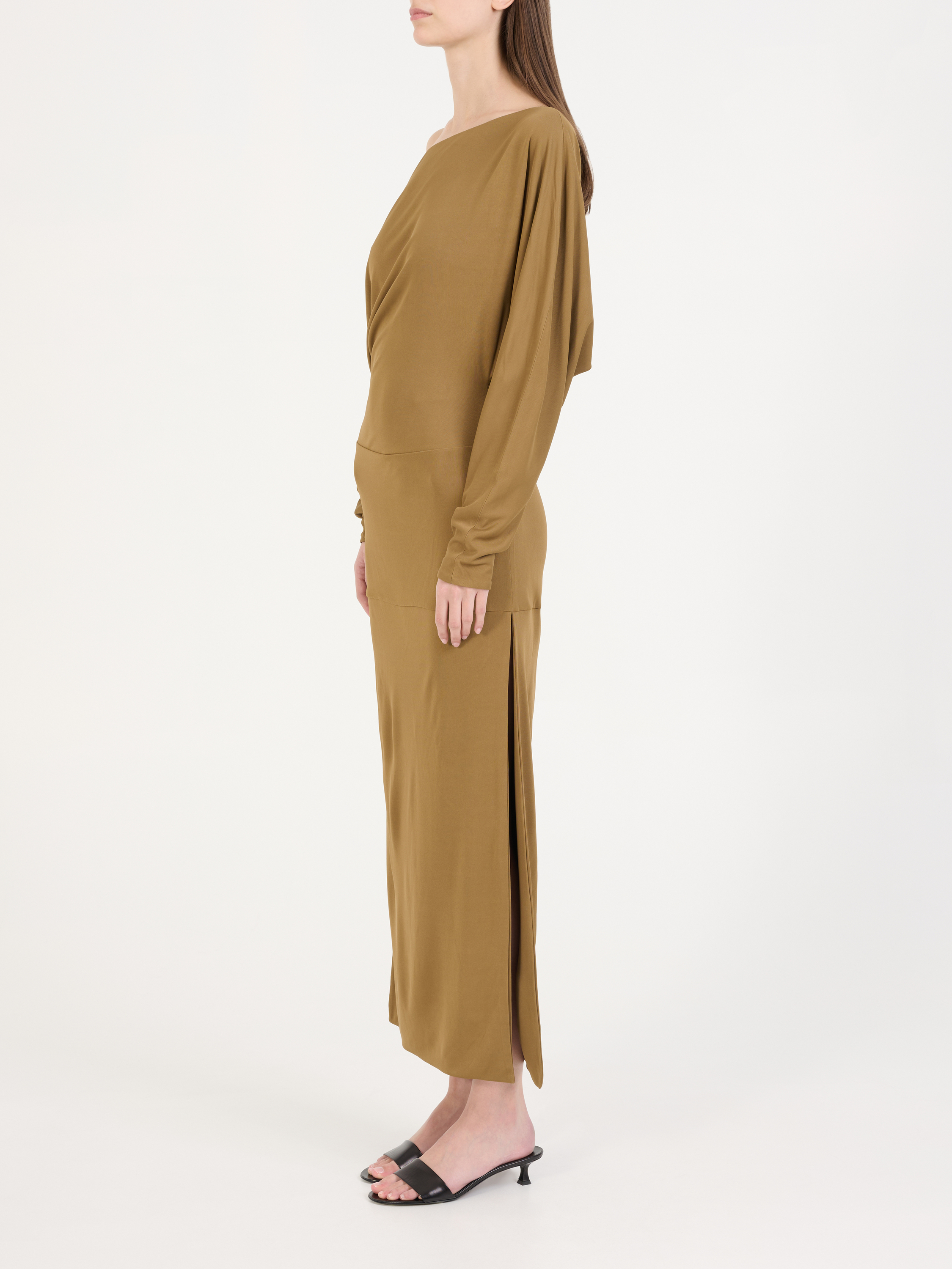 Das One-Shoulder-Kleid 'Junet' in Khaki von Khaite wurde aus einem hochwertigen Material gefertigt und besticht durch eine fließende, feminine Silhouette. Der drapierte Dolman-Ärmel und das Taillenband zeichnen dieses Modell aus.