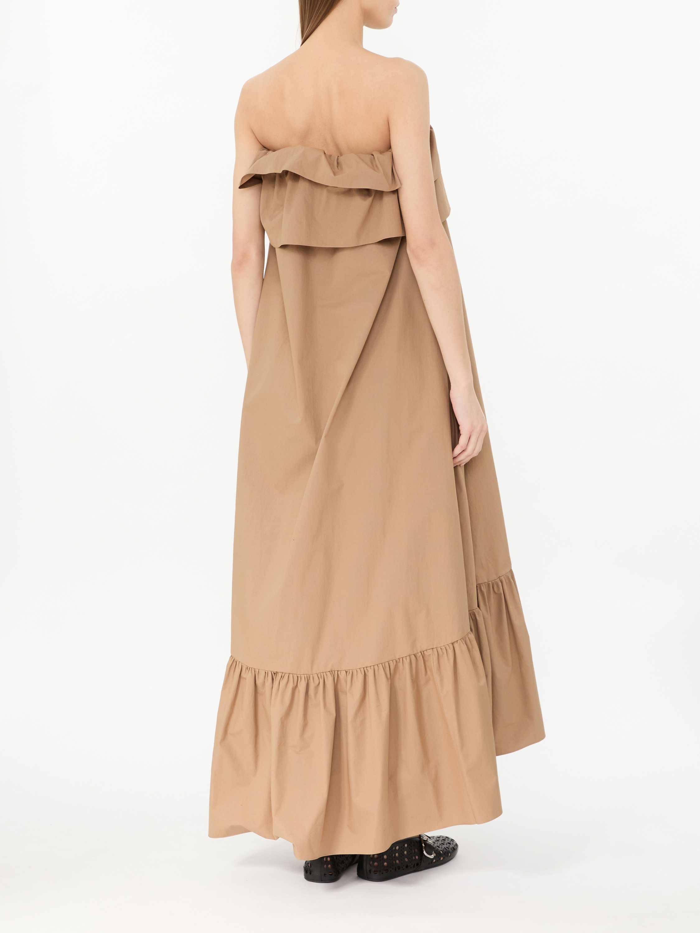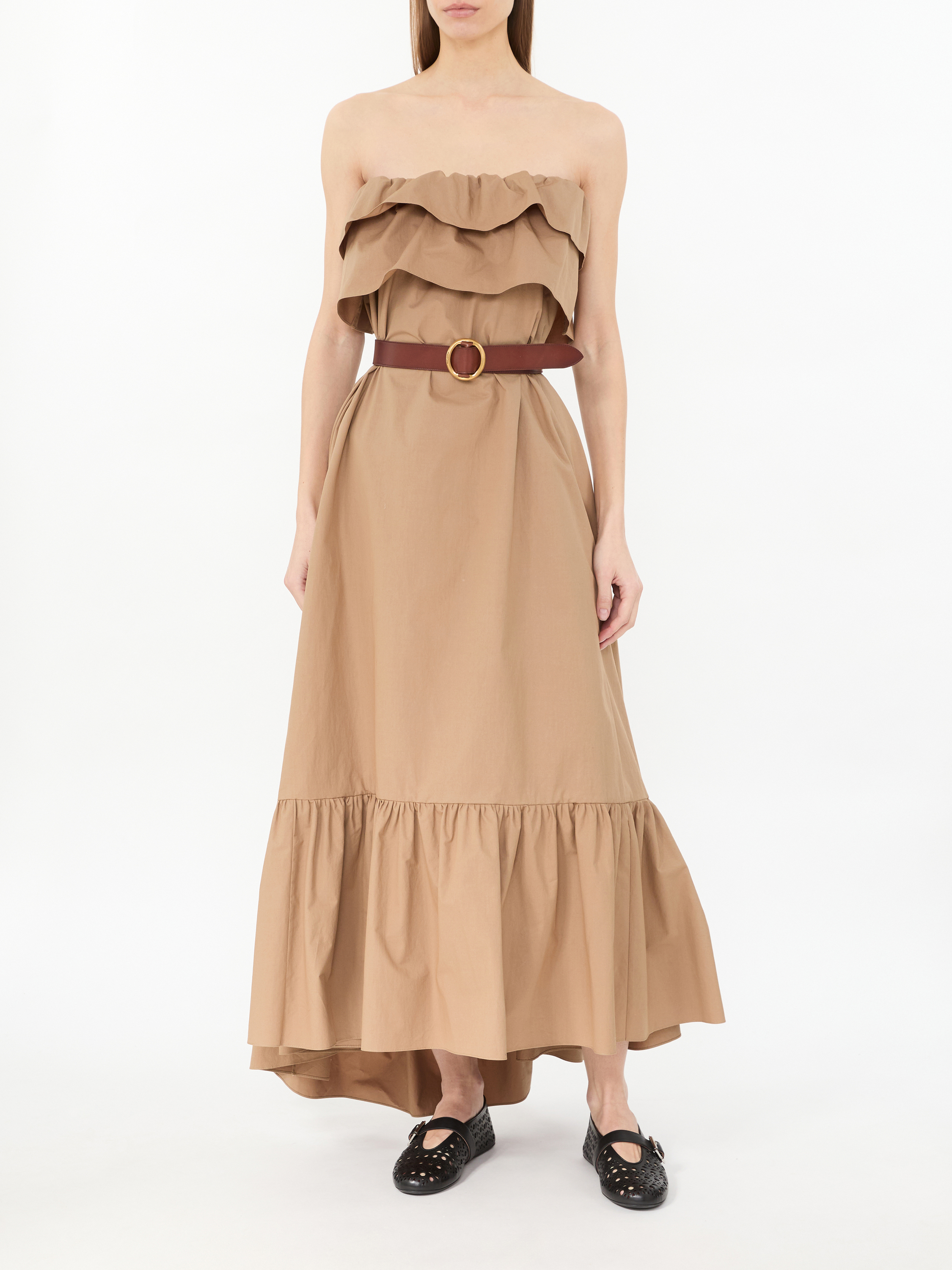 Dieses Kleid in Braun von Saint Laurent wurde aus Baumwolle gefertigt und besticht durch die Rüschen-Details. Der leicht ausgestellte Schnitt, die zwei Eingrifftaschen und die Gürtelschlaufen zeichnen dieses Design aus.