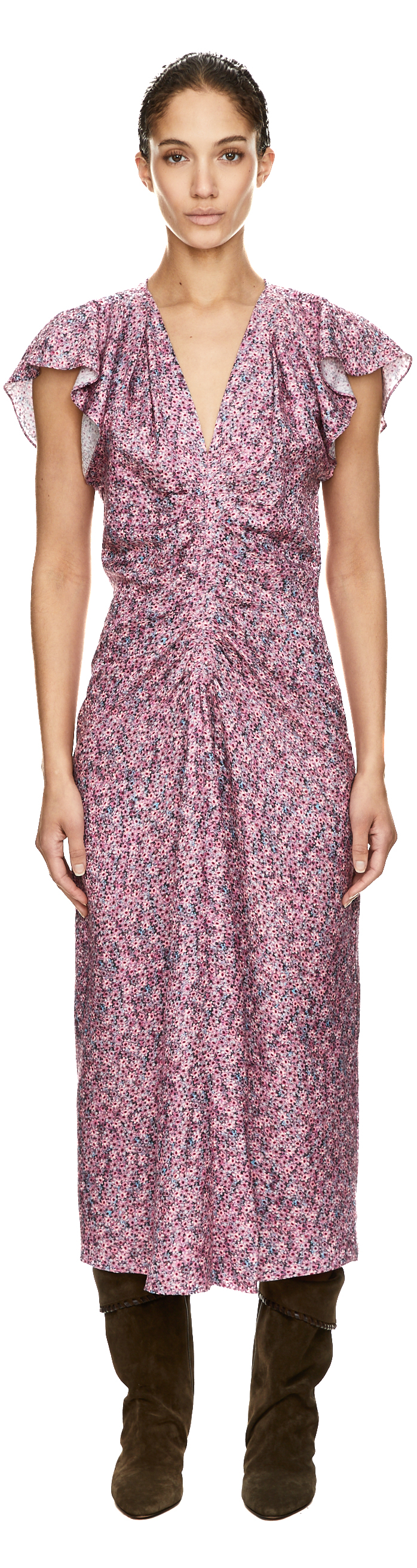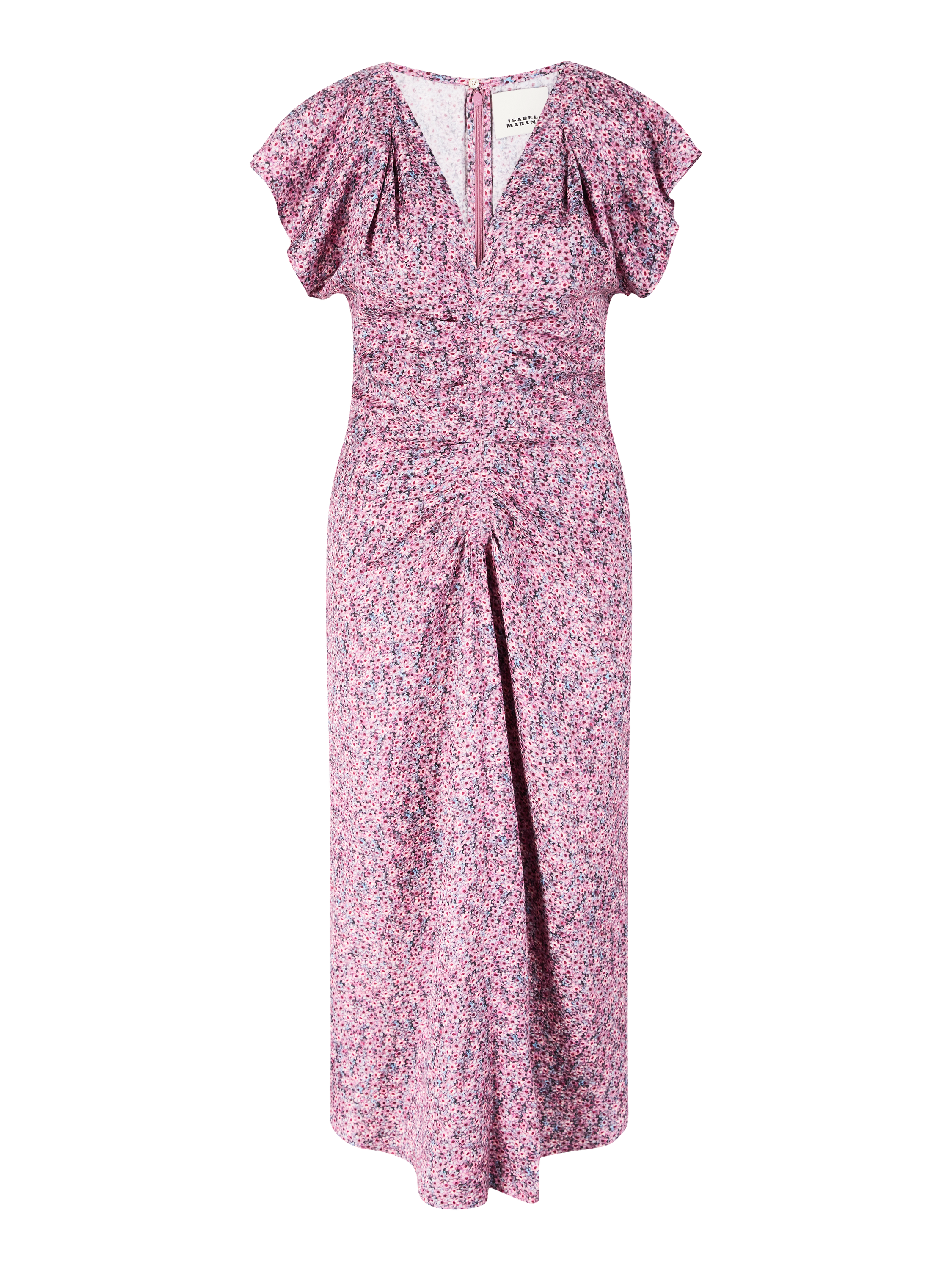 Das Kleid 'Lyndsay' in Rosa von Isabel Marant wurde aus einer hochwertigen Seidenmischung gefertigt und besticht durch die dekorativen Drapierungen. Der V-Ausschnitt mit Raffungen, die kurzen Ärmel mit breiten Schultern sowie der rückseitige, nahtfeine Reißverschluss zeichnen dieses Modell aus.