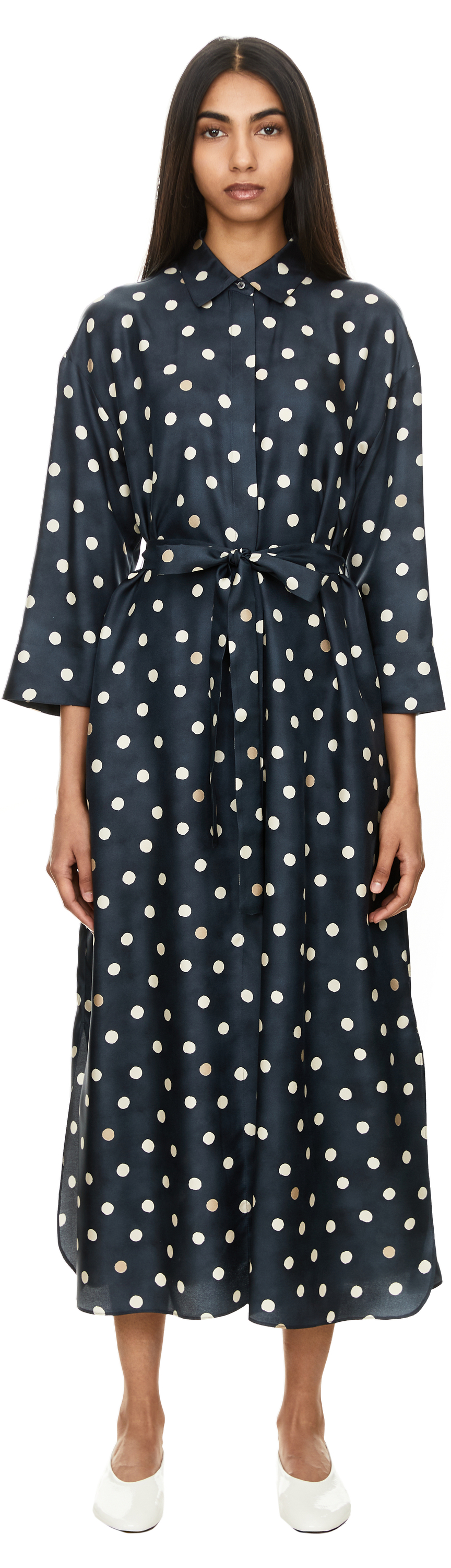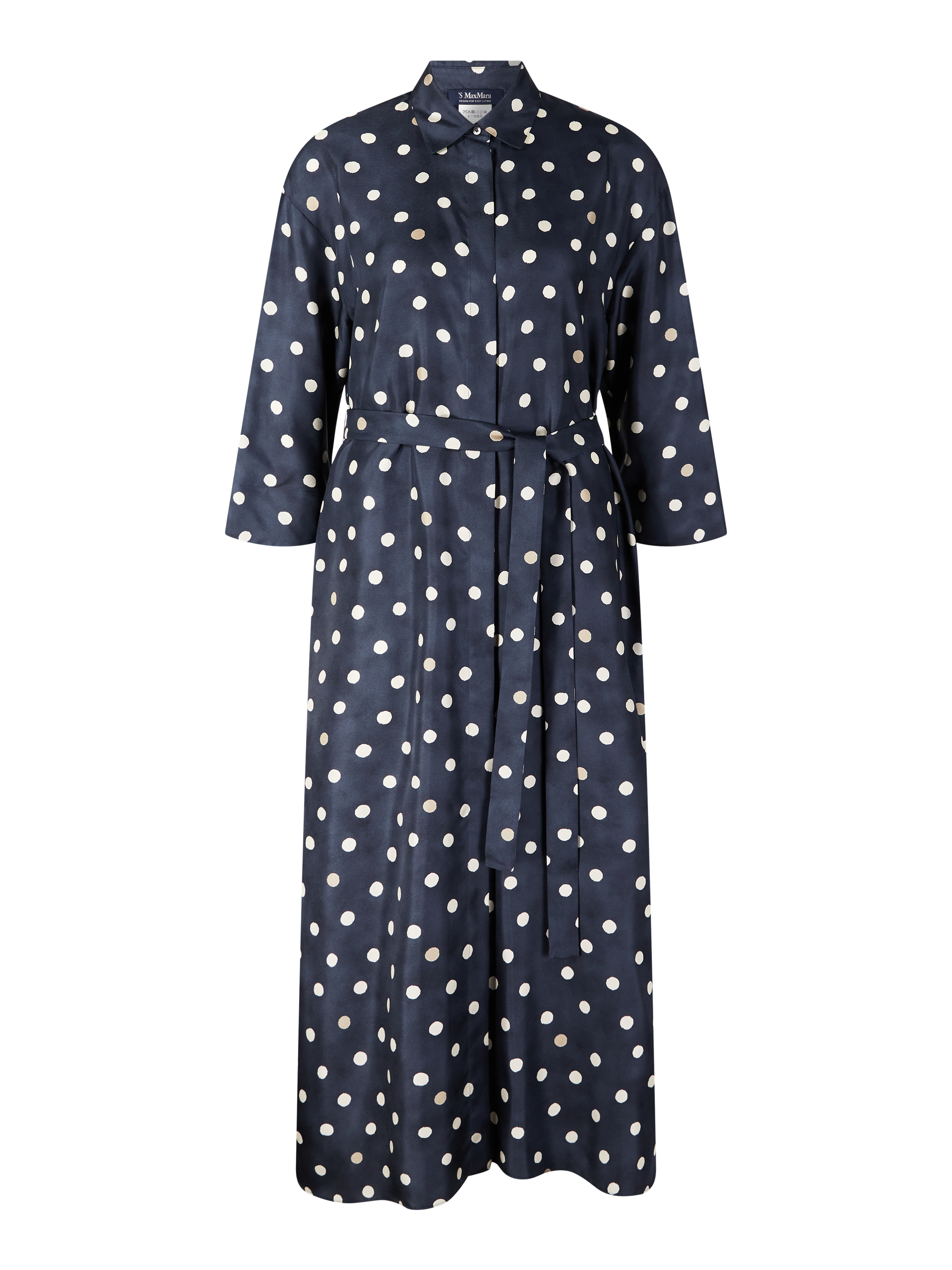 Das Kleid 'Leva' in Marineblau von ’S Max Mara wurde aus hochwertiger Seide gefertigt und besticht durch das charmante Punktemuster. Die 3/4-Ärmel und die überschnittenen Schultern verleihen dem Modell eine lässige Eleganz, während der abnehmbare Gürtel die feminine Ausstrahlung unterstreicht.