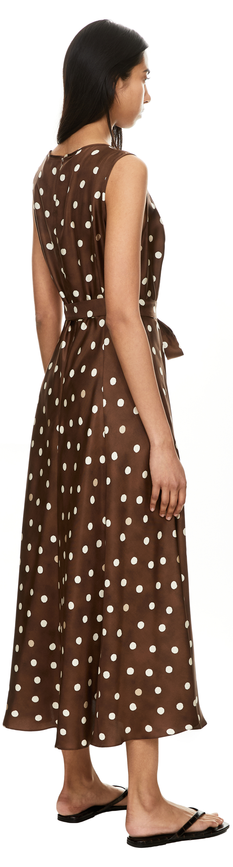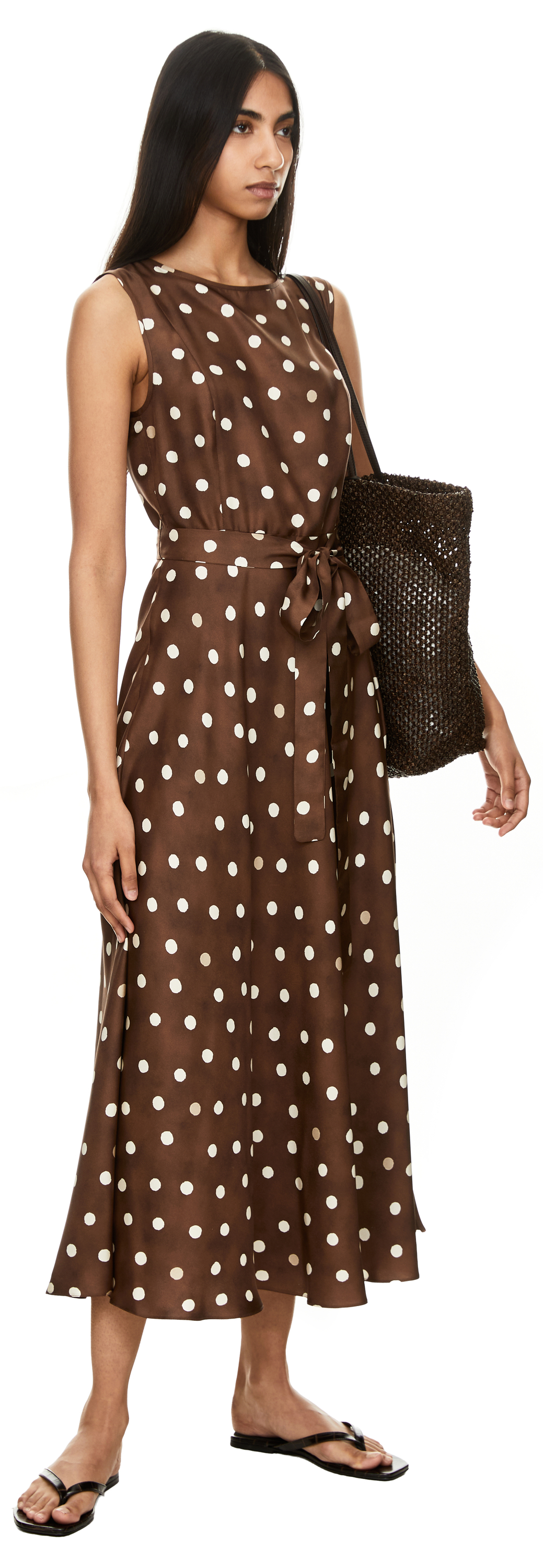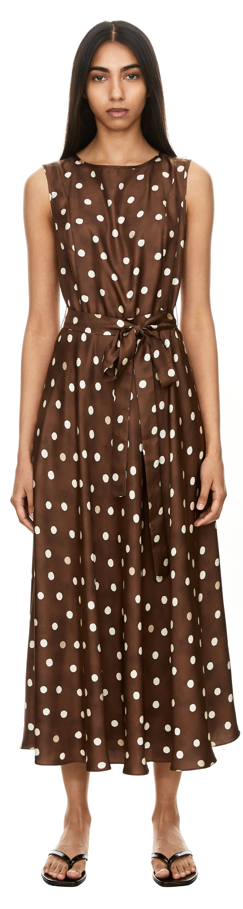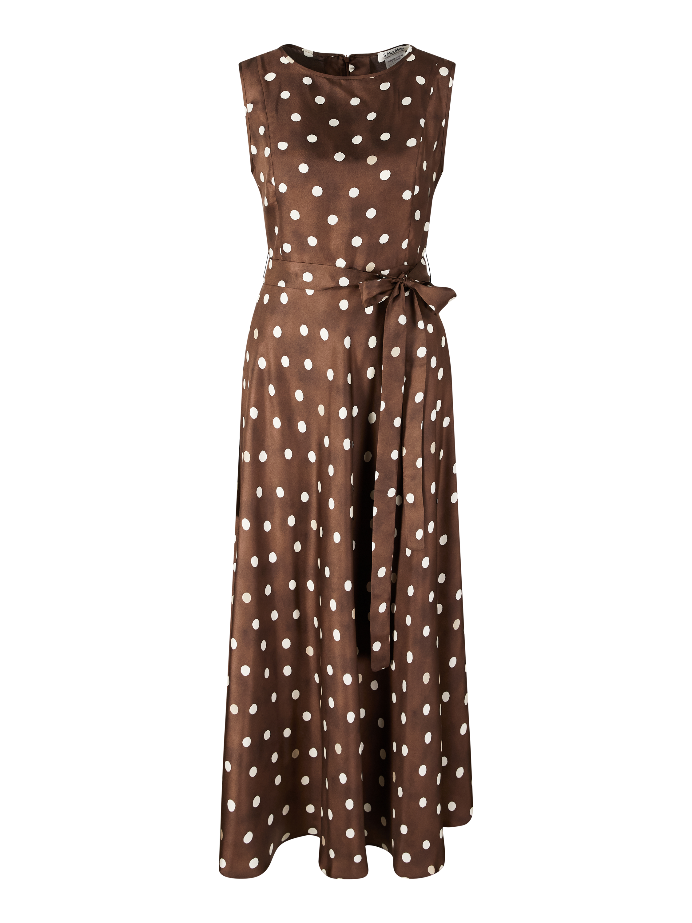 Das Kleid 'Martina' in Braun von 'S Max Mara wurde aus edler Seide gefertigt und besticht durch das gepunktete Muster. Das ärmellose Design unterstreicht die elegante Leichtigkeit des Modells. Der abnehmbare Bindegürtel sorgt für eine taillierte Passform und betont die feminine Silhouette.