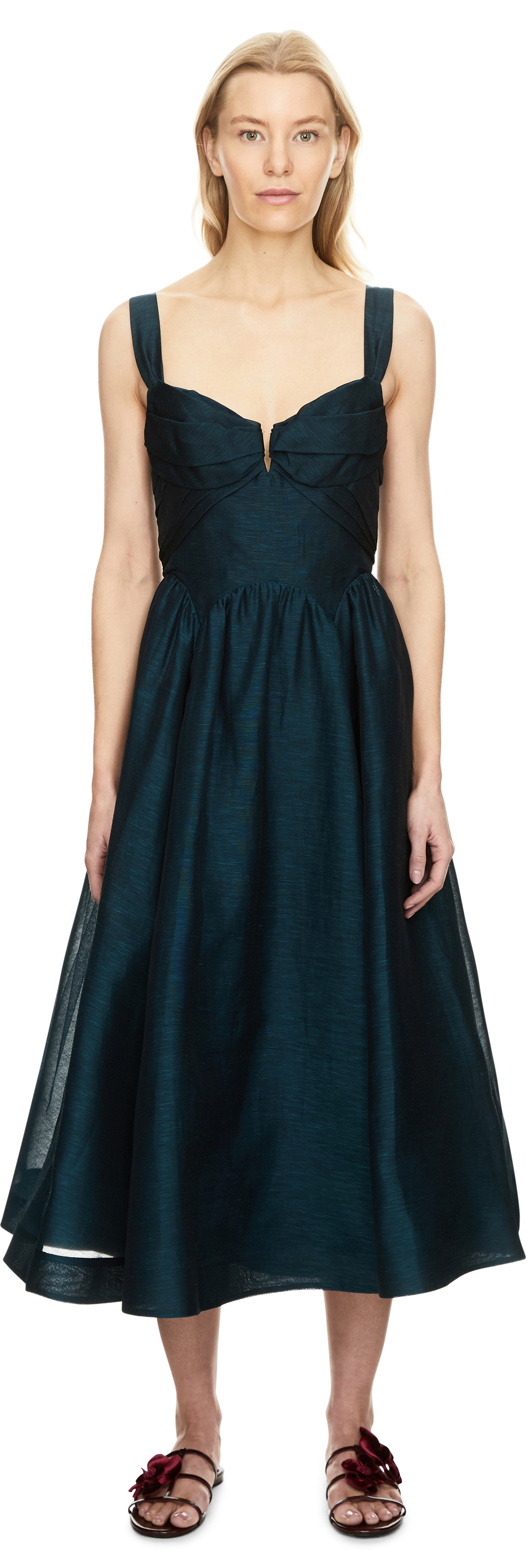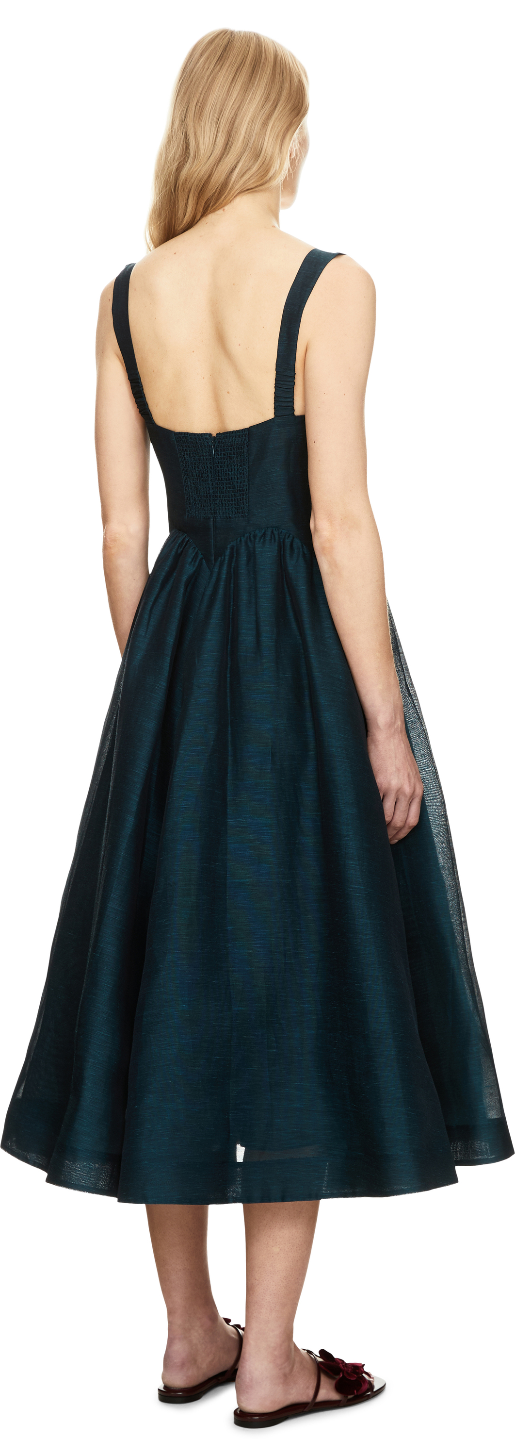Das Midikleid 'Rebellion Drape' in Indigo von Zimmermann wurde aus einer hochwertigen Leinen-Seidenmischung gefertigt und besticht durch den herzförmigen Ausschnitt. Die Drapierung am Dekolleté, der weit ausgestellte Rock, der verdeckte Reißverschluss auf der Rückseite sowie das Brustteil mit innenliegenden Stäben verleihen dem Kleid eine elegante und feminine Silhouette.