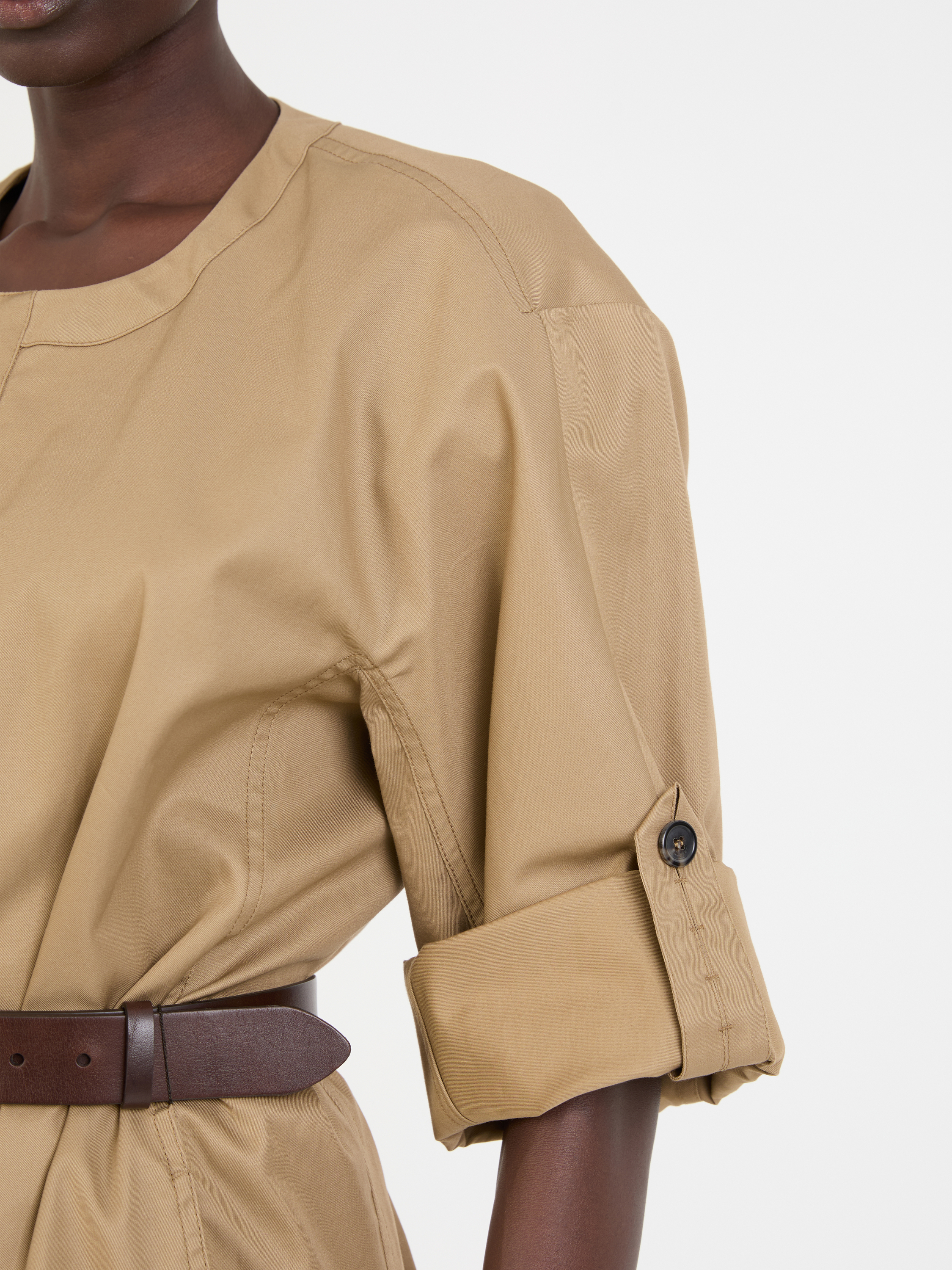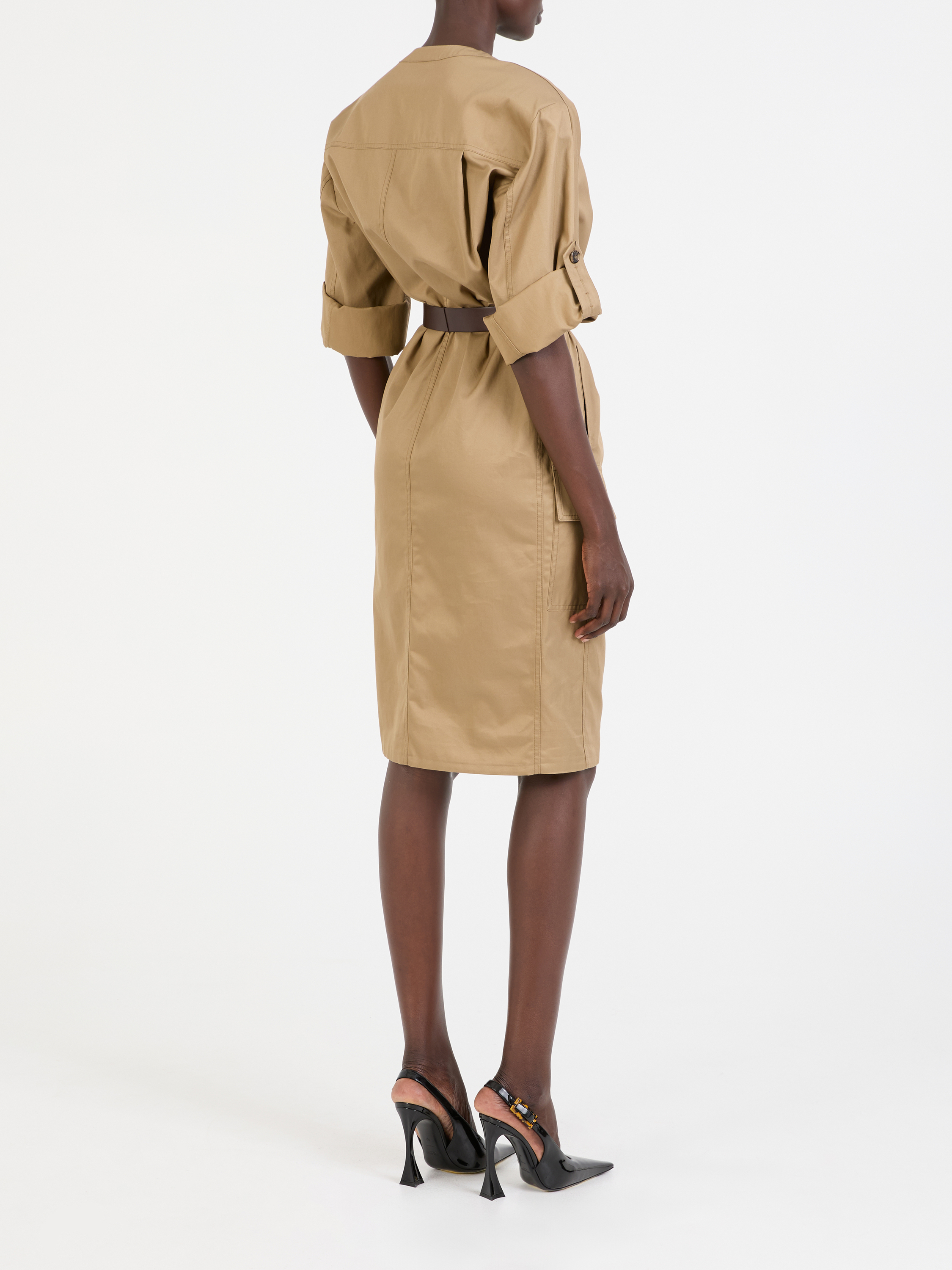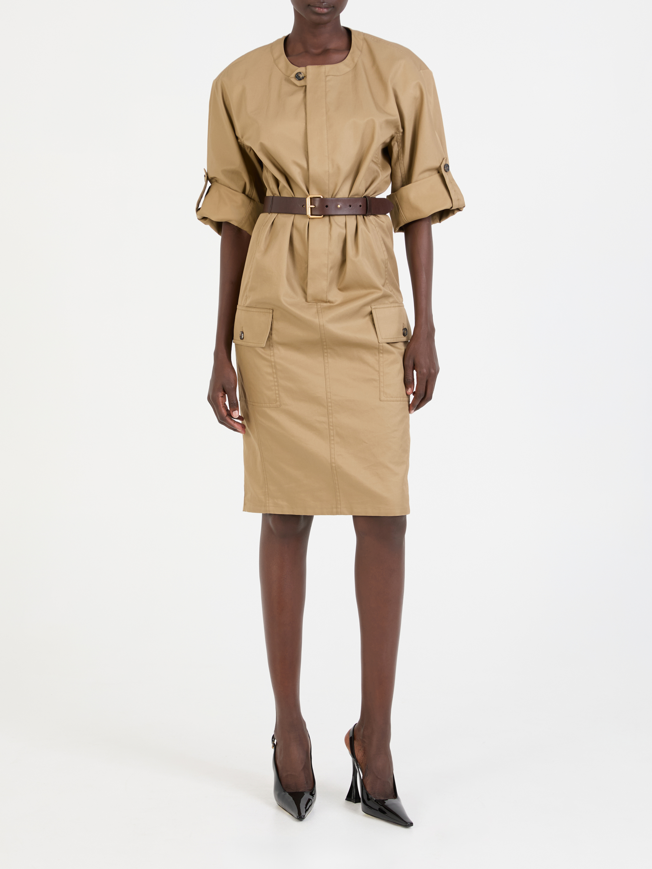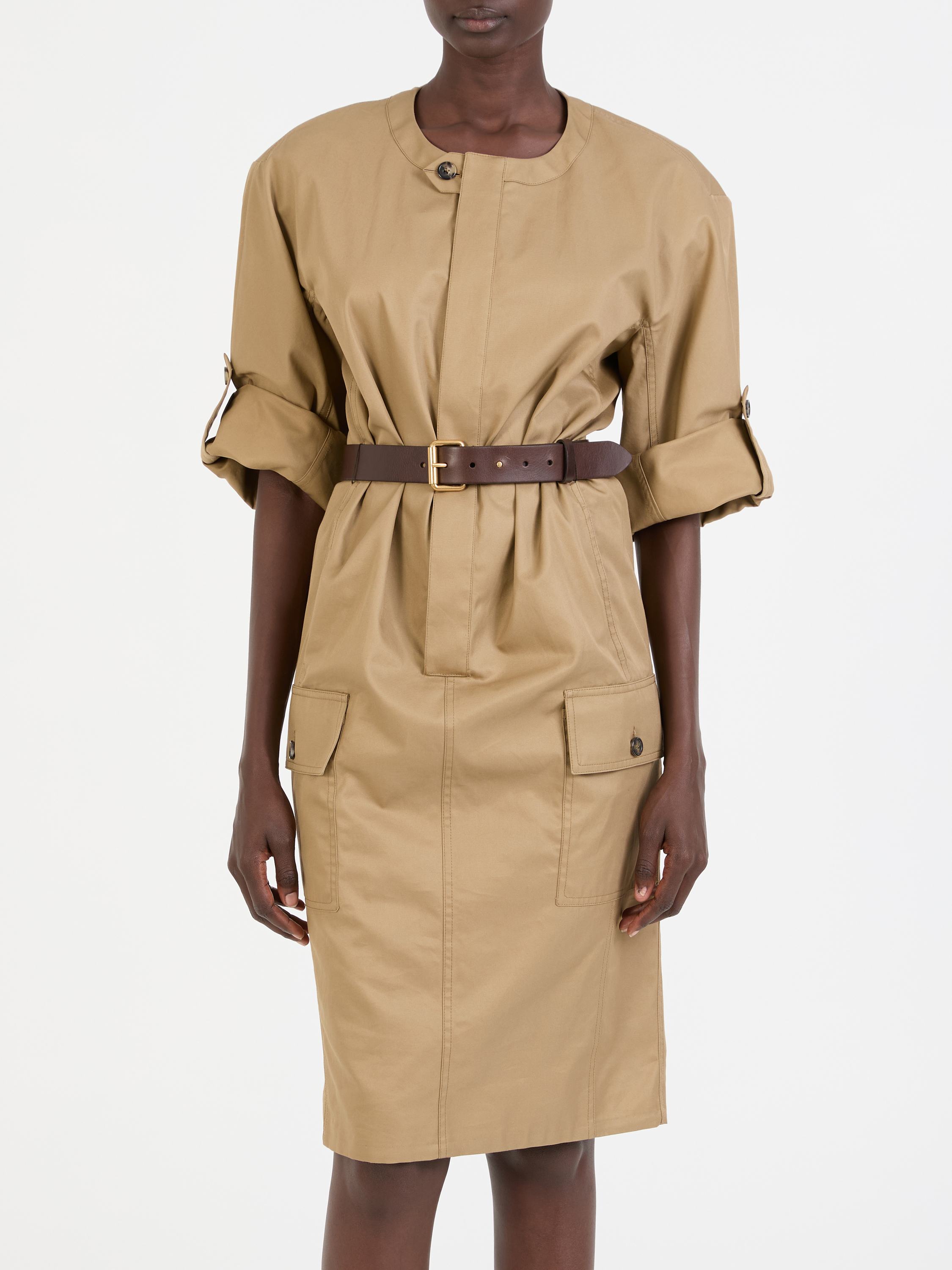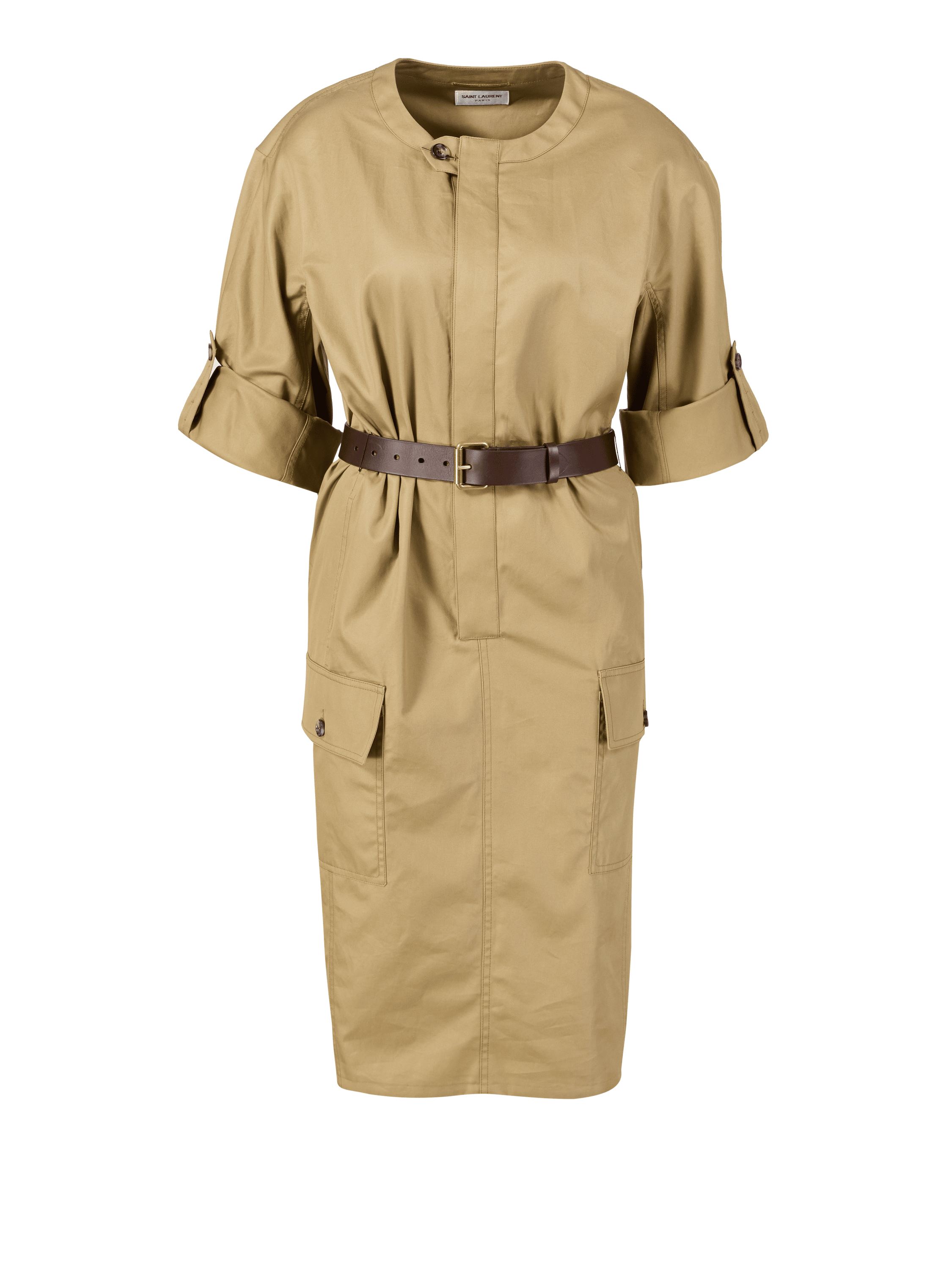 Dieses Kleid in Beige von Saint Laurent wurde aus einem hochwertigen Baumwoll-Twill gefertigt und besticht durch die Midilänge. Der verdeckte Knopfverschluss, der abnehmbare Gürtel und der runde Halsausschnitt machen dieses Modell zu einem wahren Klassiker. Die umgeschlagenen Ärmel und die markanten Riegel vollenden dieses Design.