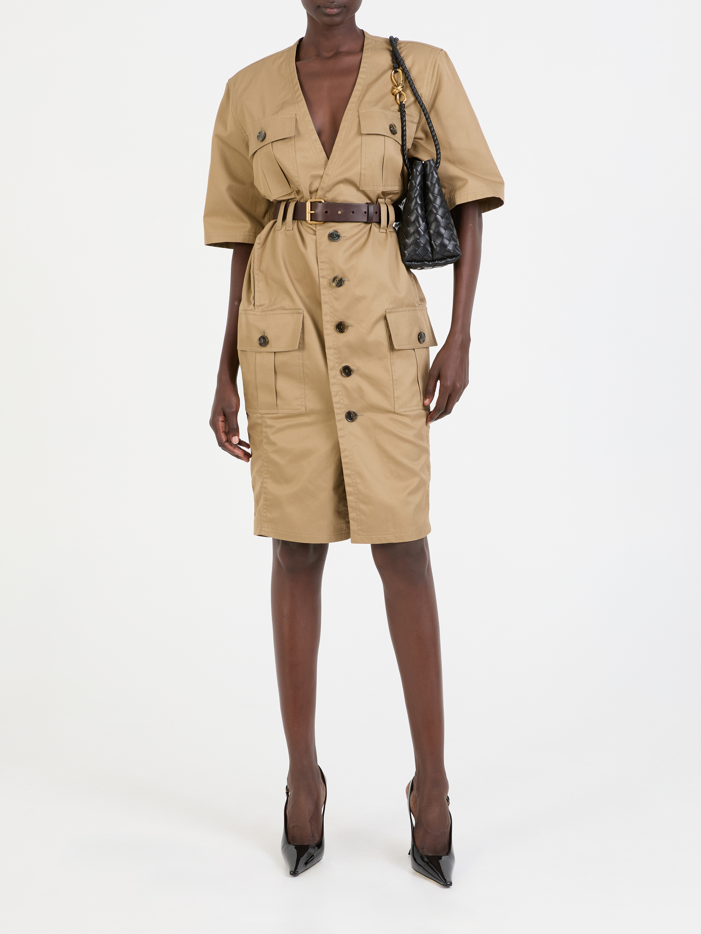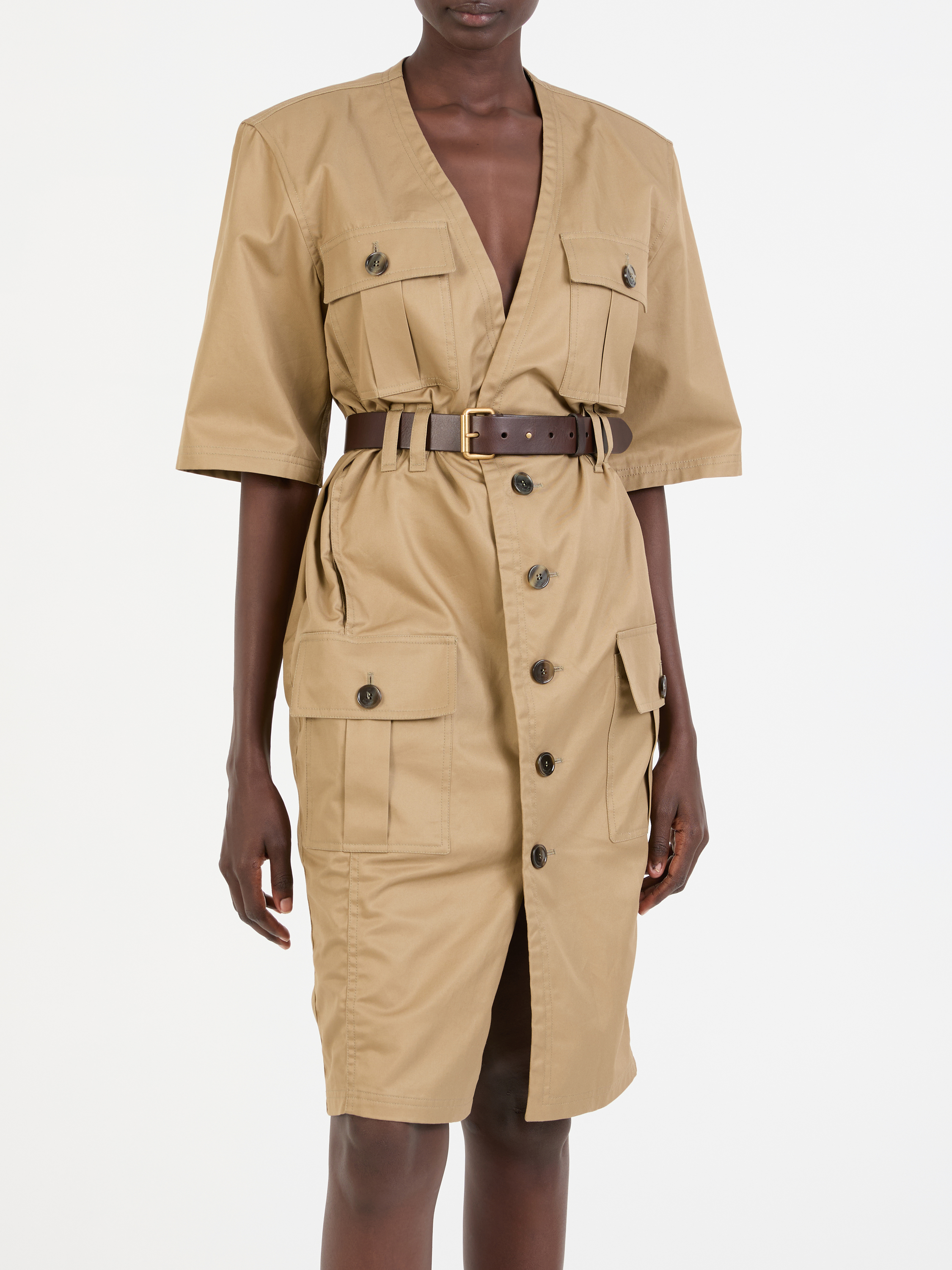 Dieses Midikleid in Braun von Saint Laurent wurde aus einem hochwertigen Baumwoll-Twill gefertigt und besticht durch die Midilänge. Die frontale Knopfleiste, der Gürtel und der tiefe V-Ausschnitt machen dieses Modell zu einem wahren Klassiker. Die kurzen Ärmel und die markanten Gürtelschlaufen vollenden dieses Design.