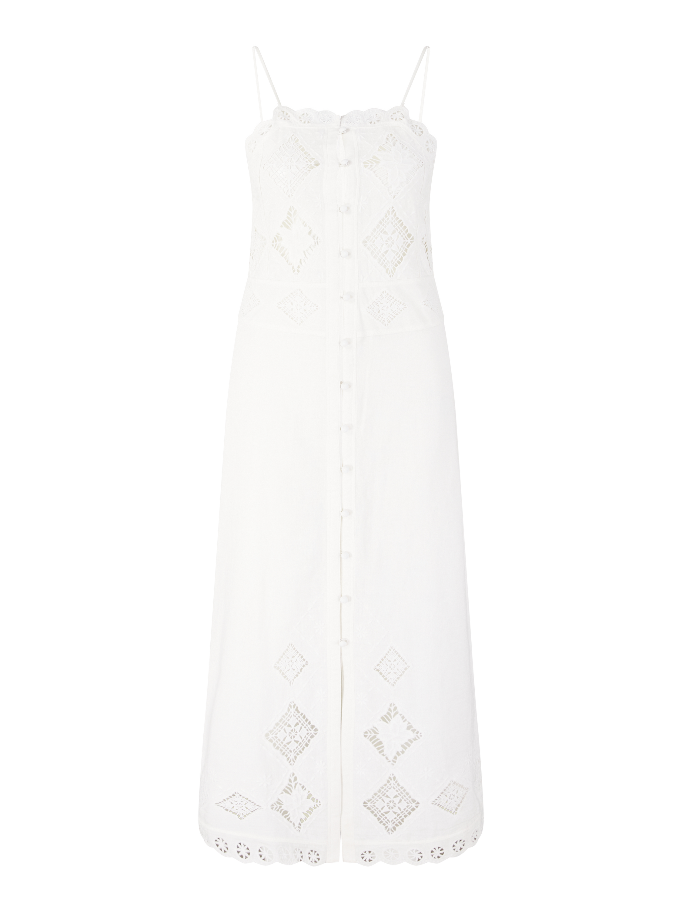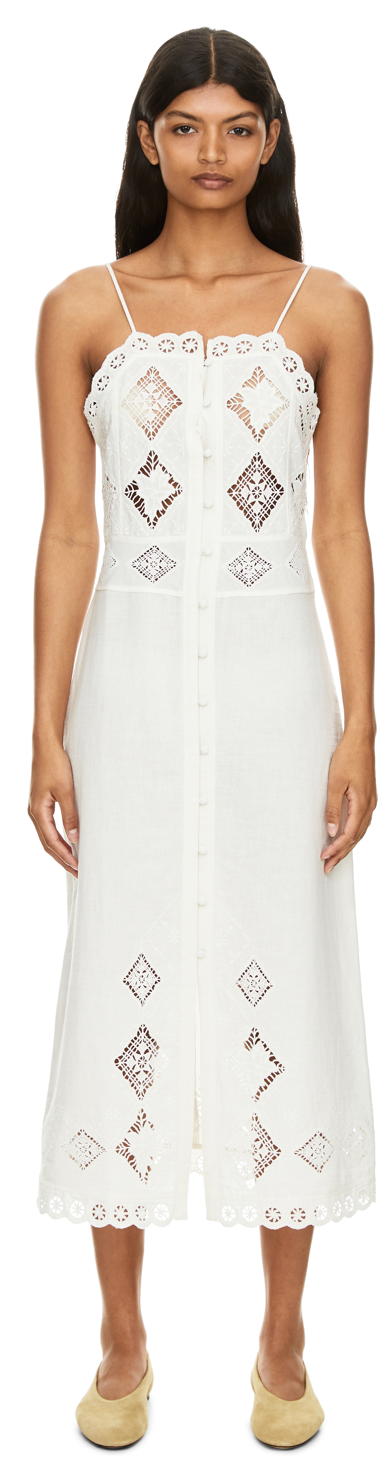 Das Kleid 'Nelsane' in Crème von Isabel Marant wurde aus einer hochwertigen Baumwoll-Leinenmischung gefertigt und besticht durch das raffinierte Lochmuster entlang des Modells. Die Vorderseite ziert eine durchgehende, stoffbezogene Knopfleiste mit Schlitz am Saum. Die schmalen Träger und die Midilänge unterstreichen die leichte, sommerliche Ausstrahlung und runden das Modell perfekt ab.