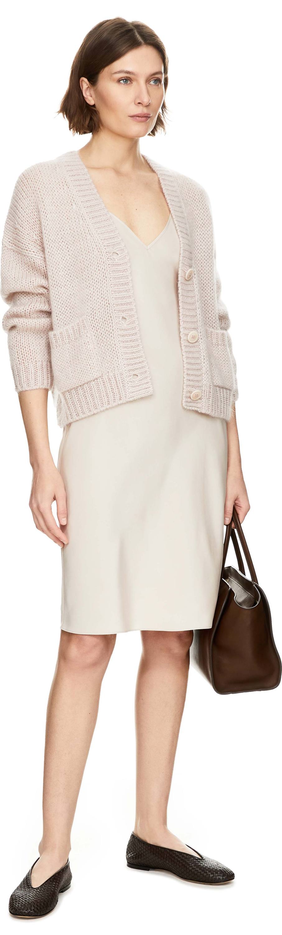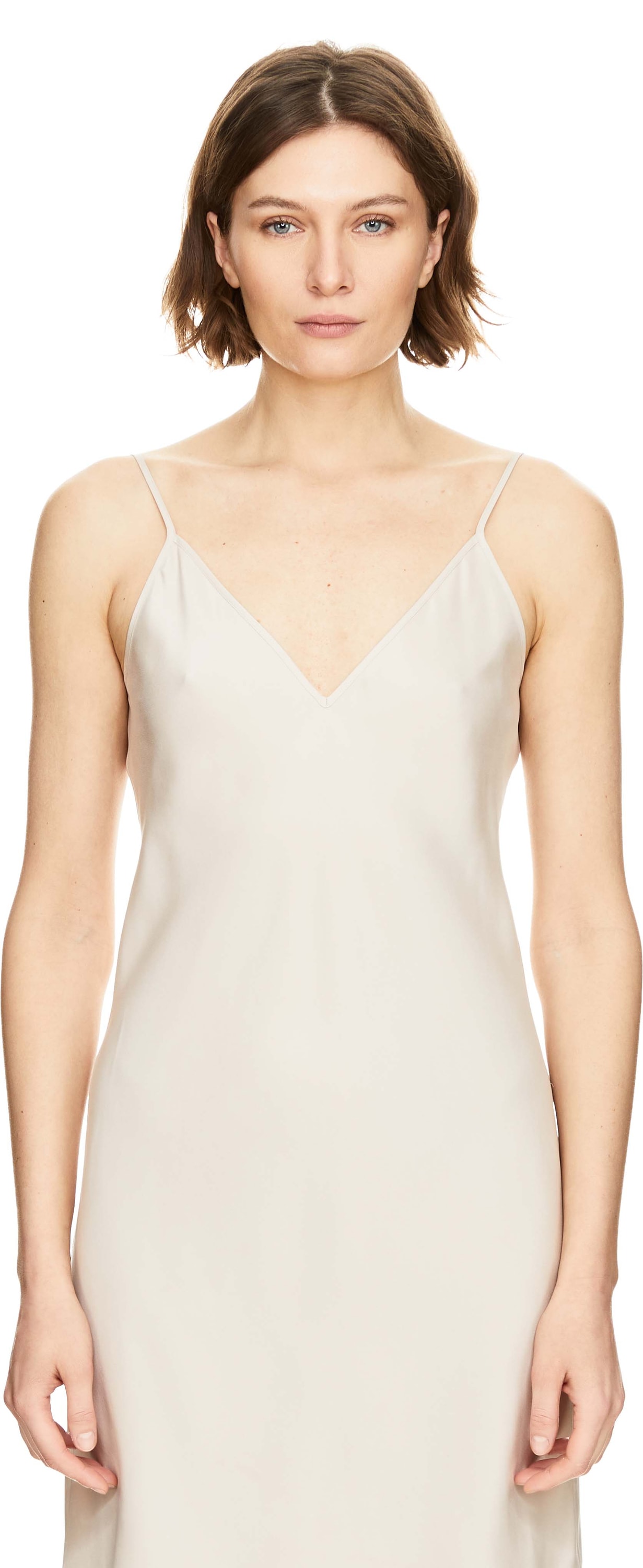 Das Kleid 'Tirana' in Alabaster von Iris von Arnim wurde aus hochwertiger Seide gefertigt und besticht durch die fließende Silhouette. Der V-Ausschnitt und die schmalen Träger unterstreichen die feminine Note, während der knielange Schnitt das Modell zu einem vielseitigen und sommerlichen Begleiter macht.