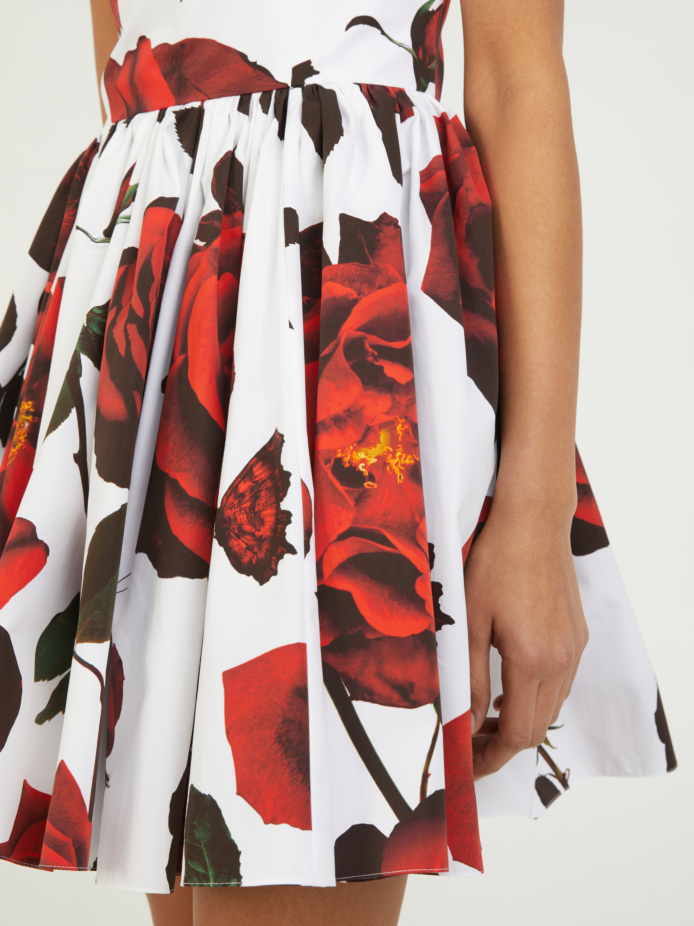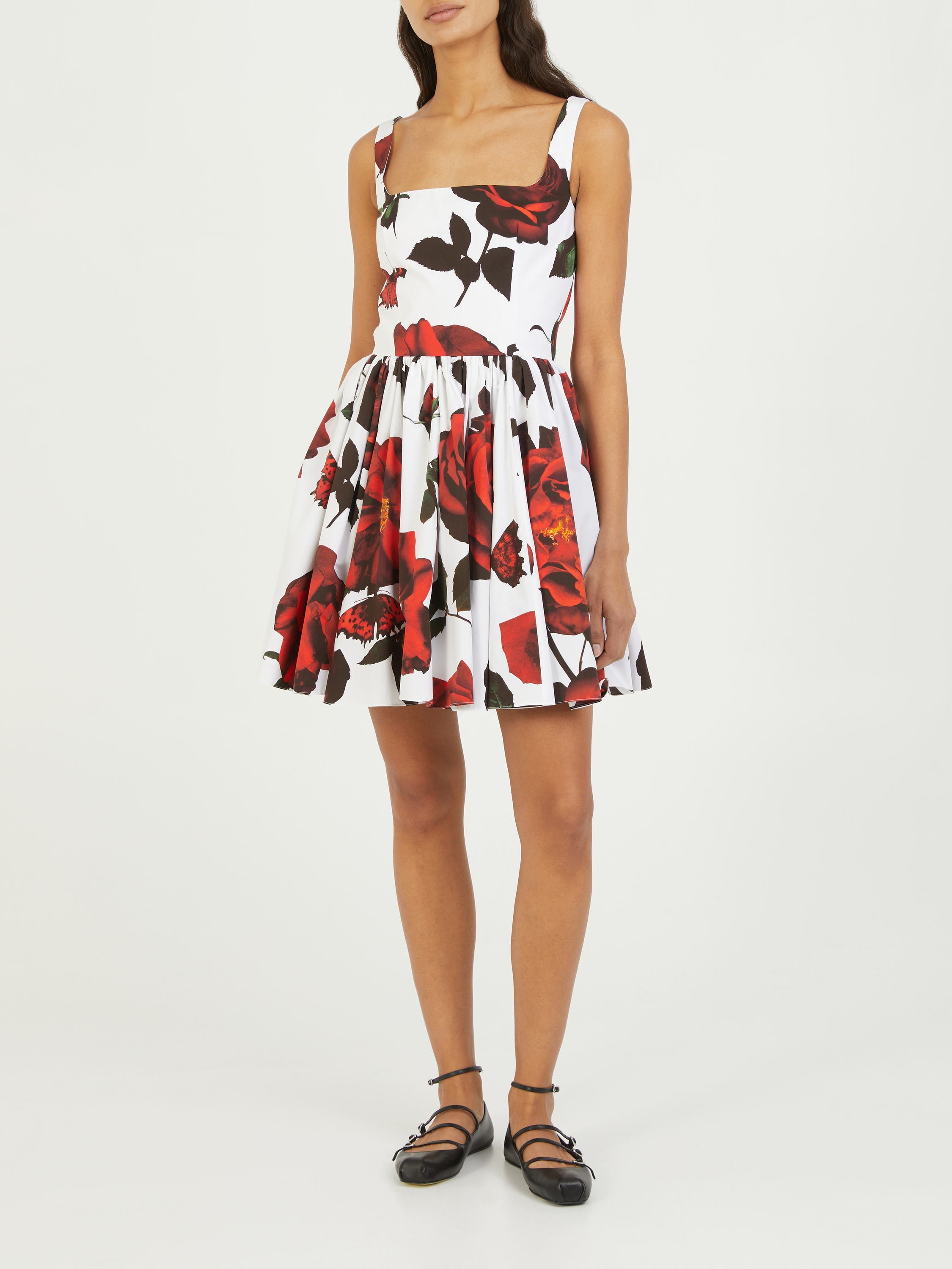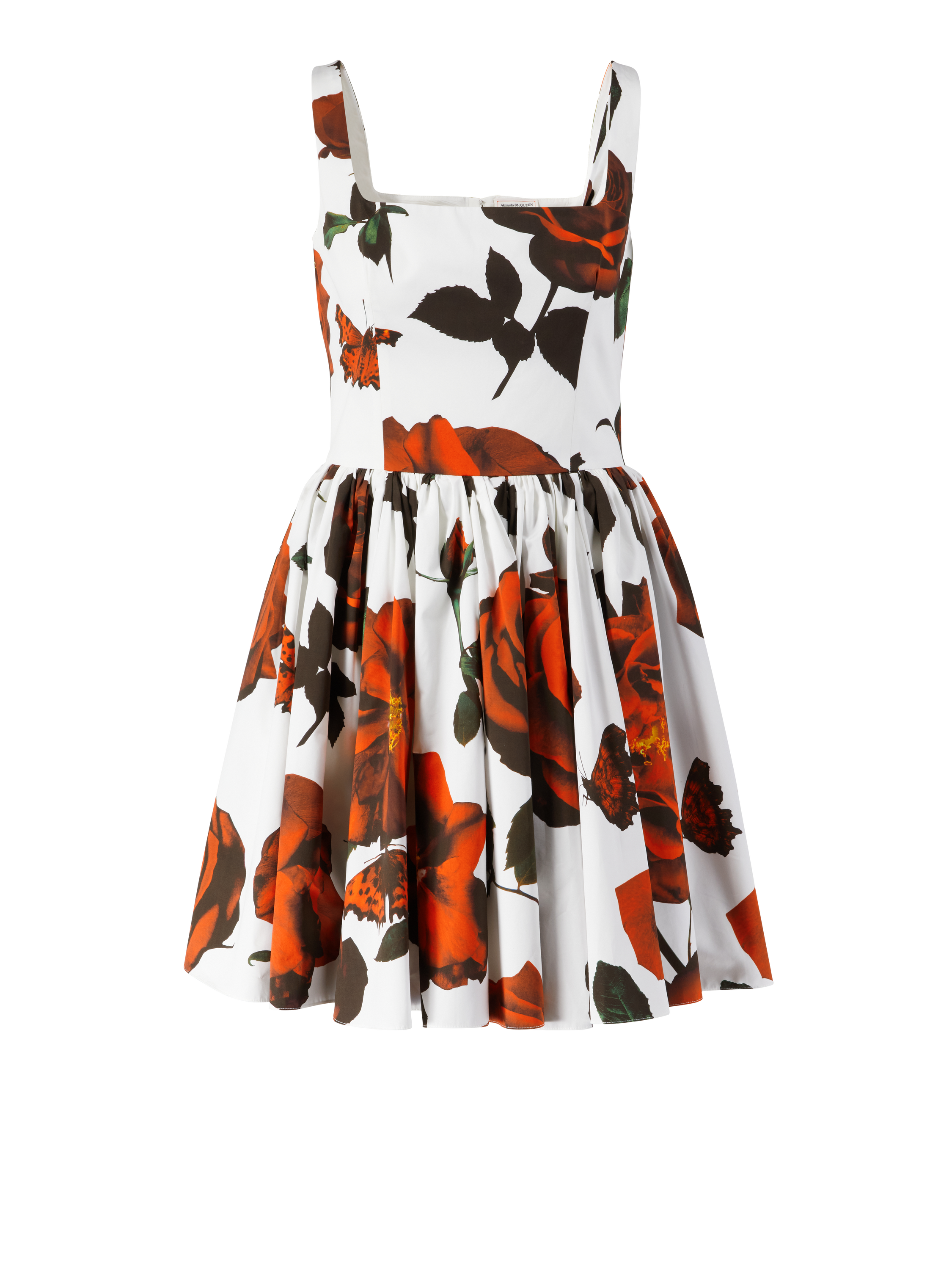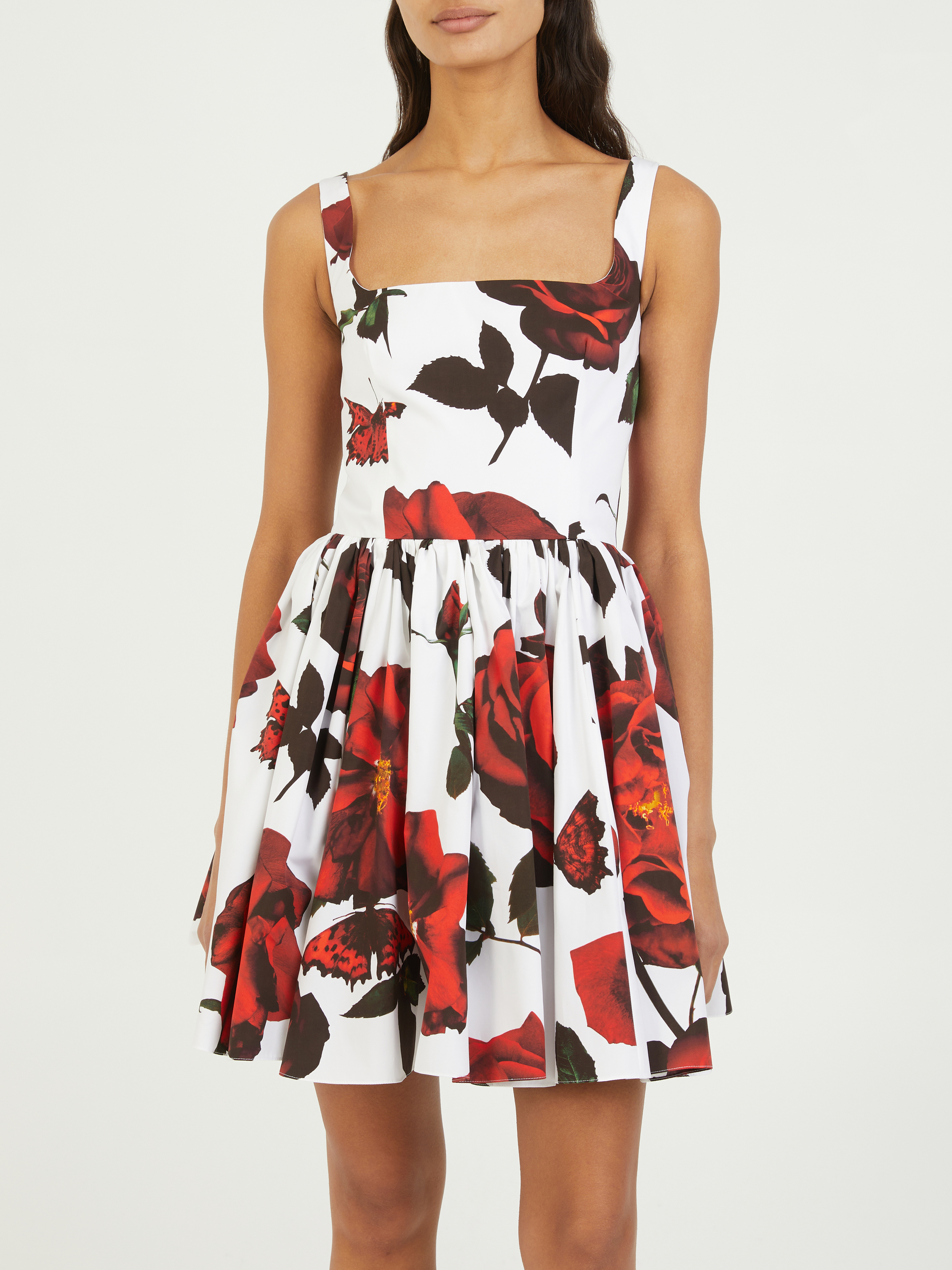 Dieses Kleid in Rot von Alexander McQueen wurde aus reiner Baumwolle gefertigt und besticht durch einen Tudor-Rose-Print. Die taillierte Passform, der ausgestellte Rock und die schmalen Träger zeichnen das elegante Design aus.