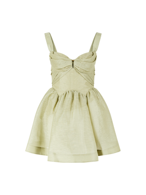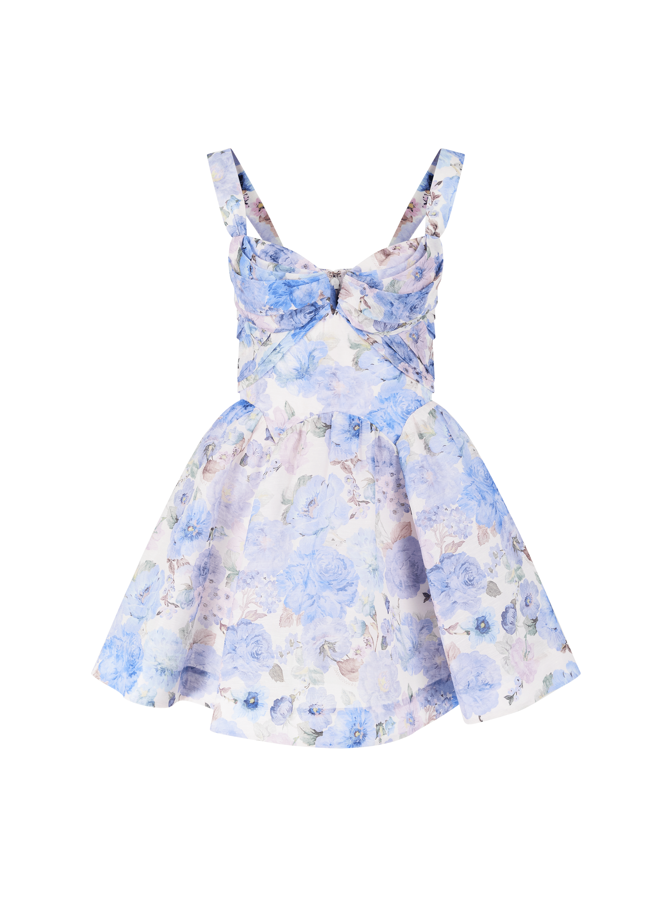 Das Minikleid 'Rebellion' in Blau von Zimmermann wurde aus einer hochwertigen Leinen-Seidenmischung gefertigt und besticht durch den herzförmigen Ausschnitt. Die Drapierung am Dekolleté, der weit ausgestellte Rock, der verdeckte Reißverschluss auf der Rückseite sowie das Brustteil mit innenliegenden Stäben verleihen dem Kleid eine elegante und feminine Silhouette.