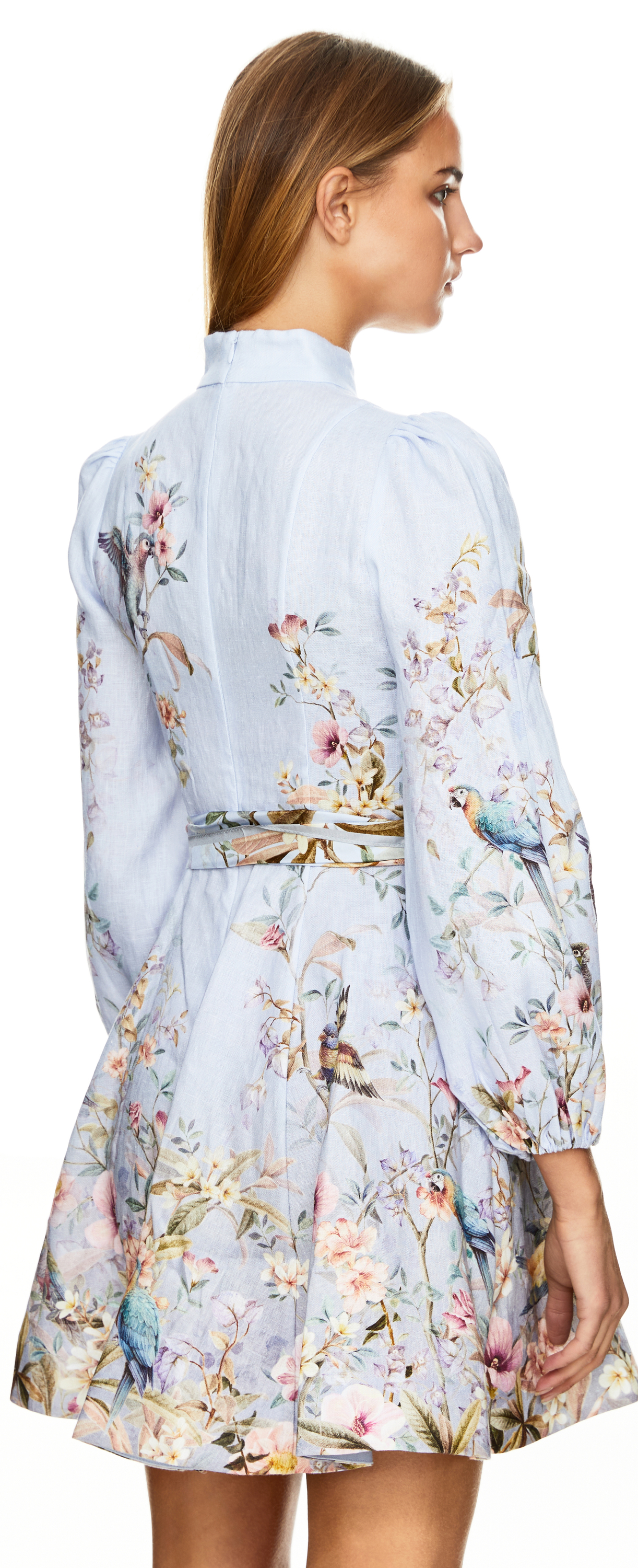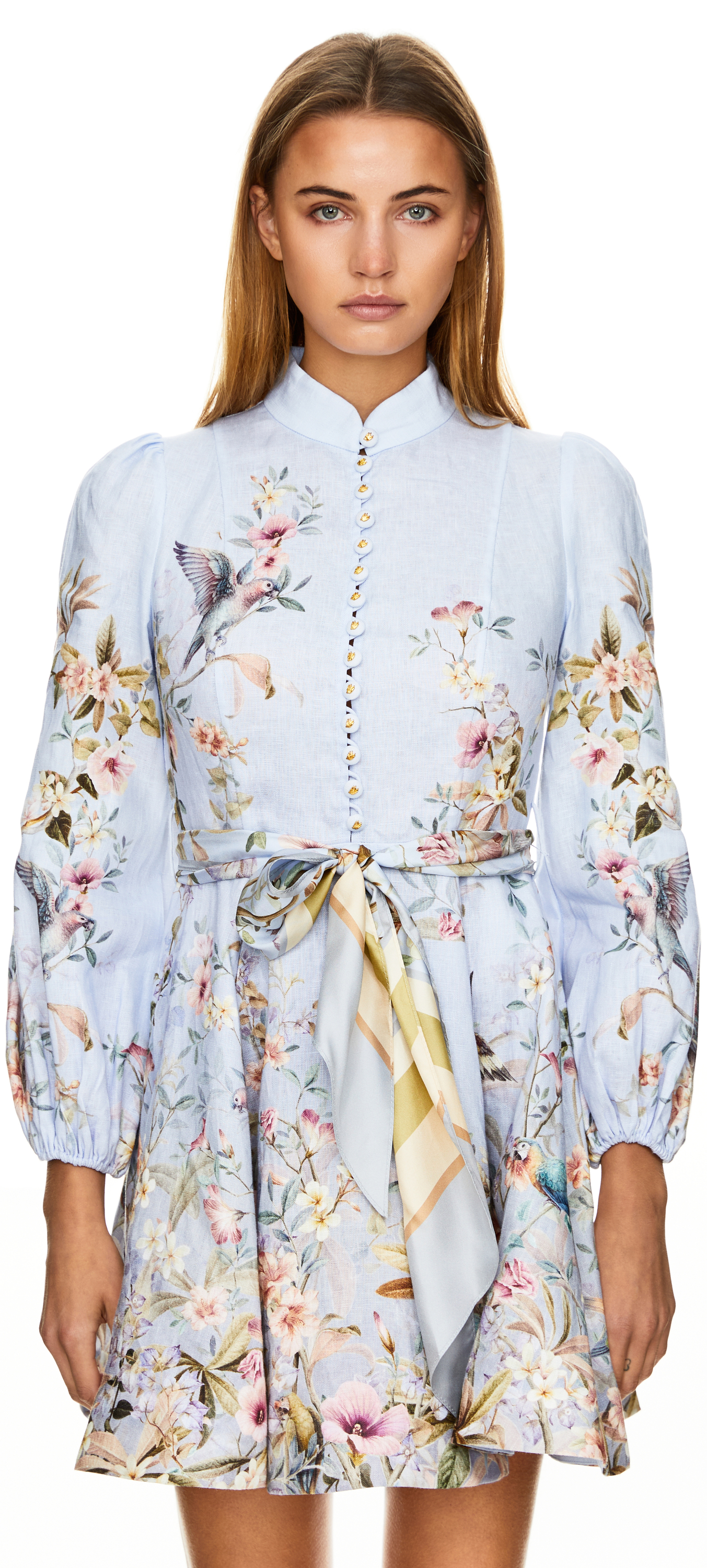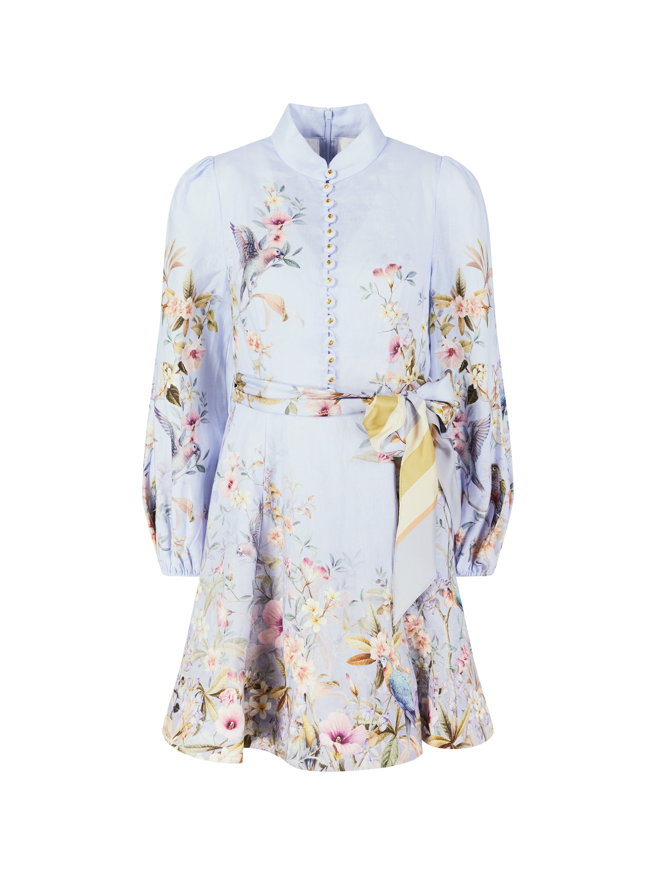 Das Kleid 'Rebellion' in Hellblau von Zimmermann wurde aus reinem Leinen gefertigt und besticht durch die charakteristische florale Musterung. Der Stehkragen, die langen Blousonärmel mit elastischen Bündchen, der abnehmbare Schalgürtel sowie die Rouleau-Knöpfe machen das Modell zu einem sommerlichen Hingucker.