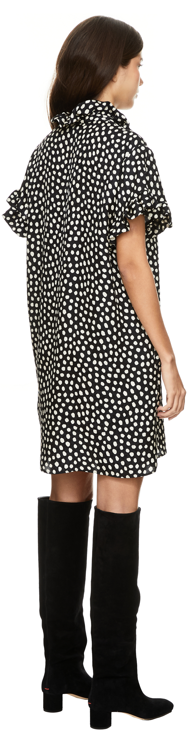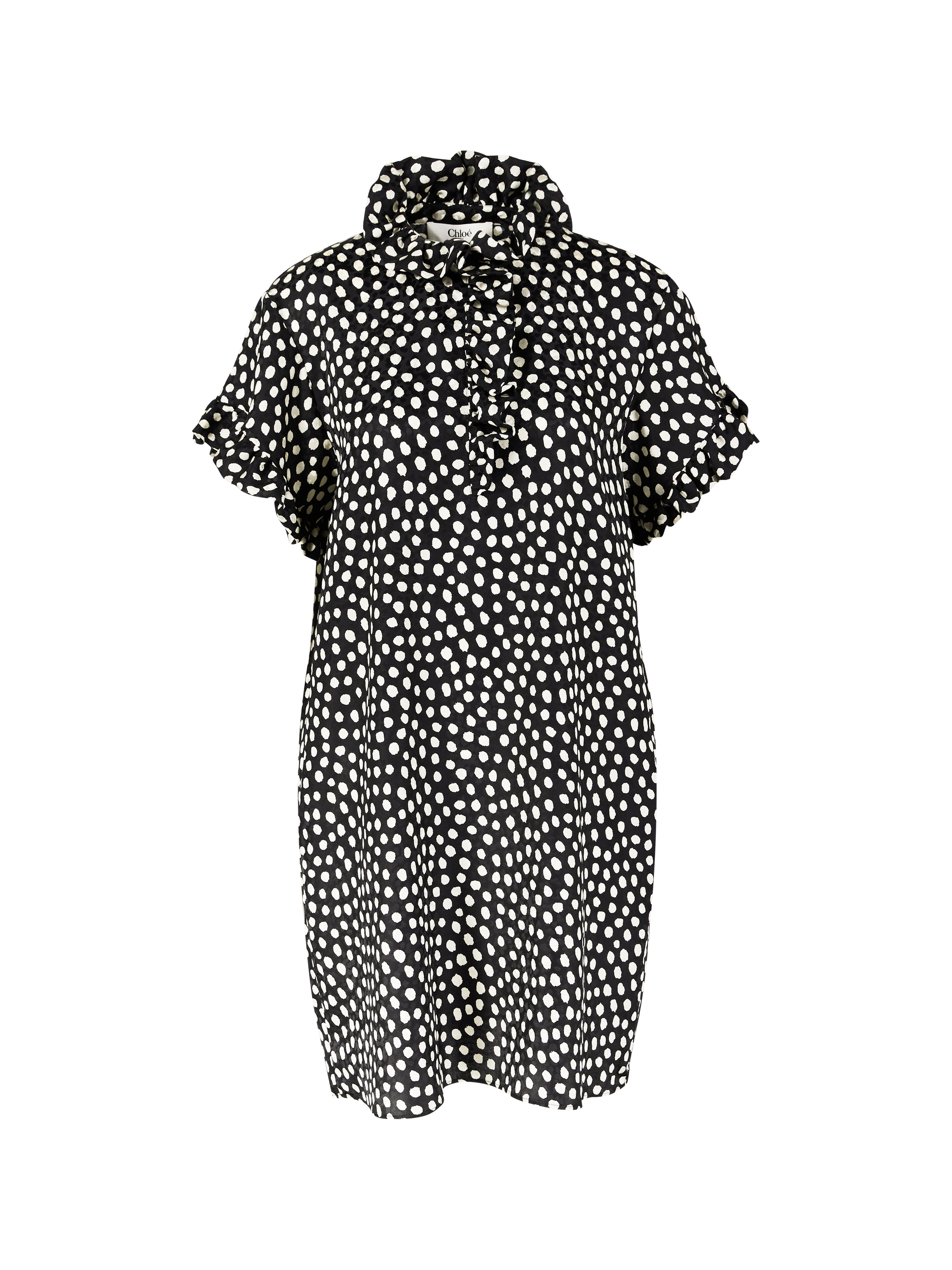 Dieses Kleid in Schwarz/Beige von Chloé wurde aus reiner Seide gefertigt und besticht durch das verspielte gepunktete Muster. Die fließende Silhouette umspielt sanft die Figur, während Rüscheneinsätze für eine feminine Note sorgen. Kurze Ärmel und seitliche Eingrifftaschen verleihen dem Modell Leichtigkeit und Raffinesse.