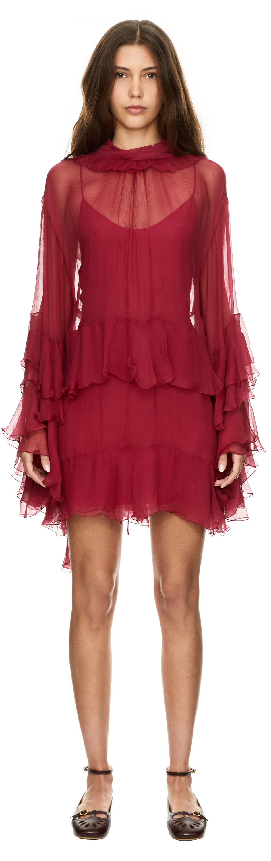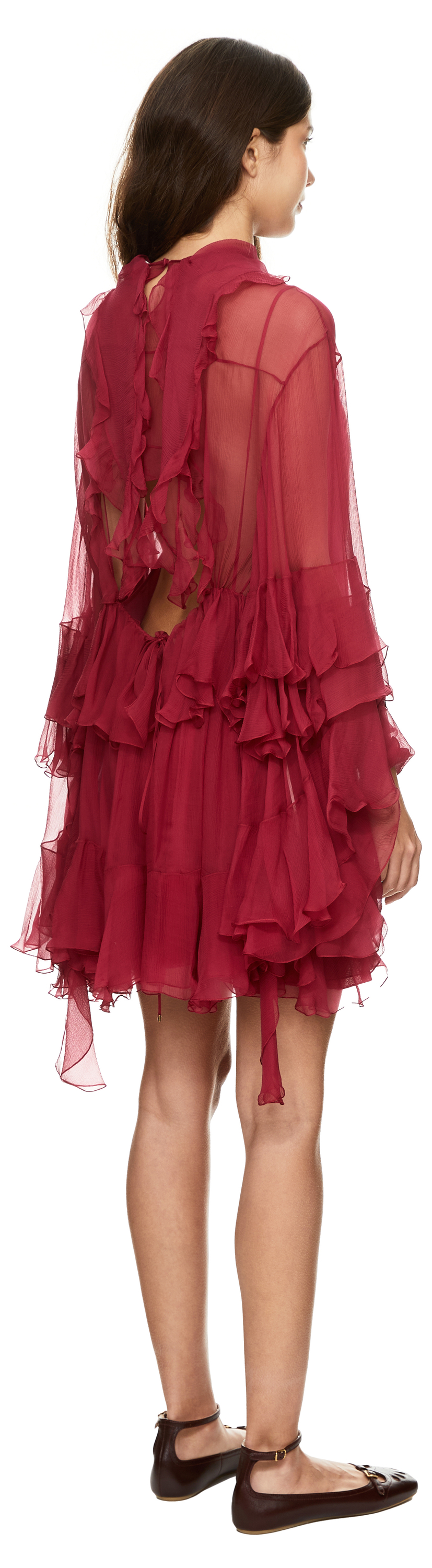 Dieses Kleid in Pink von Chloé wurde aus reiner Seide gefertigt und besticht durch die voluminöse Silhouette mit dekorativen Rüschen entlang des Designs. Der hochgeschlossene Kragen in Kombination mit dem raffinierten Cut-Out am Rücken verleiht dem Modell einen raffinierten Look. Der rückseitige Knopfverschluss am Hals und das abnehmbare Untertop runden das Design funktional ab.