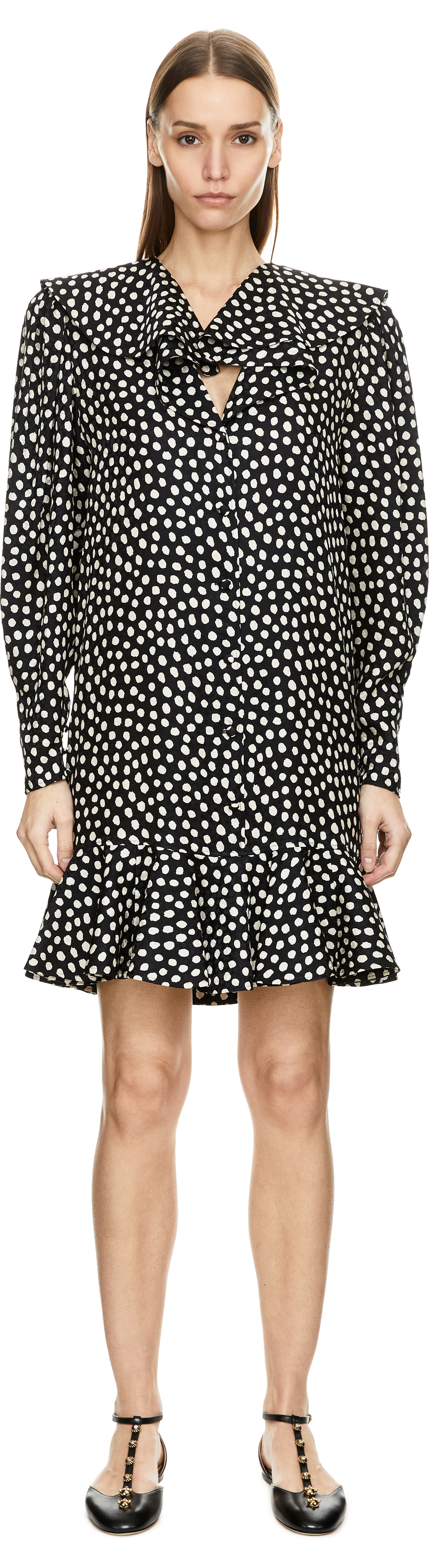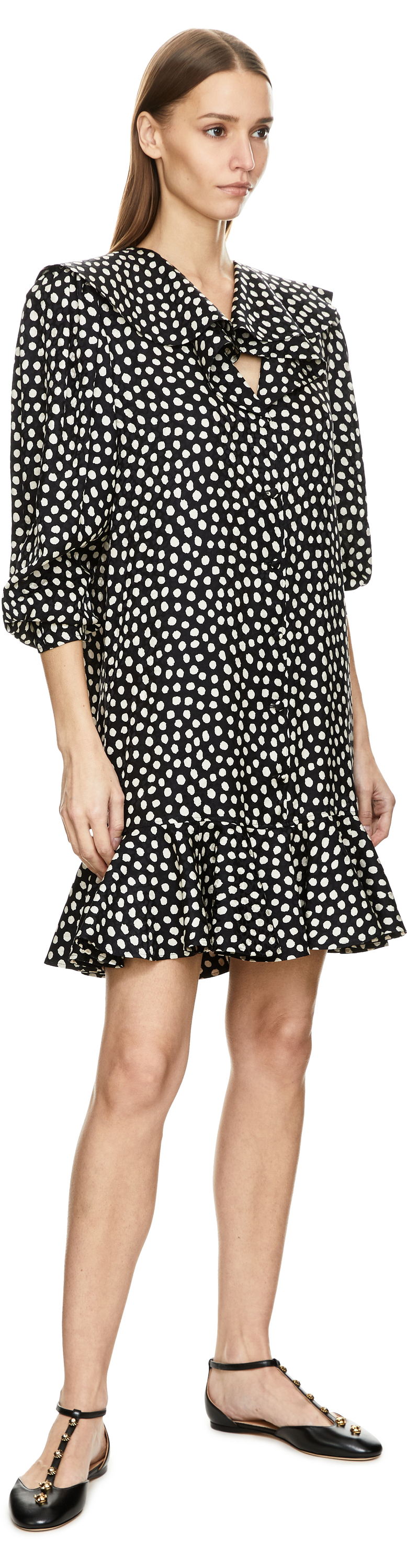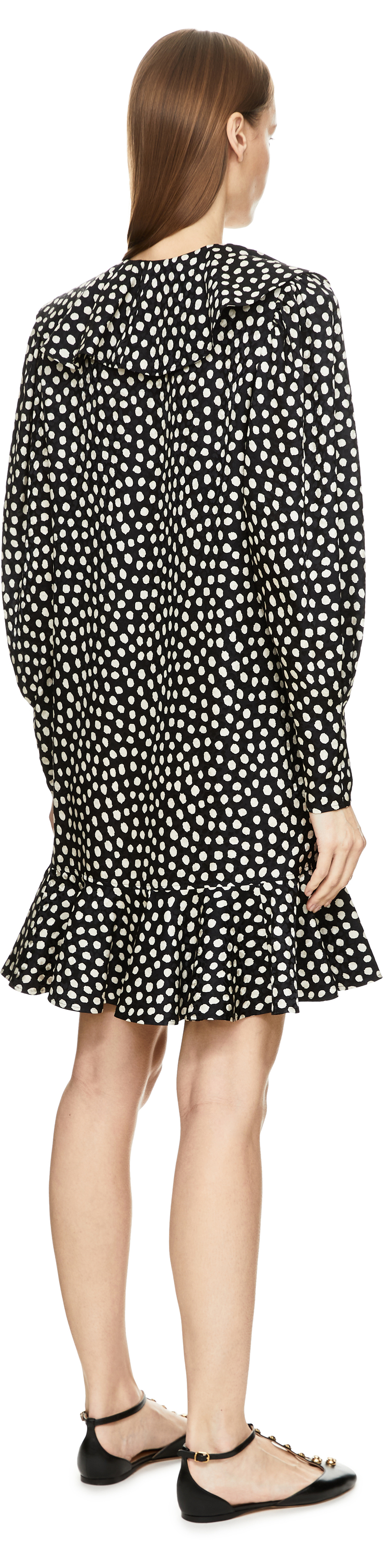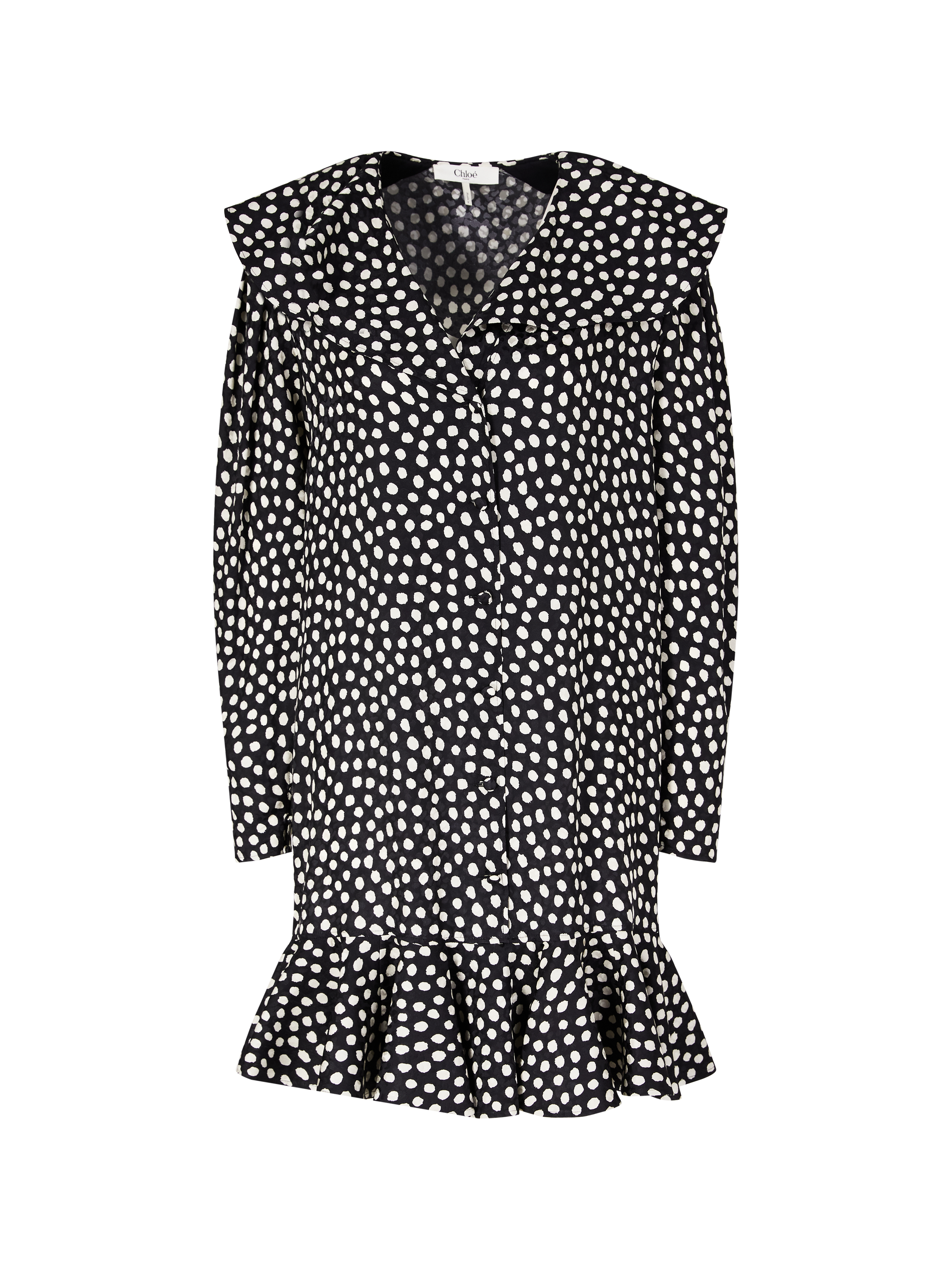 Dieses Kleid in Schwarz von Chloé wurde aus Seidenjacquard gefertigt und besticht durch das gepunktete Muster. Die fließende Silhouette umspielt sanft die Figur, der V-Ausschnitt, die Rüschen sowie die stoffbezogenen Knöpfe verleihen dem Modell Leichtigkeit und Raffinesse.