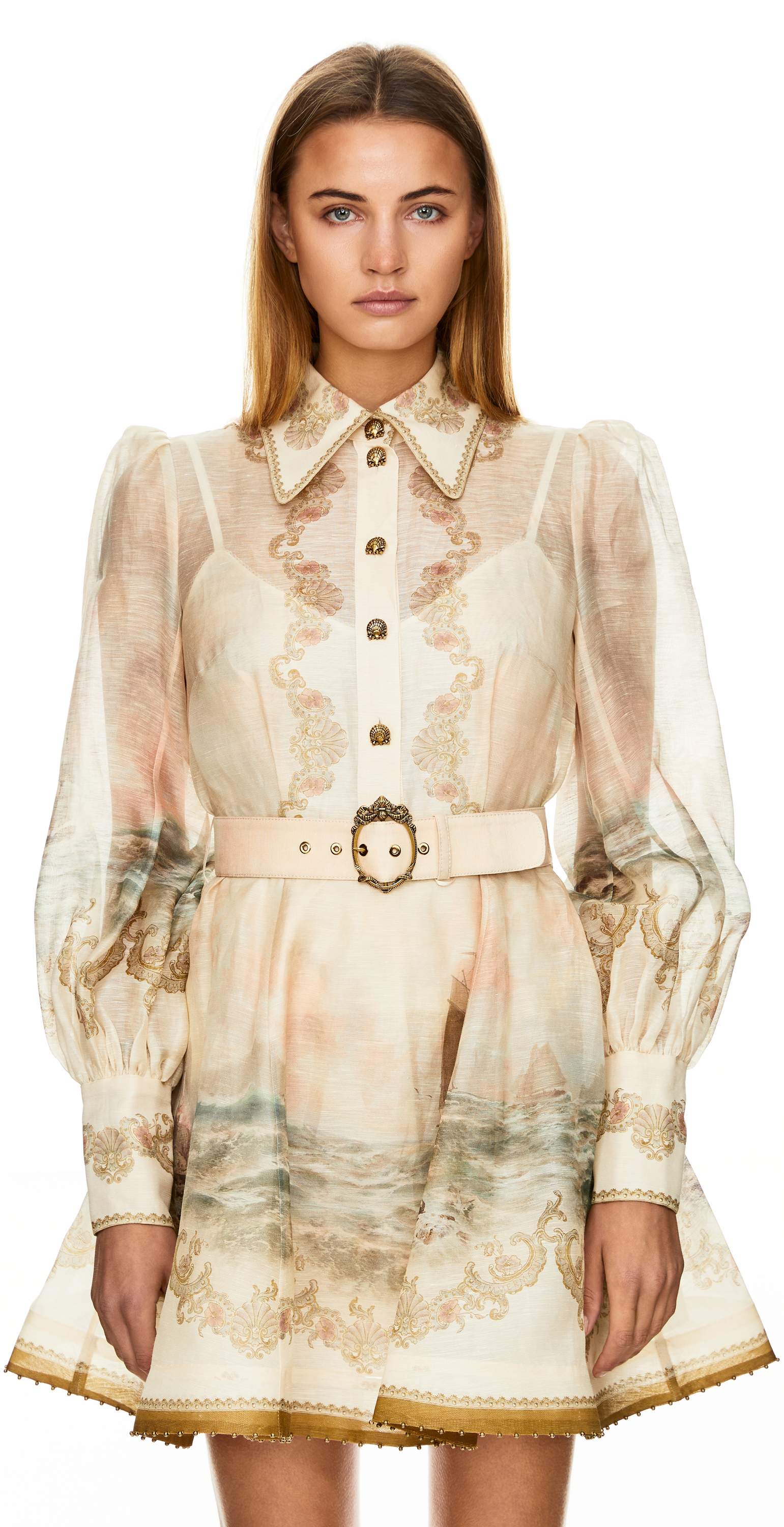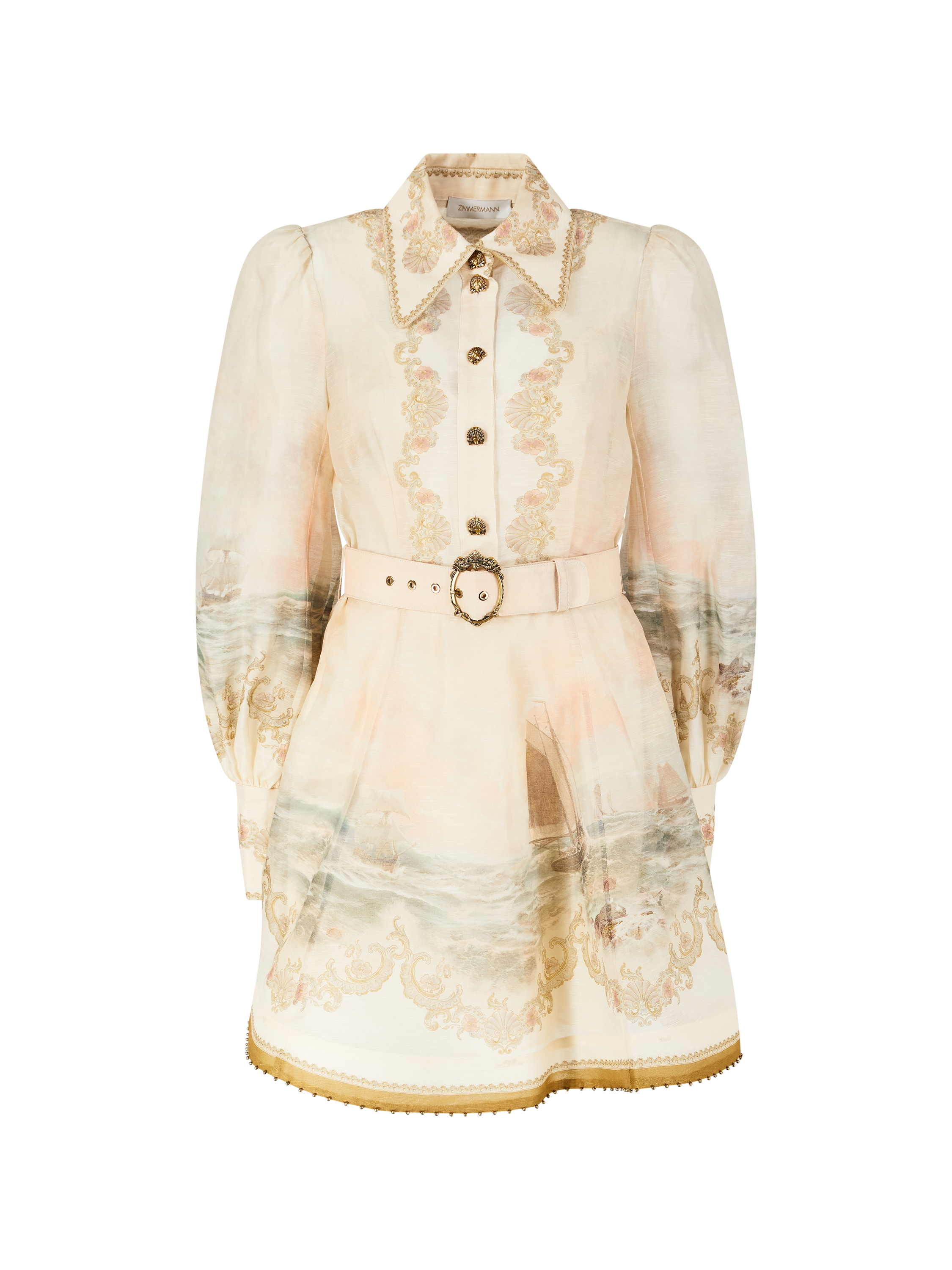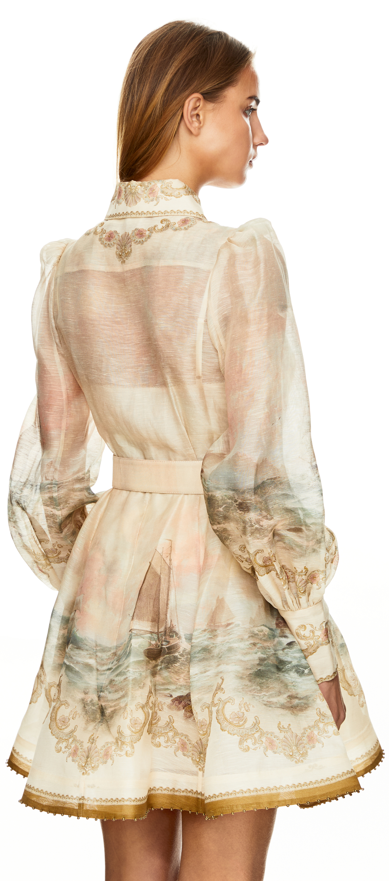Das Kleid 'Rebellion Marine' in Beige von Zimmermann wurde aus einer Seiden-Leinenmischung gefertigt und besticht durch seinen femininen Fall. Bauschige Ärmel, der abnehmbare Taillengürtel sowie der Perlenbesatz mit Rouleau-Verzierung am Saum setzen elegante Akzente und machen das Modell zu einem echten Hingucker.