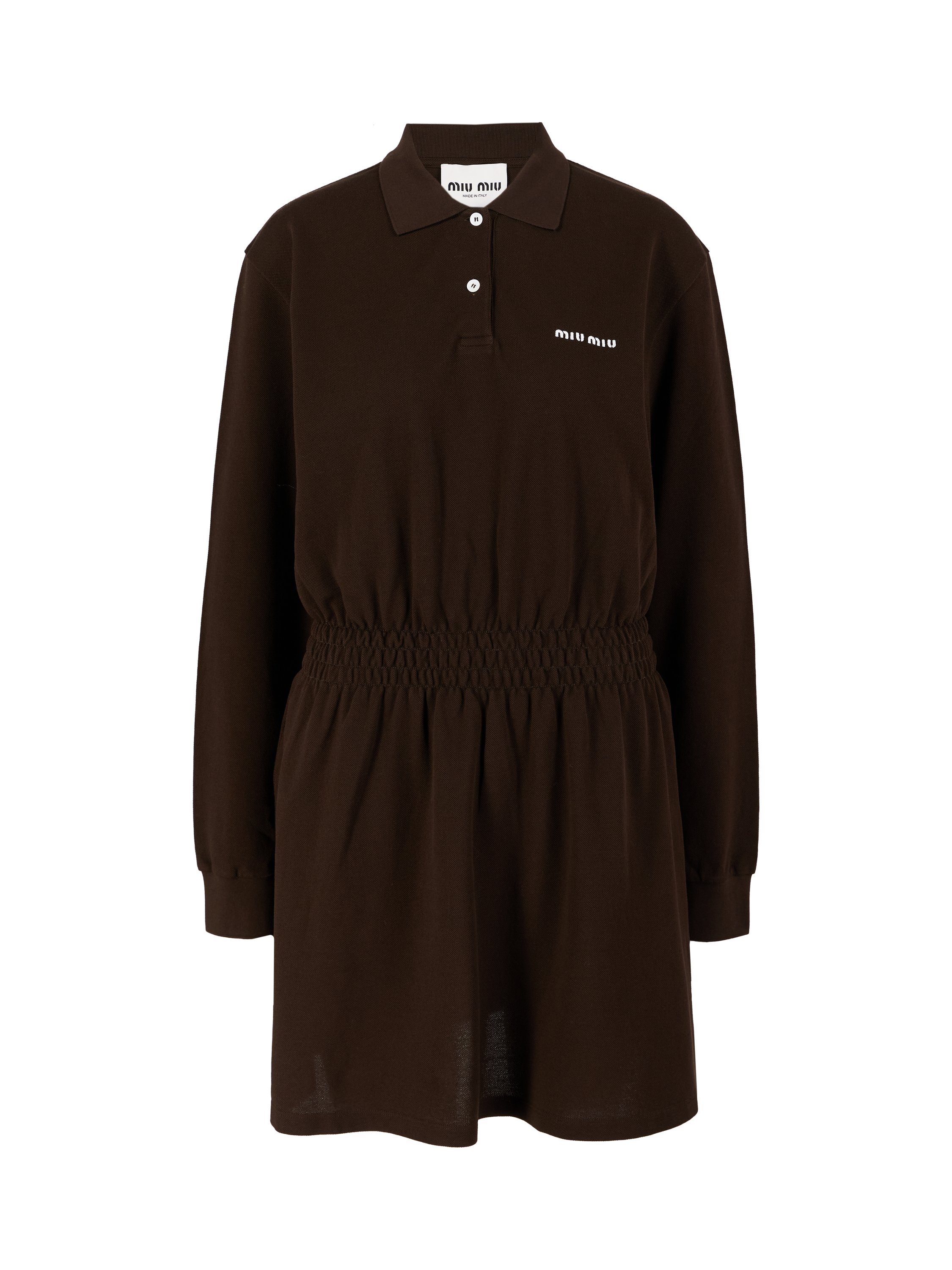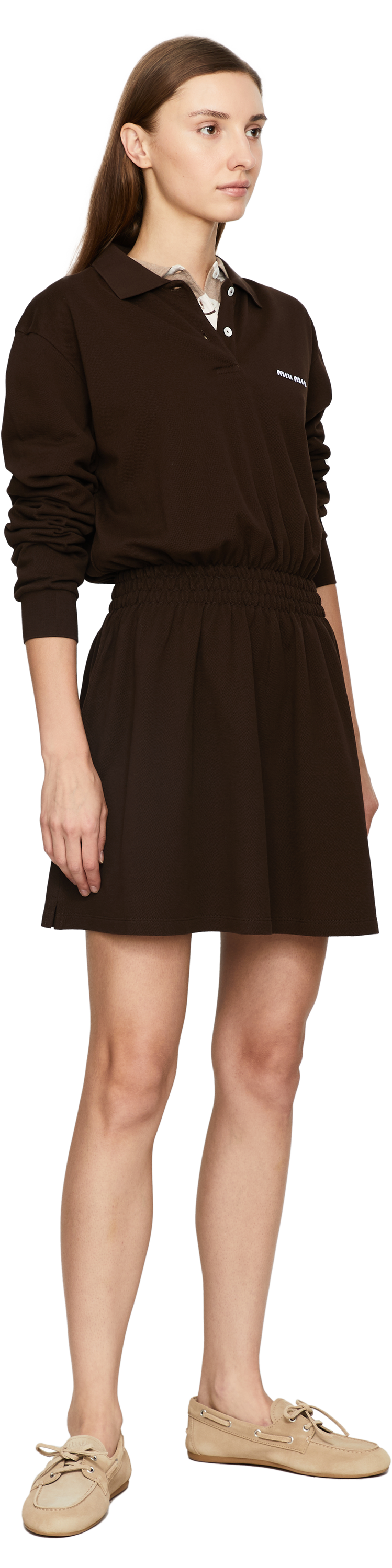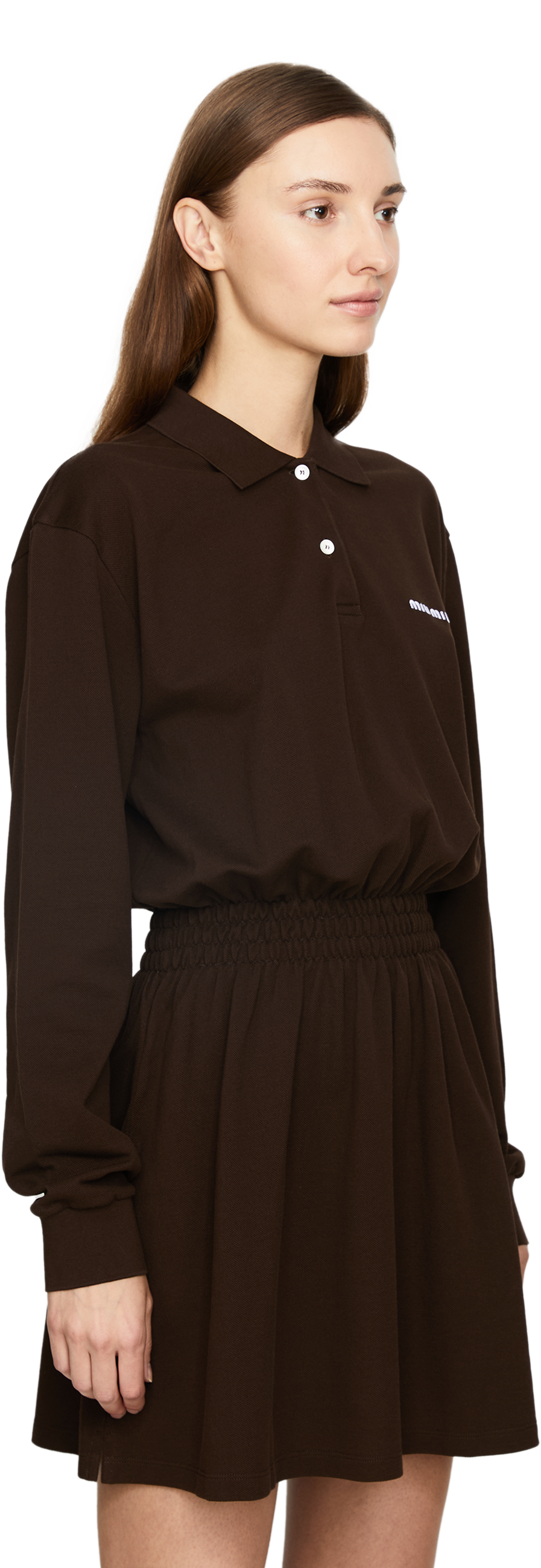 Dieses Kleid in Braun von miu miu wurde aus Baumwolle gefertigt und besticht durch die geraffte Taille. Die taillierte Silhouette geht über in einen leicht ausgestellten Rock. Der Polokragen und das Sticklogo zeichnen dieses moderne Modell aus.
