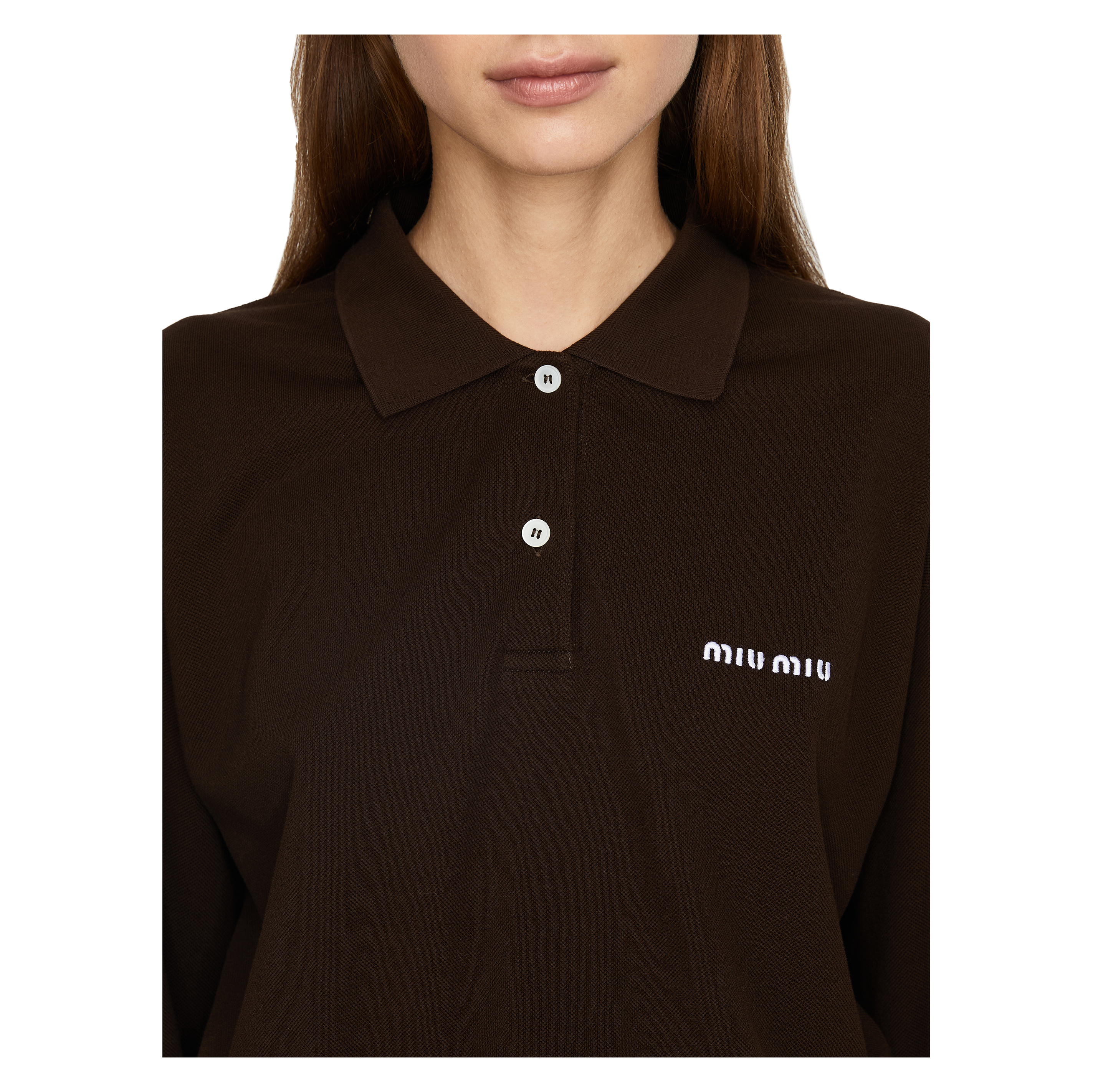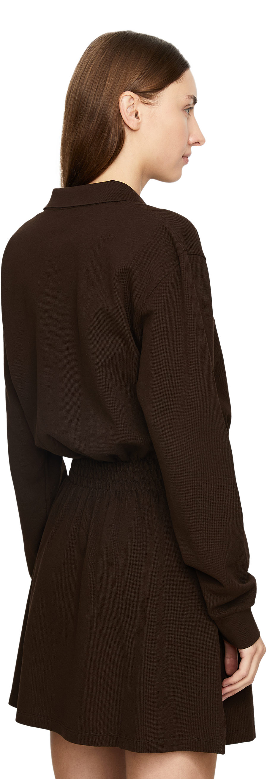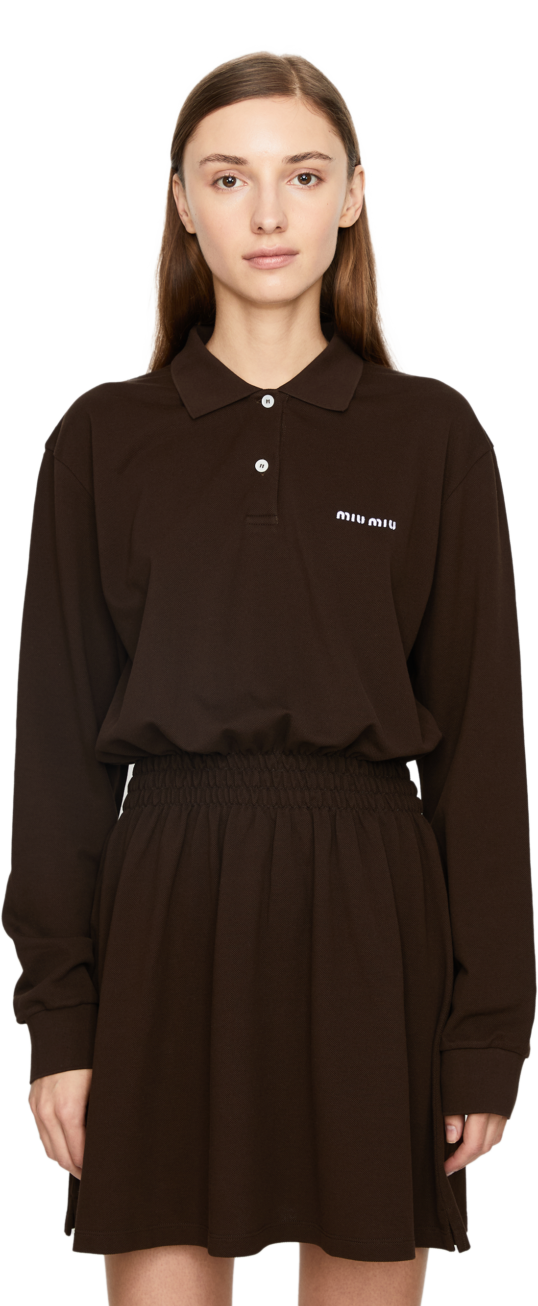 Dieses Kleid in Braun von miu miu wurde aus Baumwolle gefertigt und besticht durch die geraffte Taille. Die taillierte Silhouette geht über in einen leicht ausgestellten Rock. Der Polokragen und das Sticklogo zeichnen dieses moderne Modell aus.