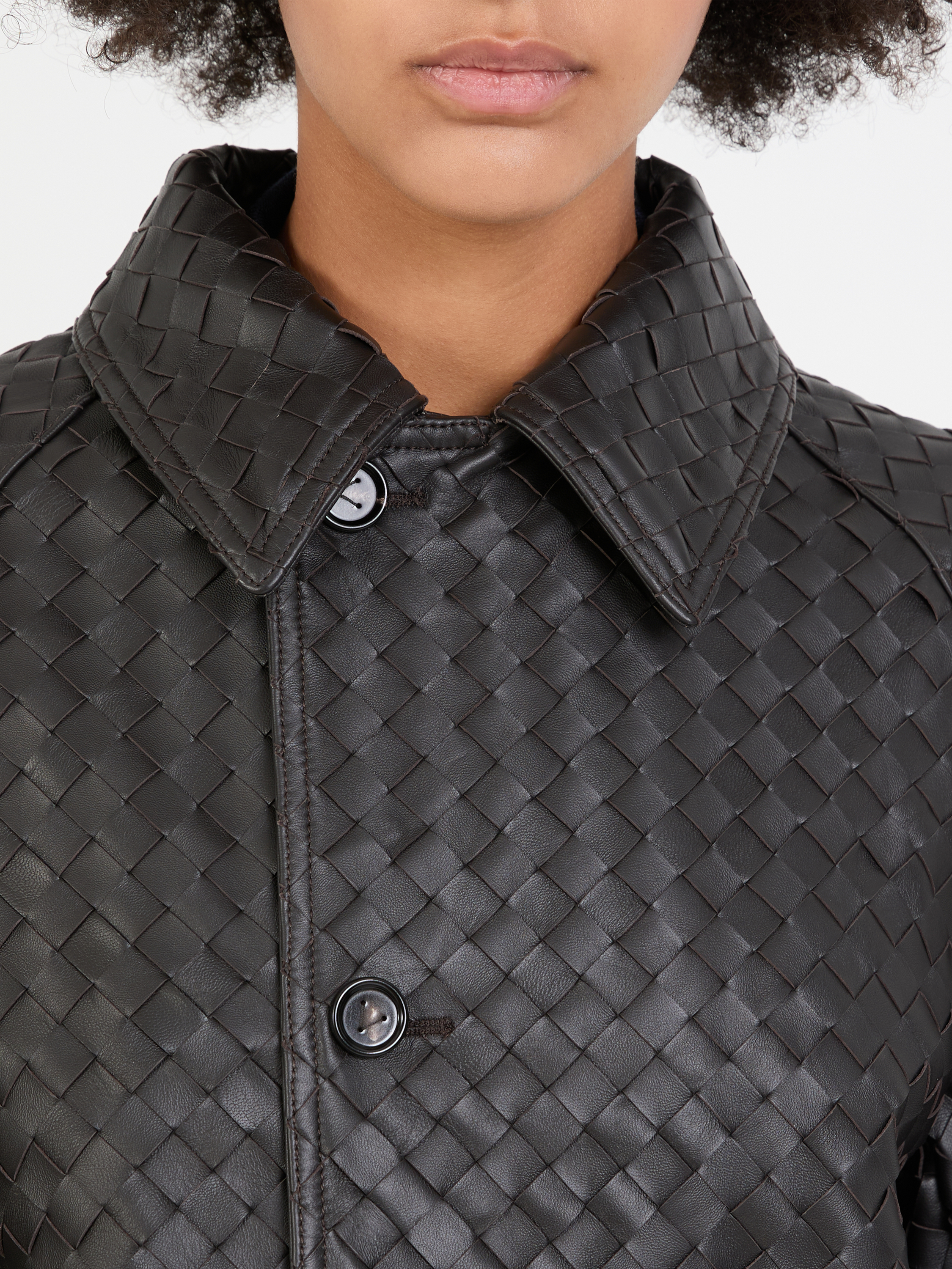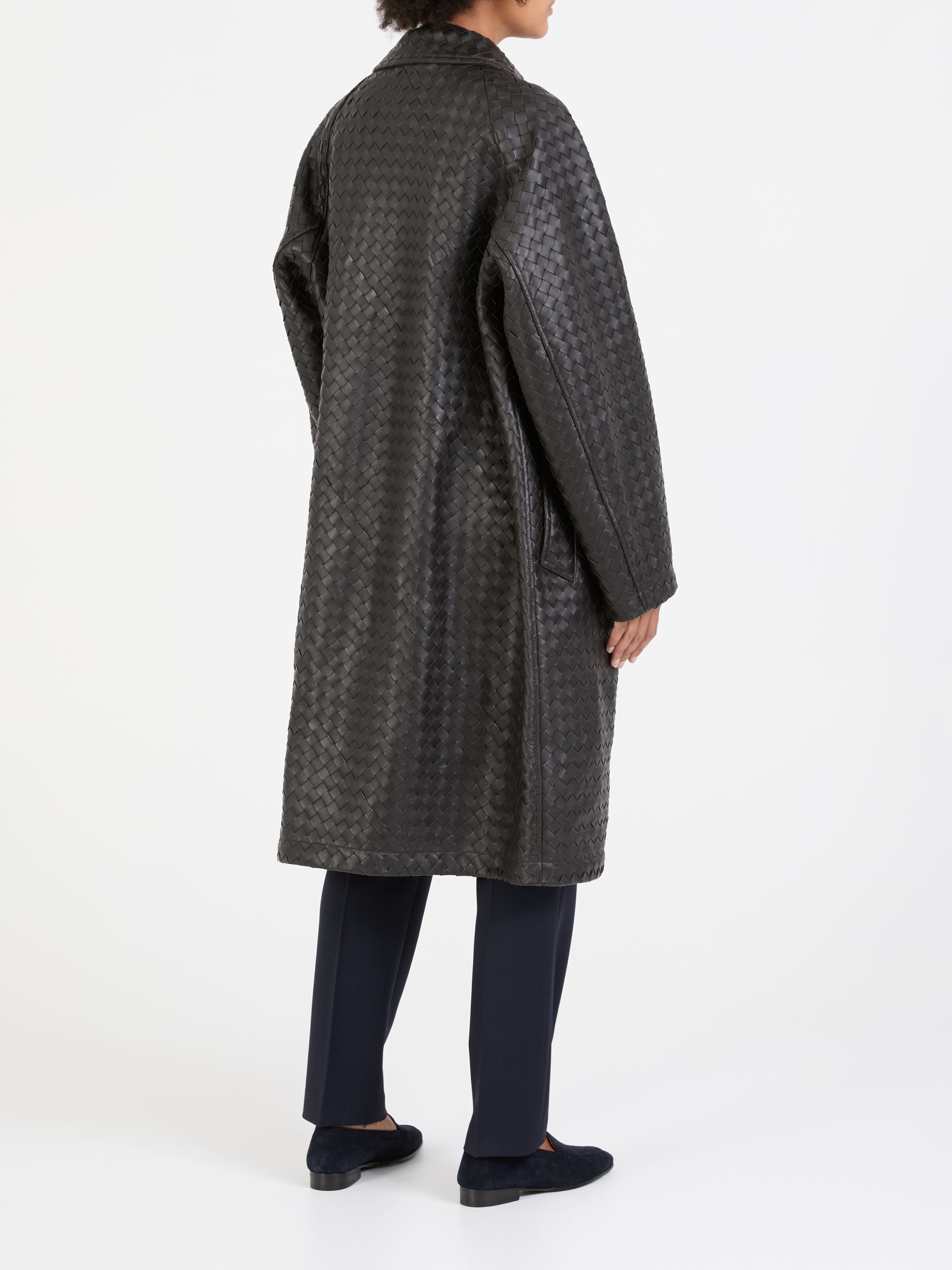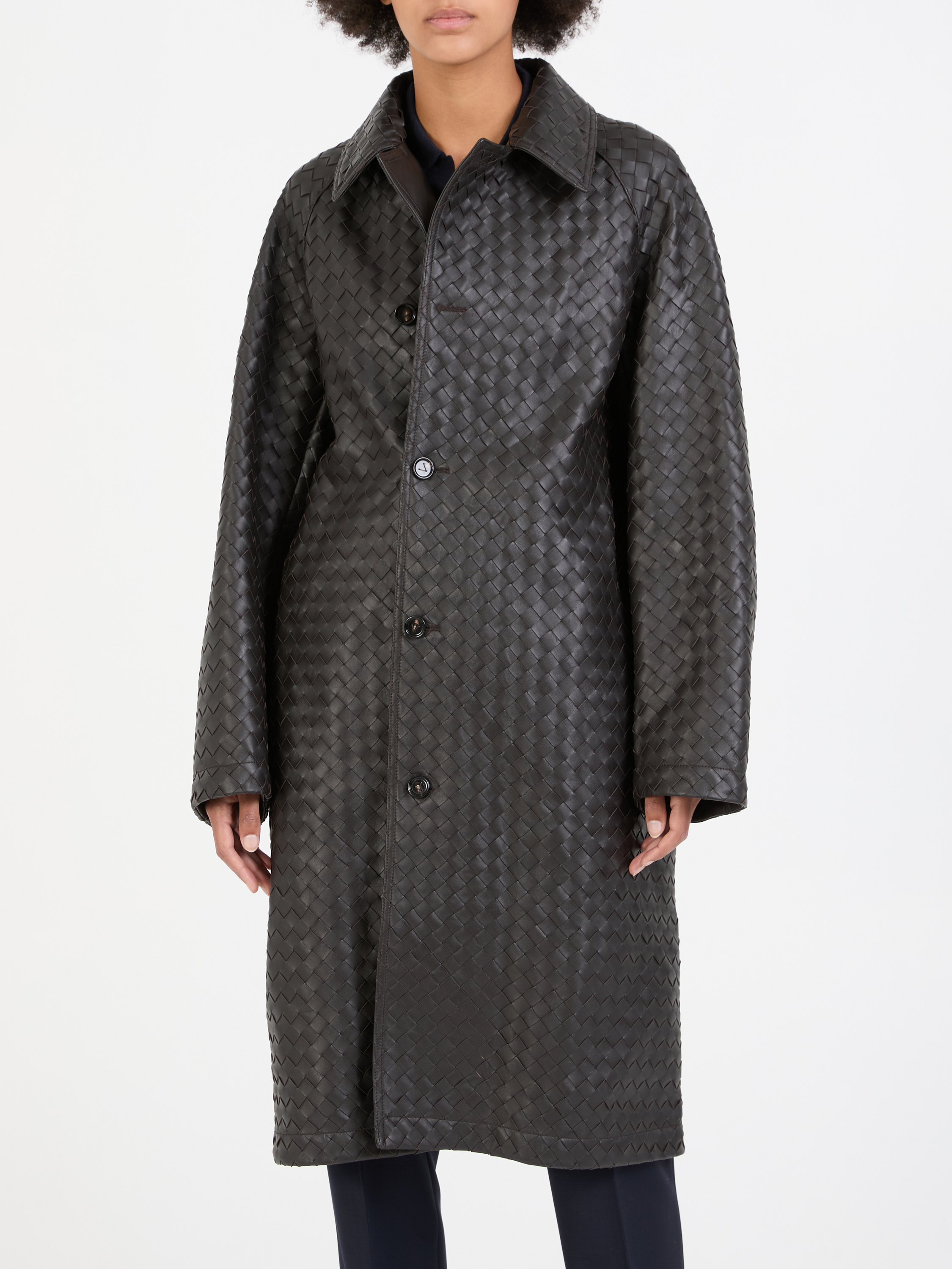 Dieser Ledermantel in Dunkelbraun von Bottega Veneta wurde aus hochwertigem Leder gefertigt und besticht durch die markentypische Flechttechnik. Die seitlichen Eingriffstaschen und die Raglanärmel machen das Design zu einem echten Hingucker.
