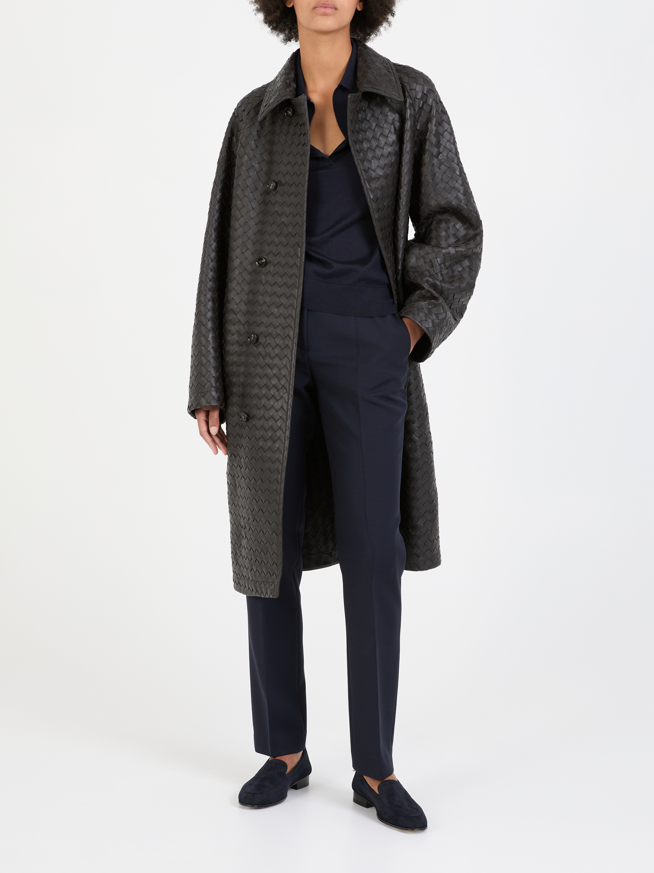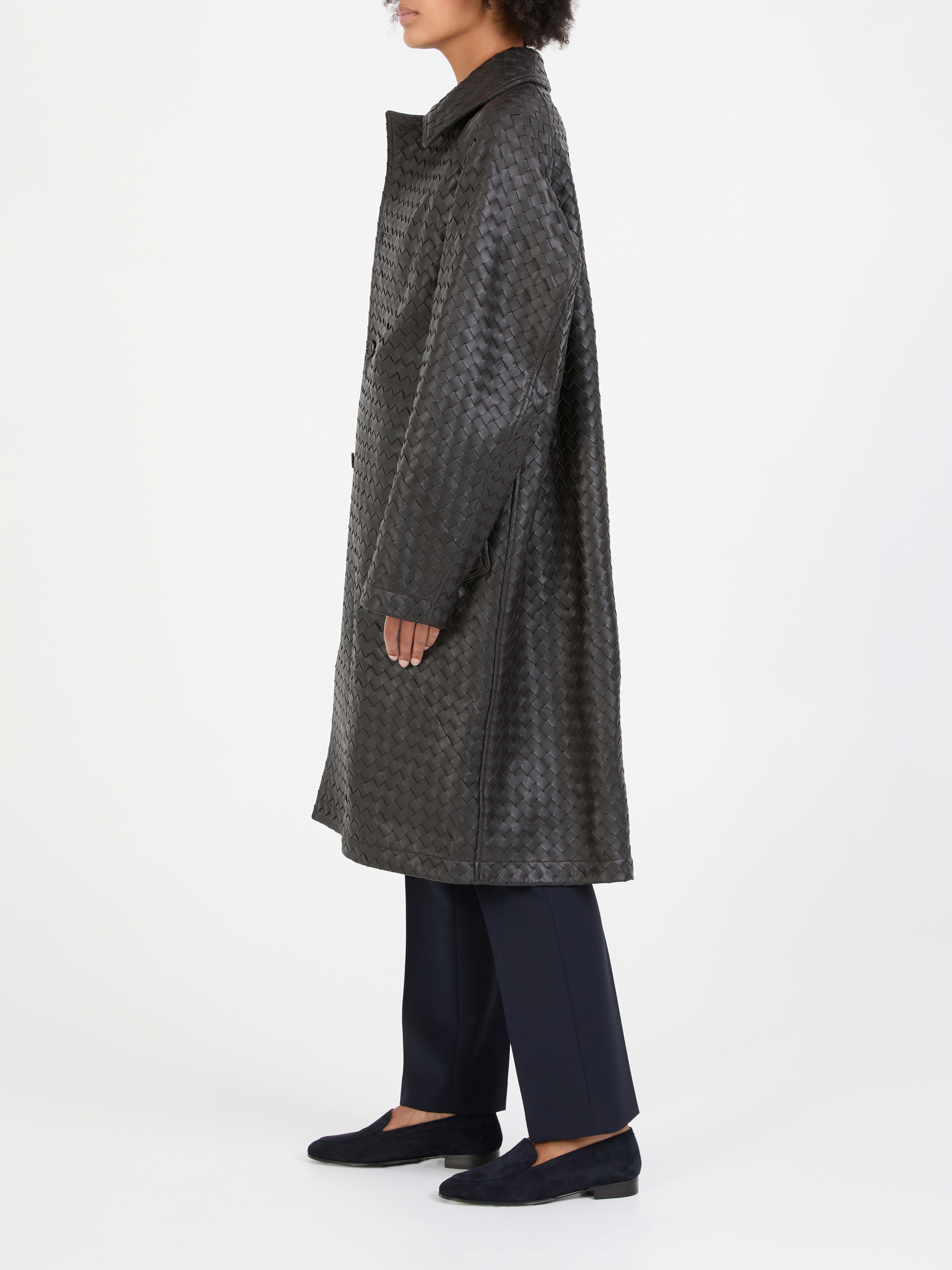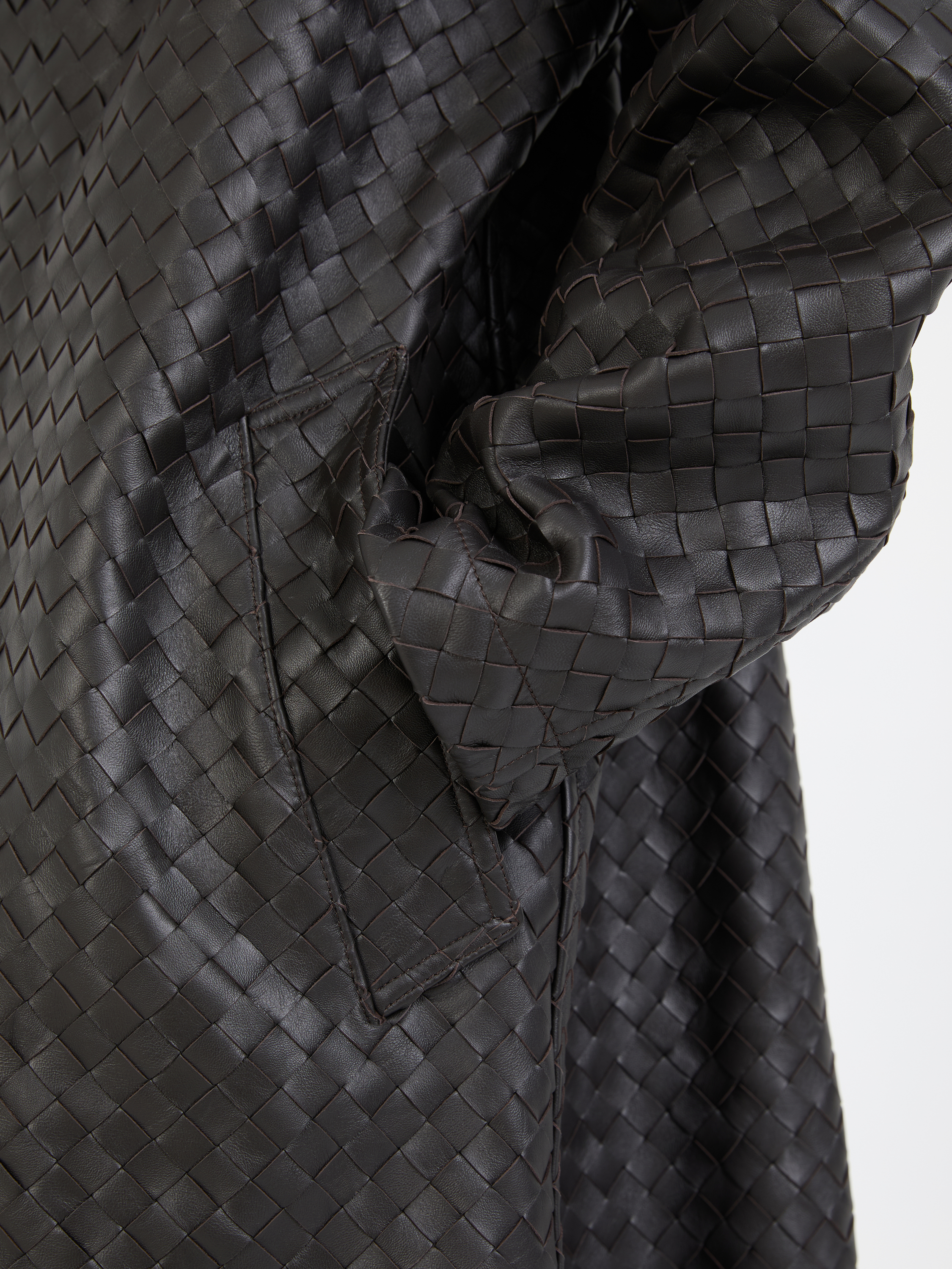Dieser Ledermantel in Dunkelbraun von Bottega Veneta wurde aus hochwertigem Leder gefertigt und besticht durch die markentypische Flechttechnik. Die seitlichen Eingriffstaschen und die Raglanärmel machen das Design zu einem echten Hingucker.