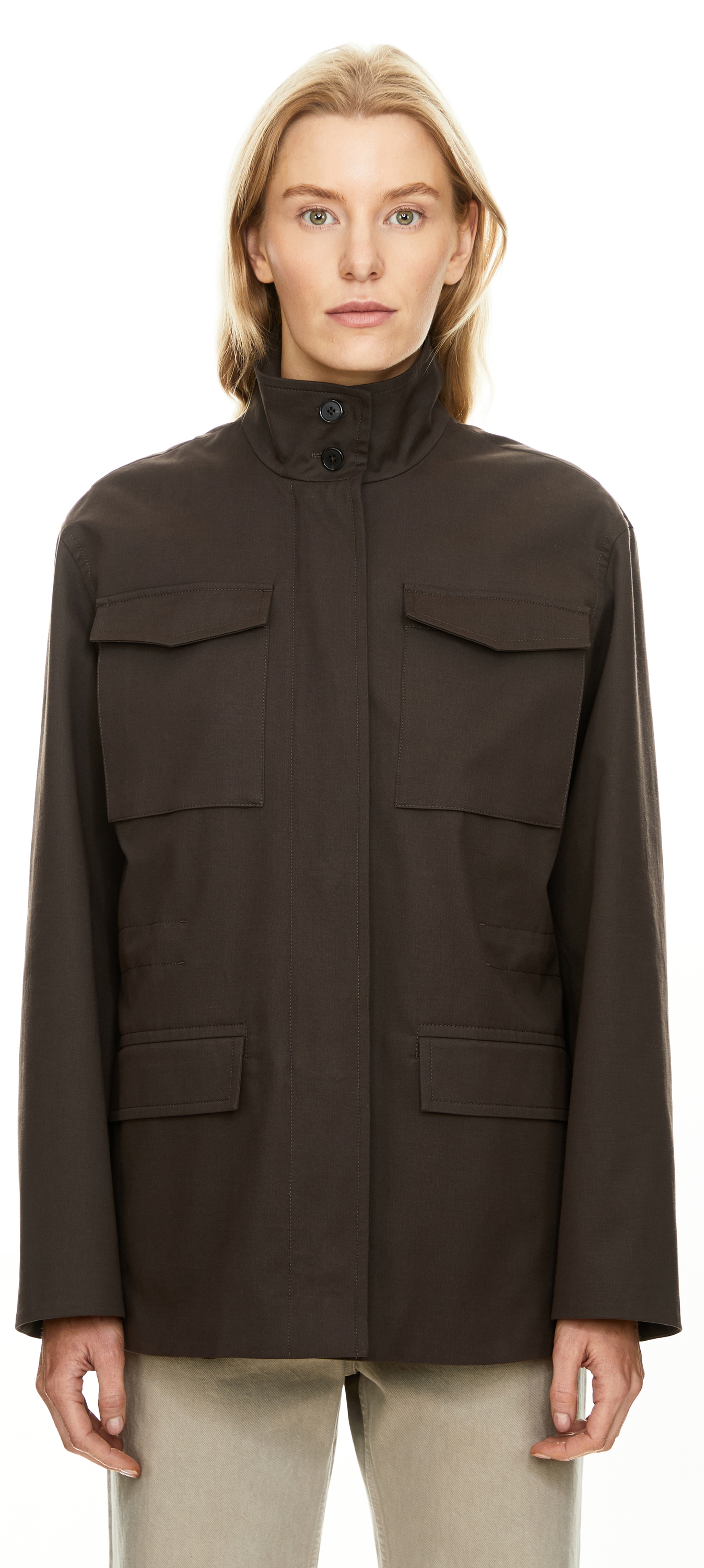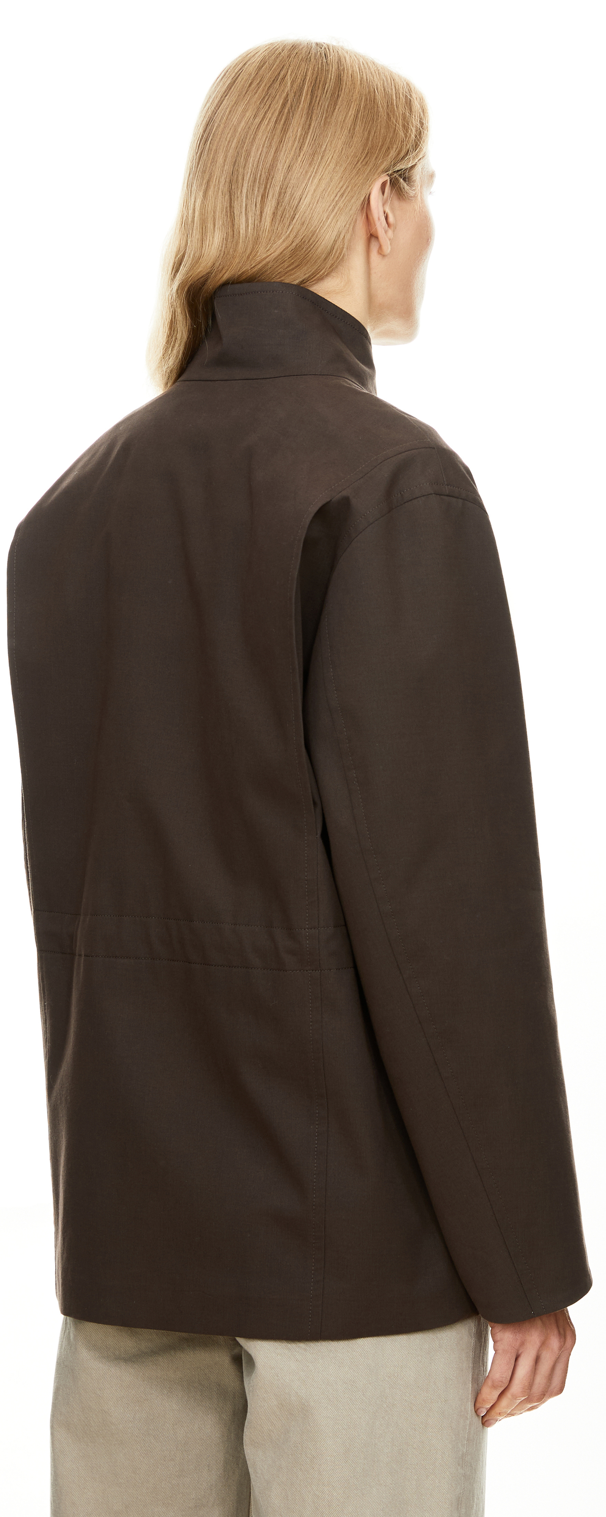 Die Jacke 'Floriane' in Braun von The Row wurde aus einer hochwertigen Baumwoll-Cashmere-Mischung gefertigt und besticht durch vier Pattentaschen auf der Vorderseite. Das Modell verfügt über einen Reißverschluss, der von der frontalen Knopfleiste aus tonalen Hornknöpfen verdeckt wird. Ein innenliegender Kordelzug an der Taille ermöglicht das Anpassen der Silhouette und rundet das Modell harmonisch ab.
