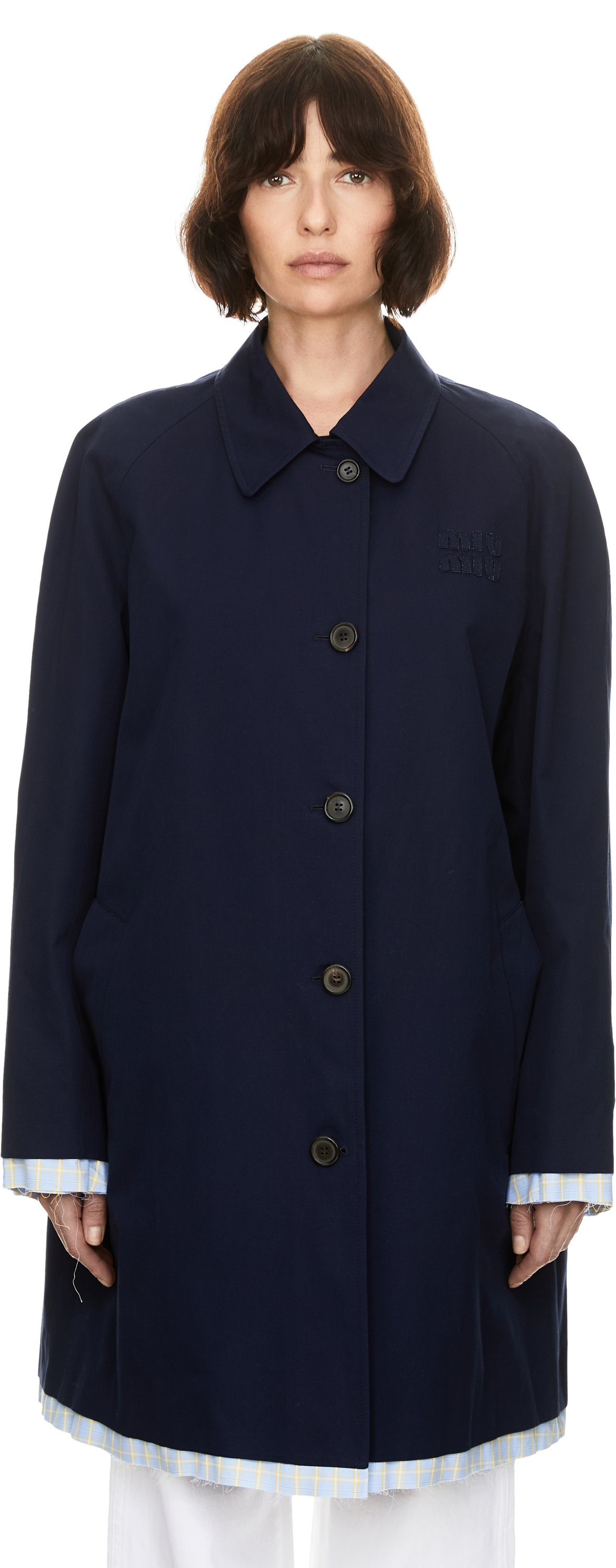 Dieser Mantel in Marineblau von miu miu wurde aus Baumwolle gefertigt und besticht durch die gerade Passform. Der klassische Reverskragen, die Knopfleiste auf der Vorderseite, die Ärmel mit Riemen und Knöpfen sowie die Popeline-Details mit Rohkantensaum verleihen dem Modell eine elegante Note. Das charakteristische Sticklogo auf der Brust sorgt für dezente Markenakzente und rundet den Mantel stilvoll ab.