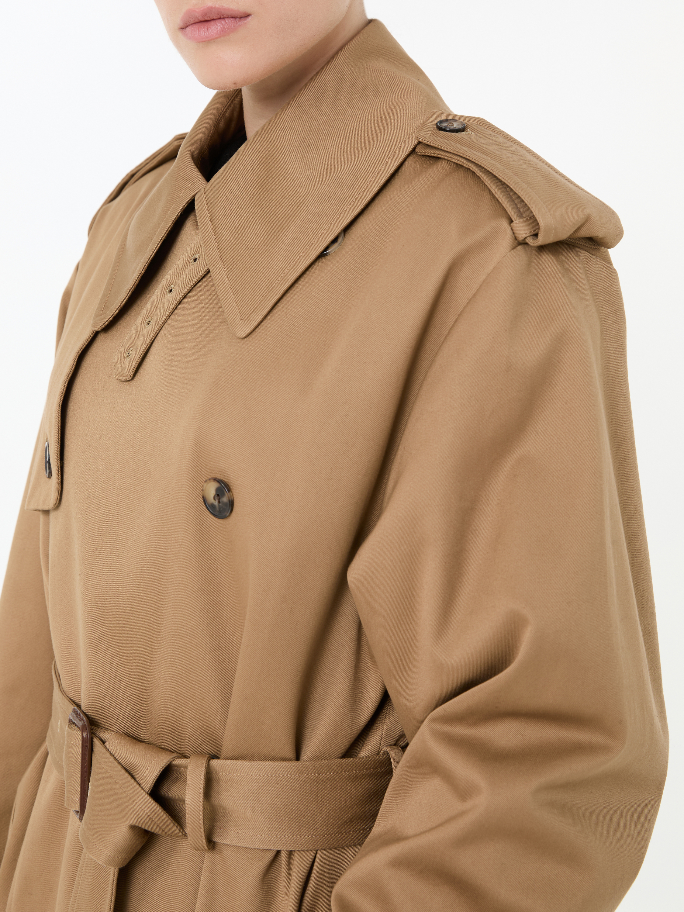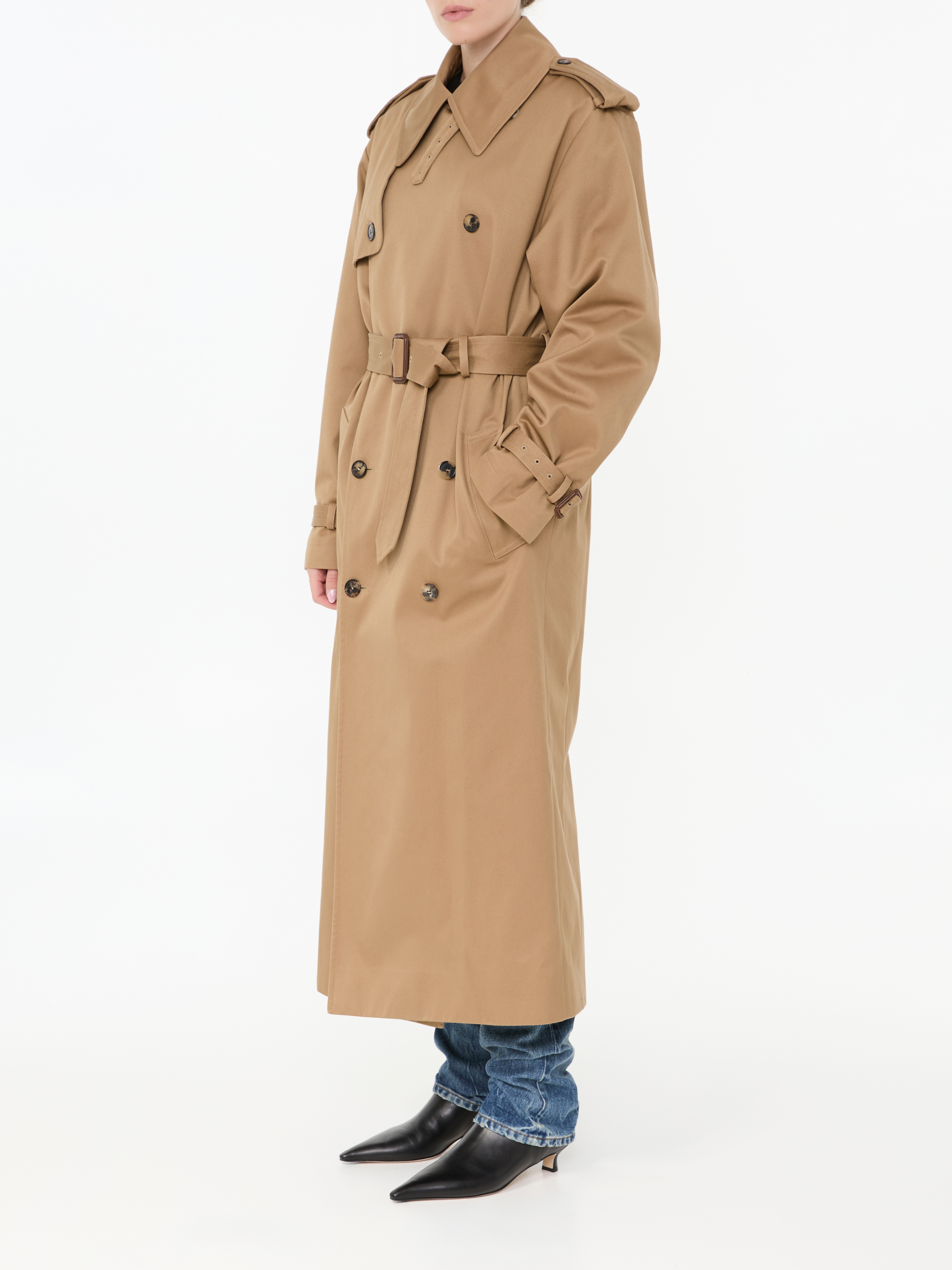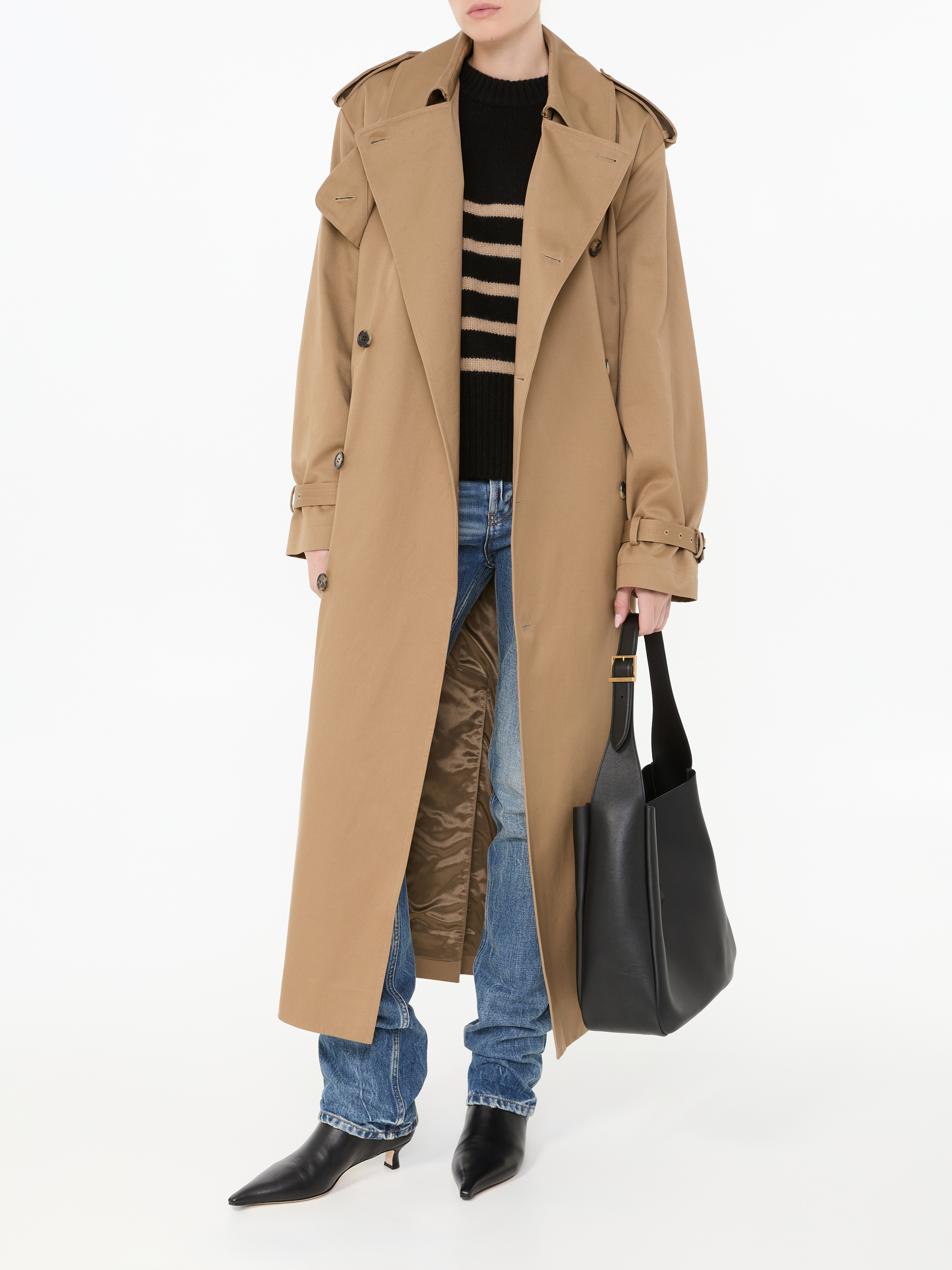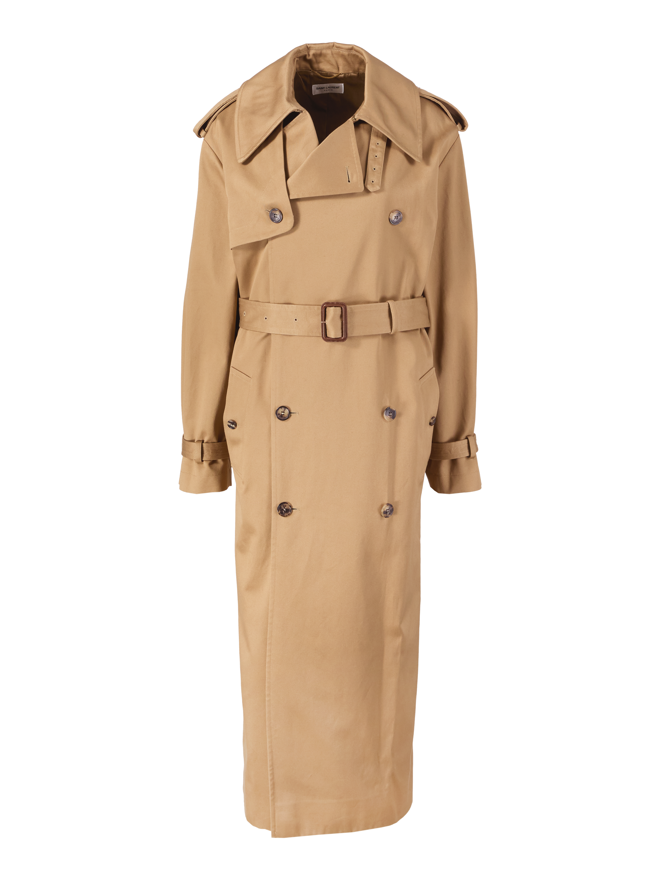 Dieser Trenchcoat in Beige von Saint Laurent wurde aus hochwertiger Baumwolle gefertigt und besticht durch den lässigen Schnitt und das klassische Design. Der Zwei-Wege-Ulster-Kragen und die oversized Passform zeichnen dieses hochwertige Modell aus. Die geknöpften Epauletten und der verstellbare Gürtel runden das Design gekonnt ab.