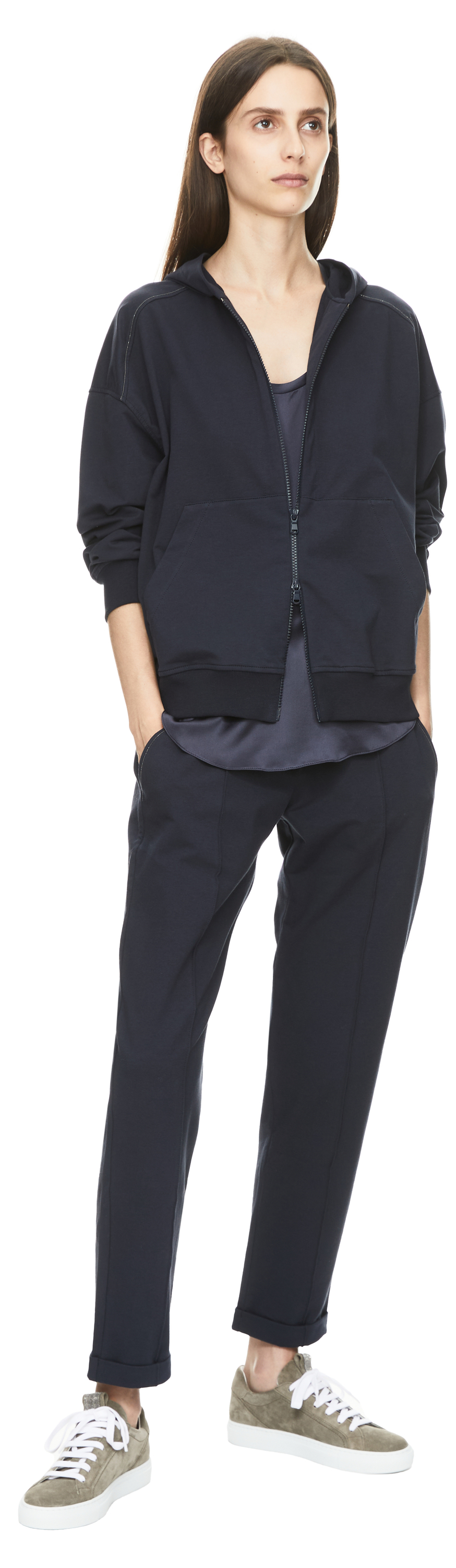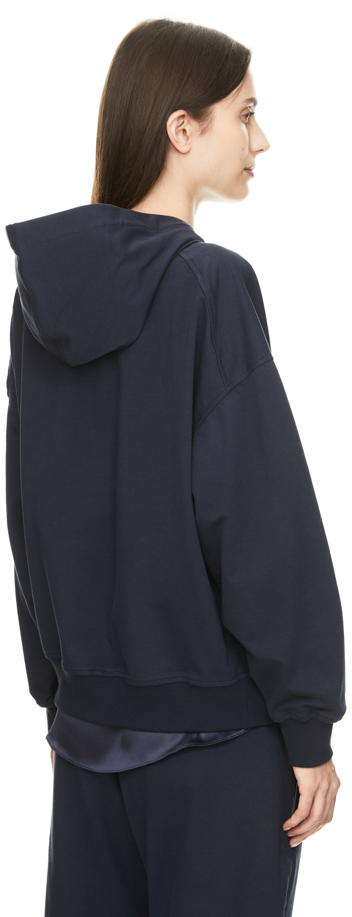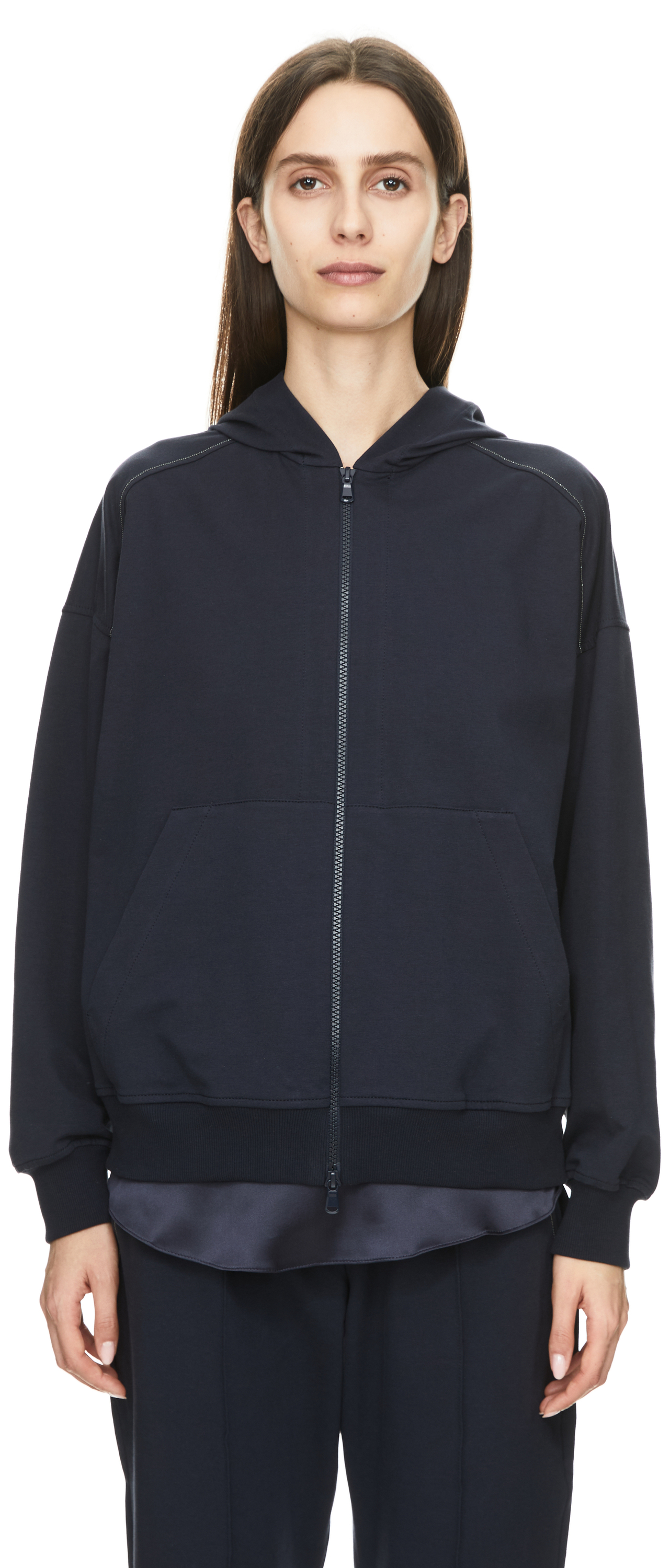 Diese Sweatjacke in Marineblau von Brunello Cucinelli wurde aus hochwertiger Baumwolle gefertigt und besticht durch die edlen Monili-Perlen entlang der Raglanärmel. Die lockere Passform, die überschnittenen Schultern sowie die Kängurutasche verleihen dem Modell eine sportlich-lässige Note. Rippstrickbündchen und eine Kapuze mit Zwei-Wege-Reißverschluss runden das Design ab.