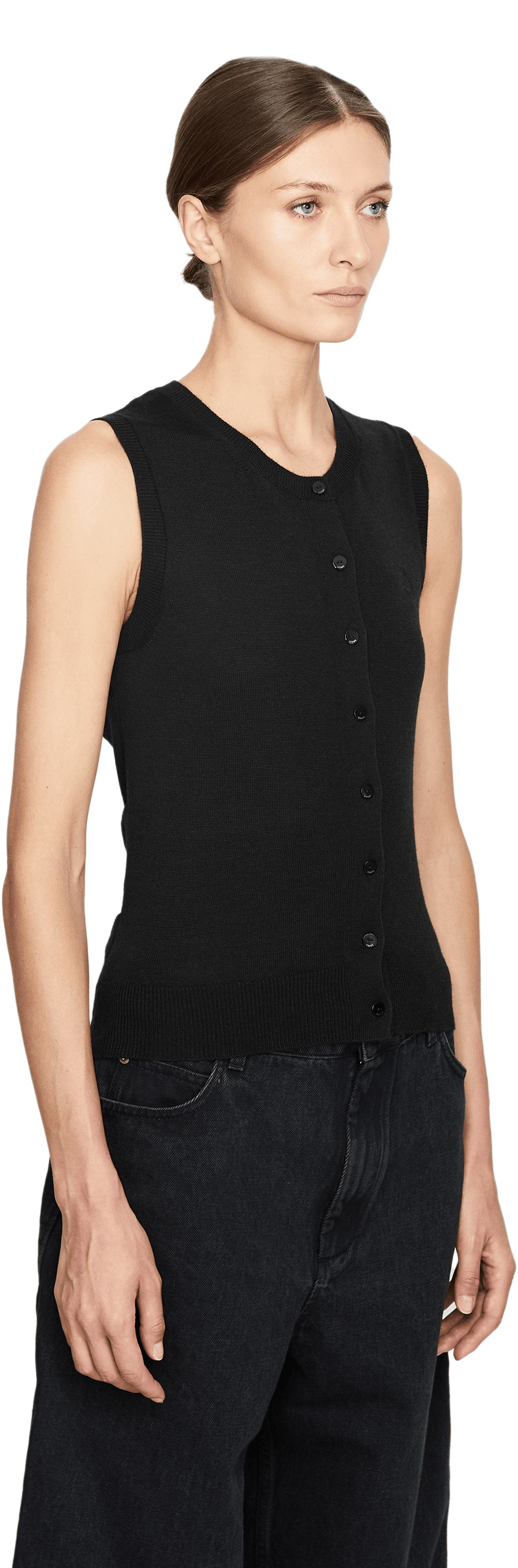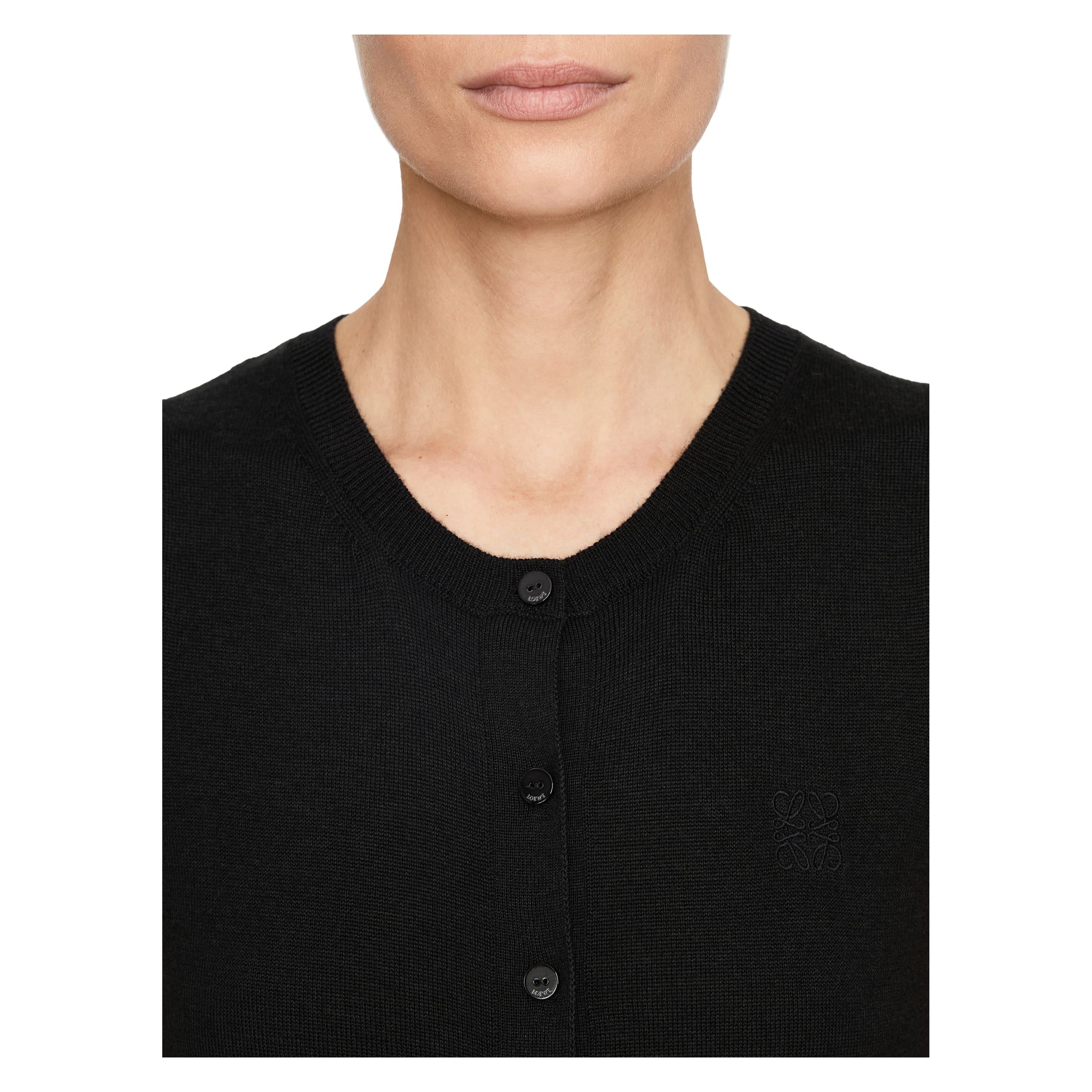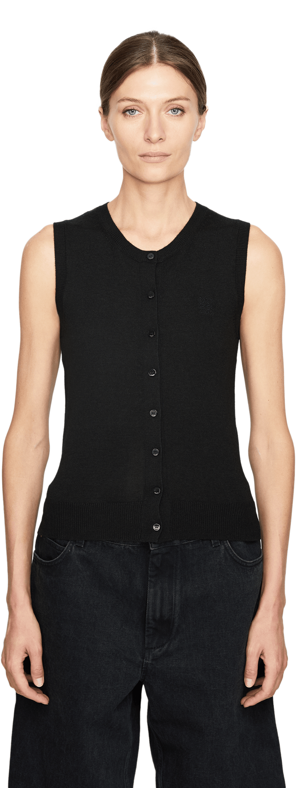 Diese Weste in Schwarz von LOEWE wurde aus einer hochwertigen Cashmere-Seidenmischung gefertigt und besticht durch die Anagram Stickerei auf der Brust. Die schmale Passform, die einreihige Knopfleiste mit Logo-Prägung und die Raffungen an den Seiten zeichnen das Design aus.