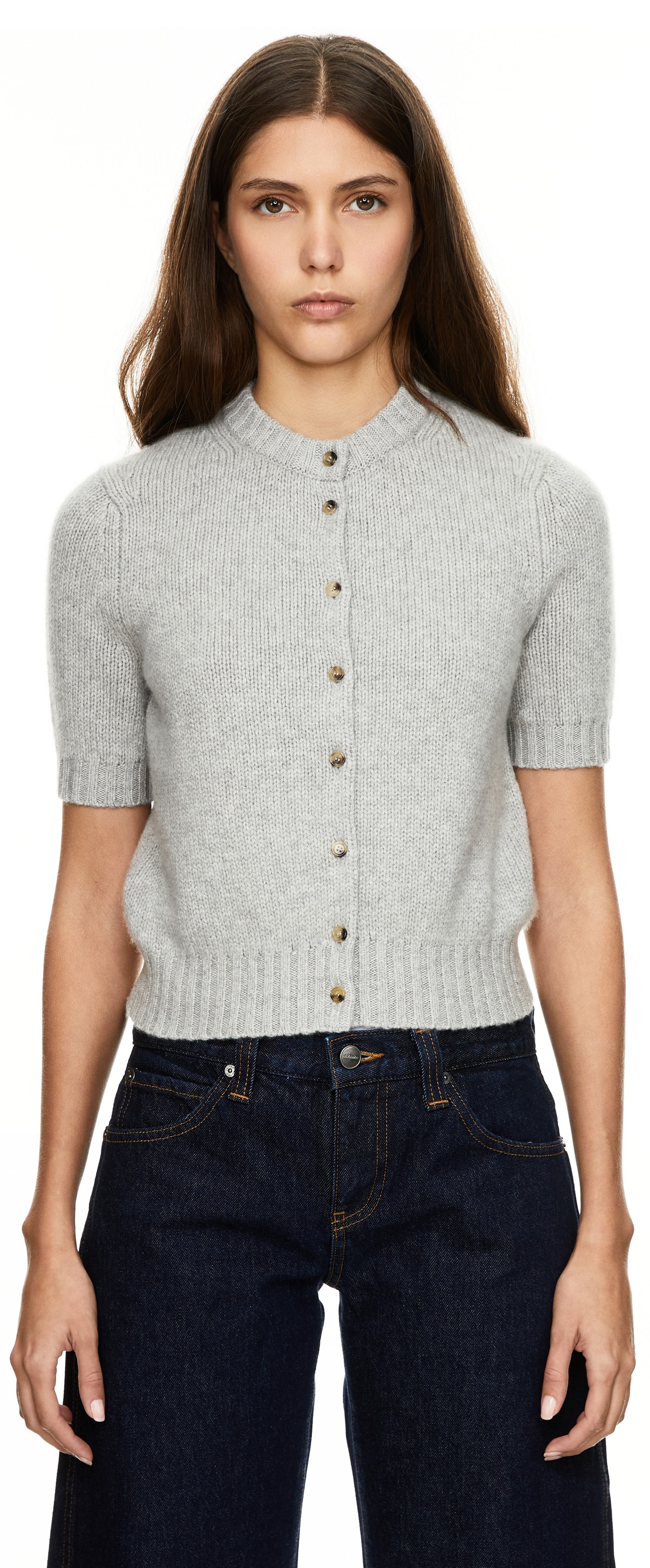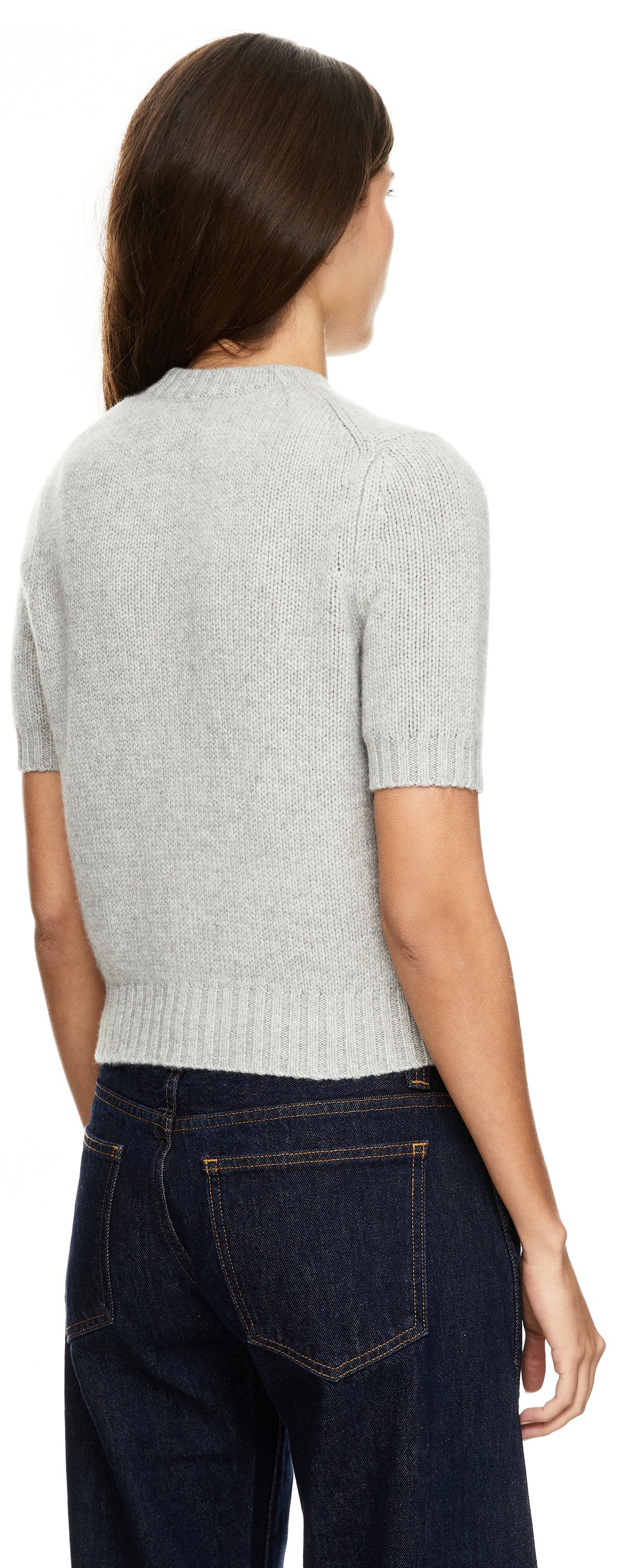Die Strickjacke 'Nora' in Hellgrau von Khaite wurde aus einer hochwertigen Cashmere-Mischung gefertigt und besticht durch die dezenten Puffärmel. Die verkürzte Passform verleiht dem Modell einen modernen Look, während der Rundhalsausschnitt und die Rippstrickbündchen klassische Akzente setzen.