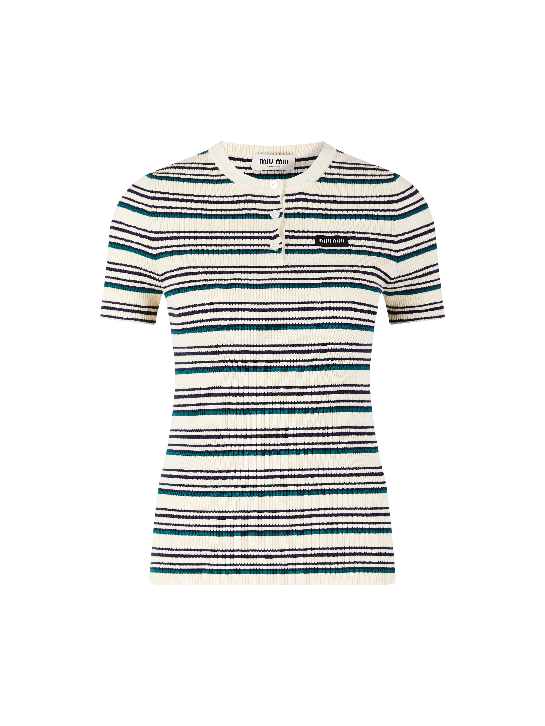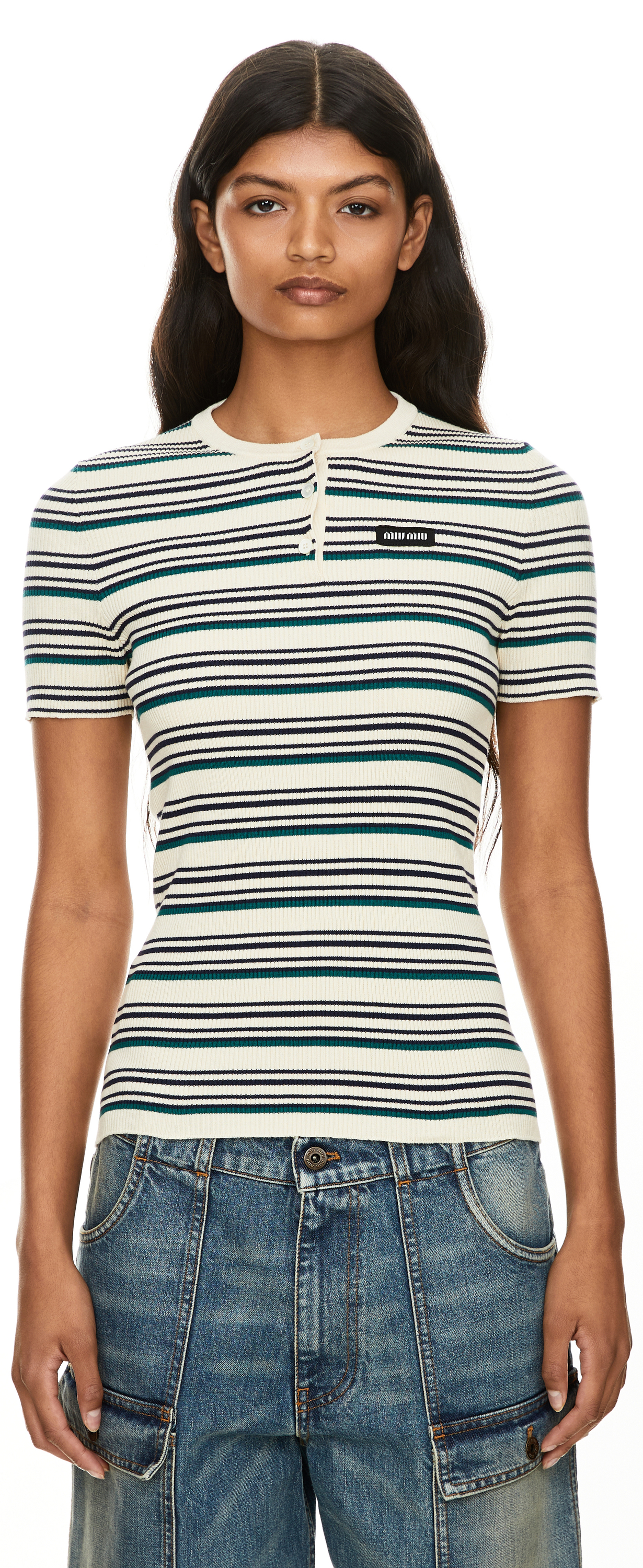 Dieser Pullover in Beige von miu miu wurde aus Baumwolle gefertigt und besticht durch das Streifenmuster. Der runde Ausschnitt, die kurze Knopfleiste, die kurzen Ärmel und der gerippte Strick verleihen dem Design eine elegante Note. Eine Logo-Applikation auf der Brust vollendet dieses hochwertige Design.